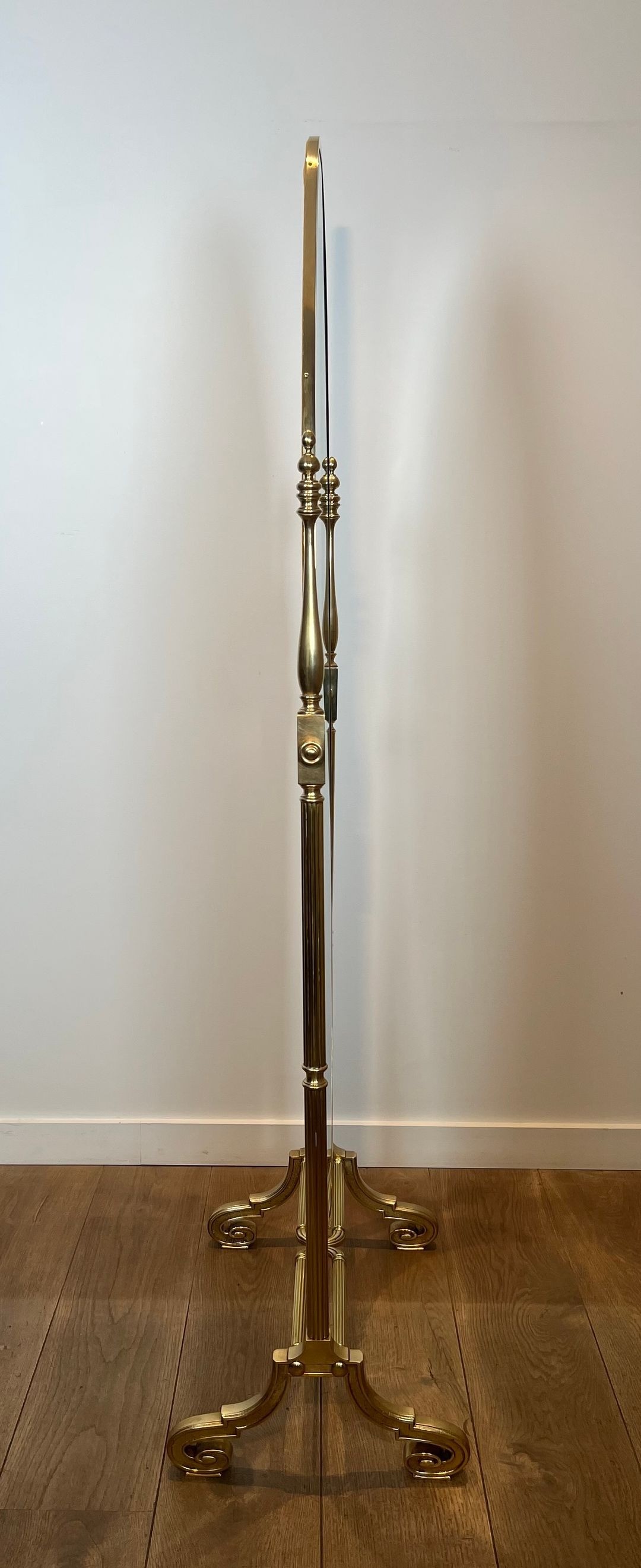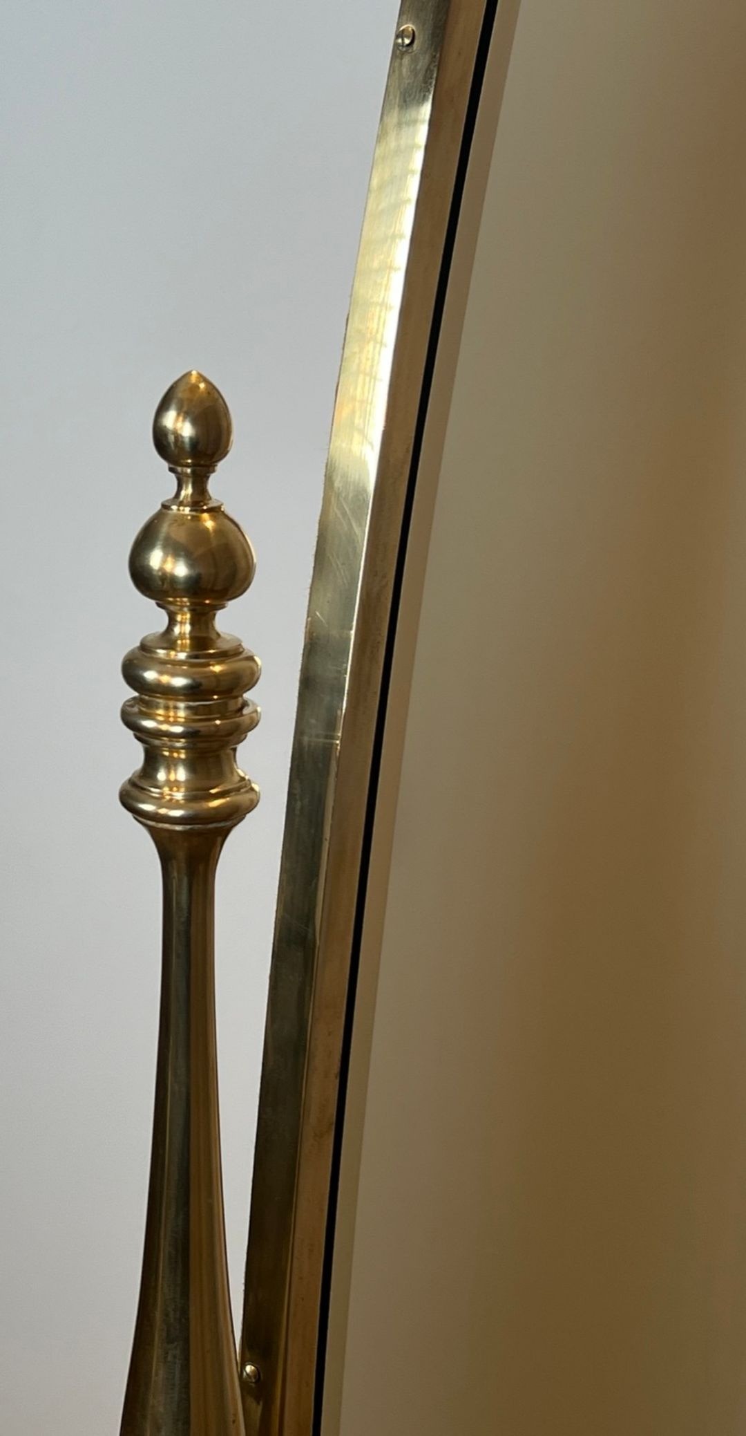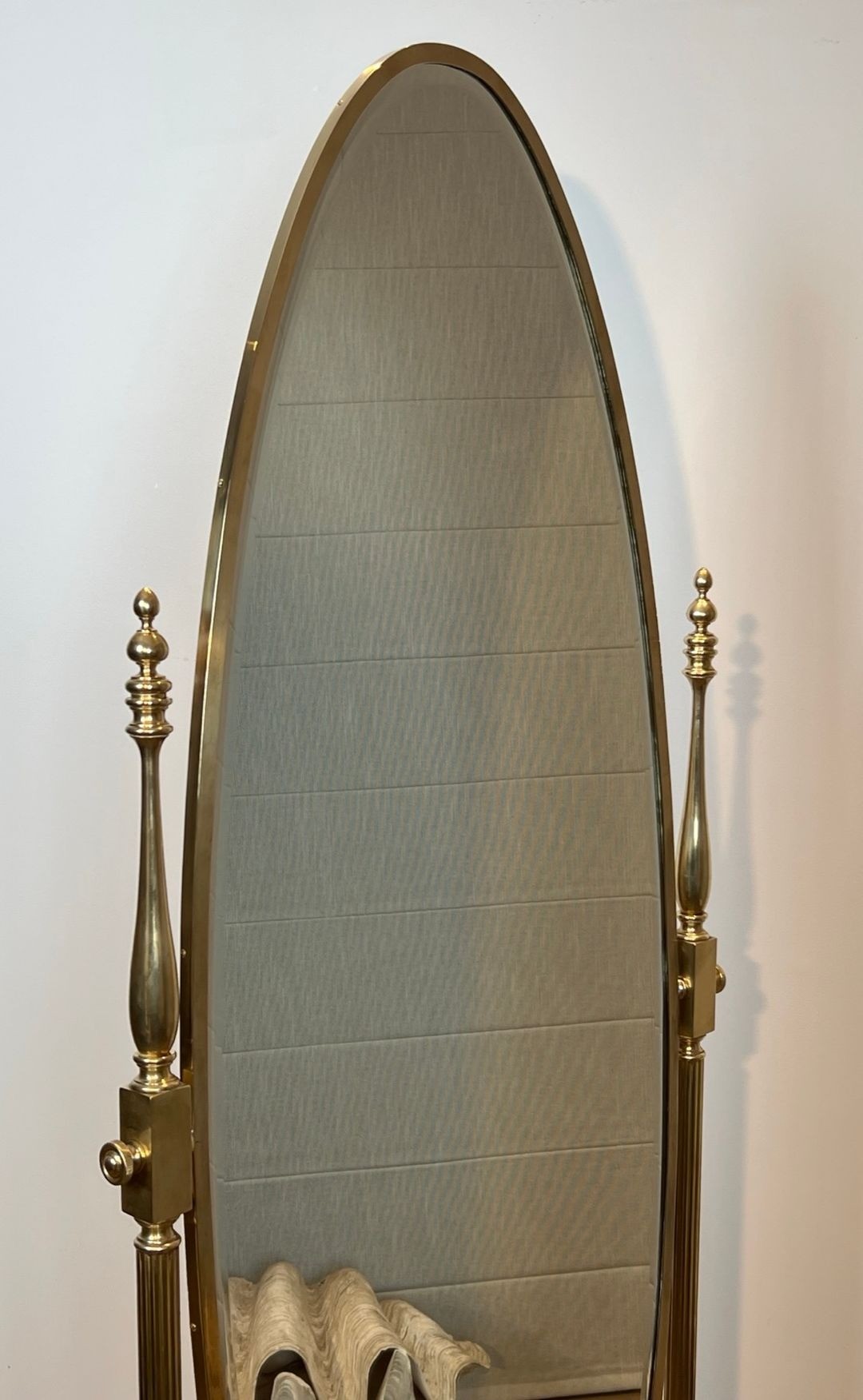Large full-length psyché mirror in the Empire style, the oval mirror plate in a gilt brass frame mounted on a tilting pivot between two richly decorated bronze and brass uprights with classical ornamental mounts, on a splayed base. French work, circa 1880. Dimensions: 69.5 × 42 × 180.5 cm.