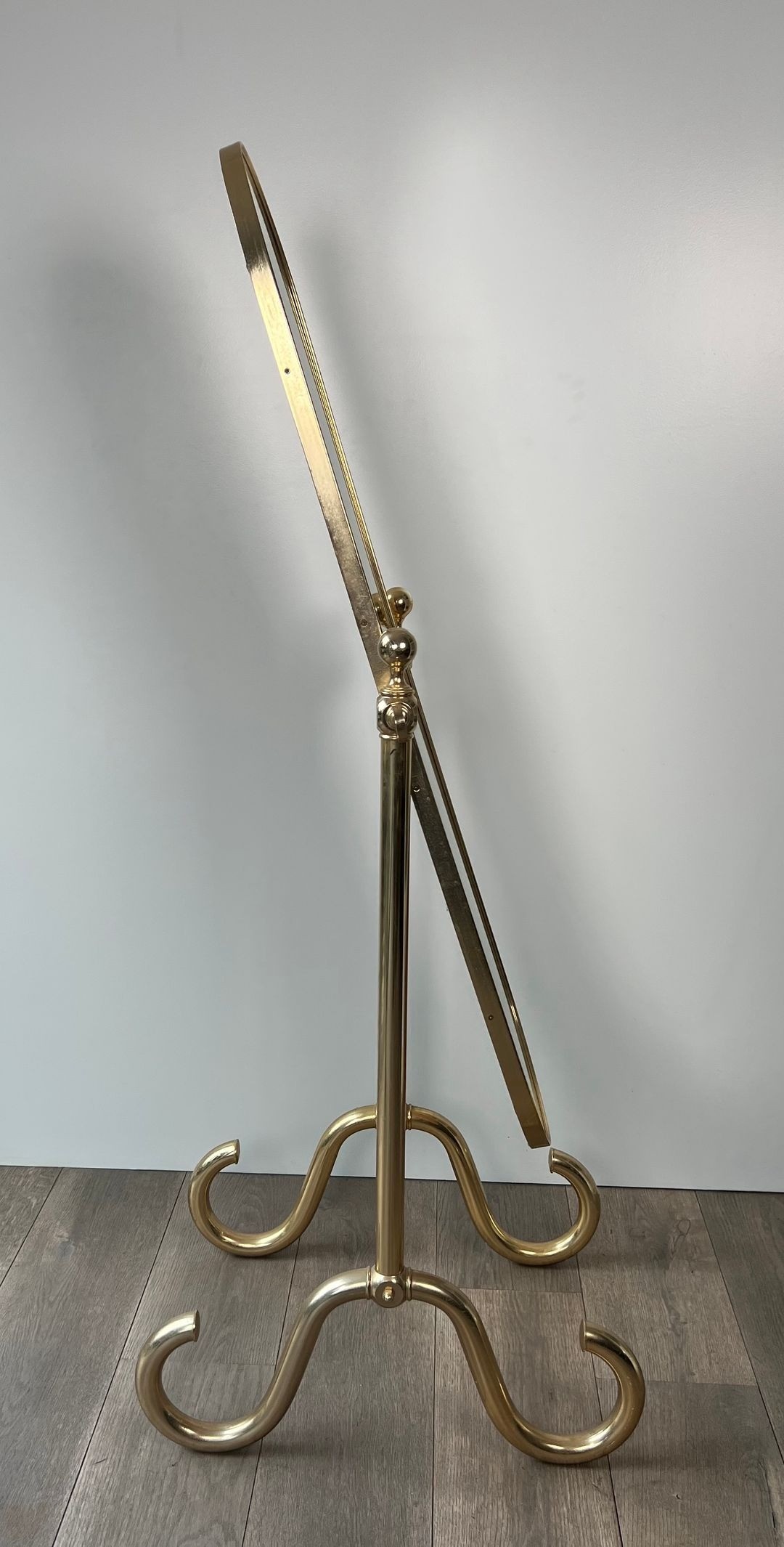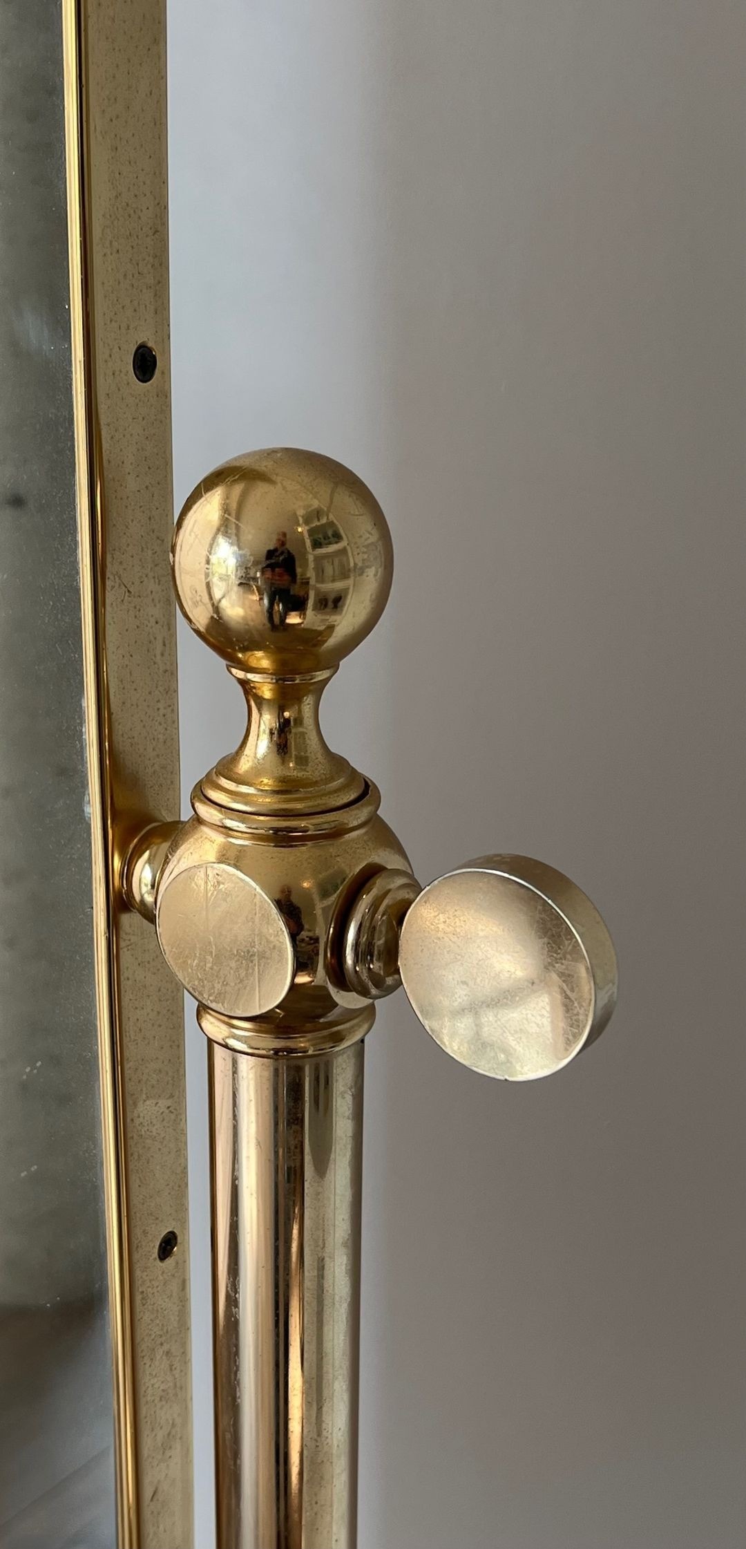 This impressive full-length psyché mirror presents a study in the restrained luxury that characterised the finest French decorative metalwork of the 1970s. The entire structure — two slender uprights crowned with spherical finials, a generous rectangular mirror plate mounted on a central tilting pivot, and an elegantly splayed base with a curved stretcher — is executed in polished brass whose warm golden lustre remains richly intact. The mirror tilts freely on its pivot, allowing the angle of reflection to be adjusted to suit the viewer, a practical refinement that was a defining feature of the classic psyché form from its origins in the nineteenth century through its mid-century revival.