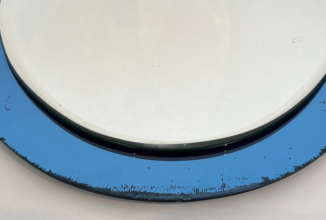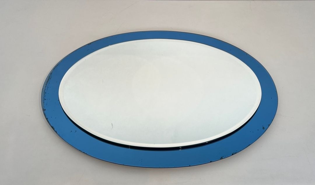 Fontana Arte was founded in Milan in 1932 by Gio Ponti and Luigi Fontana, and rapidly established itself as one of the most important names in European decorative glass design. The company's mirrors — particularly those using tinted glass surrounds in blue, smoke, amber, and green — became some of the most widely admired objects of mid-century Italian design and remain among the most sought-after pieces in the contemporary vintage design market. This oval model, with its particularly vivid blue surround, is a characteristic and desirable example of the genre.