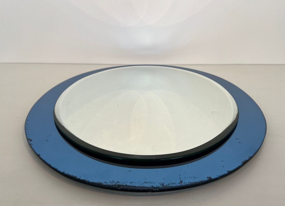 Oval Mirror with Blue-Tinted Glass Surround by Fontana Arte — Italian Work, Circa 1970