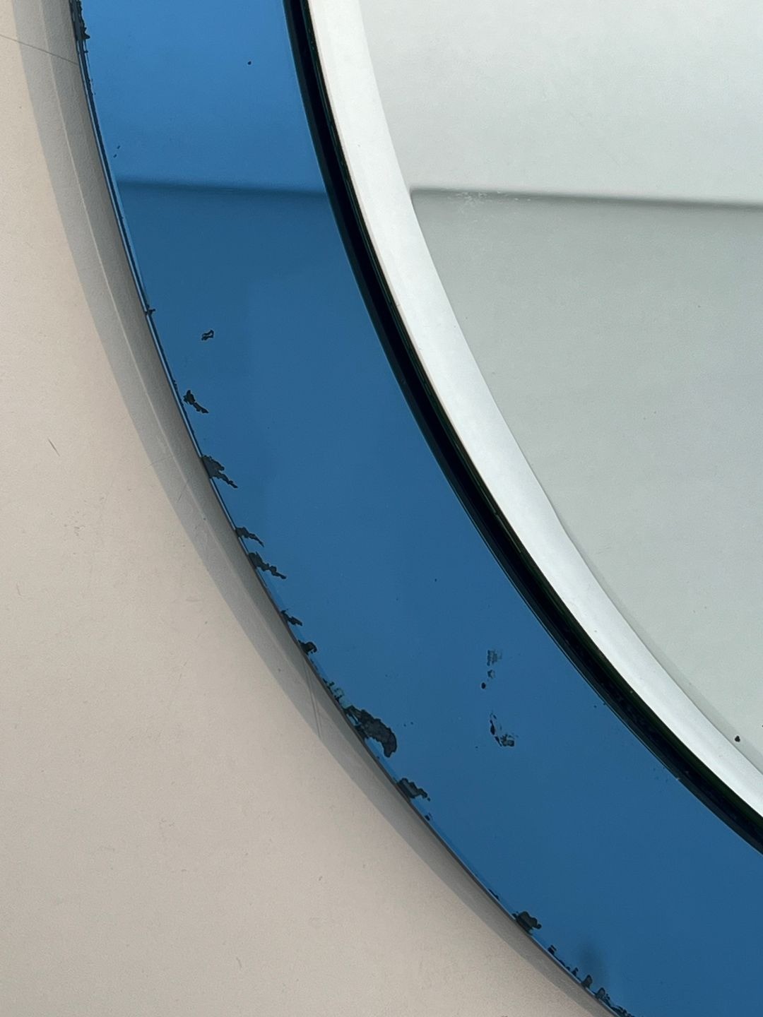 The mirror measures 61.5 centimetres in width and 80.5 centimetres in height, a generous portrait oval well suited to a hallway, a bedroom, or a bathroom. The depth of 3 centimetres is that of the glass alone — there is no additional frame. The piece is in good overall condition, with some minor wear to the outer edge of the blue glass surround, consistent with its age and entirely in keeping with the character of a vintage piece of this type.