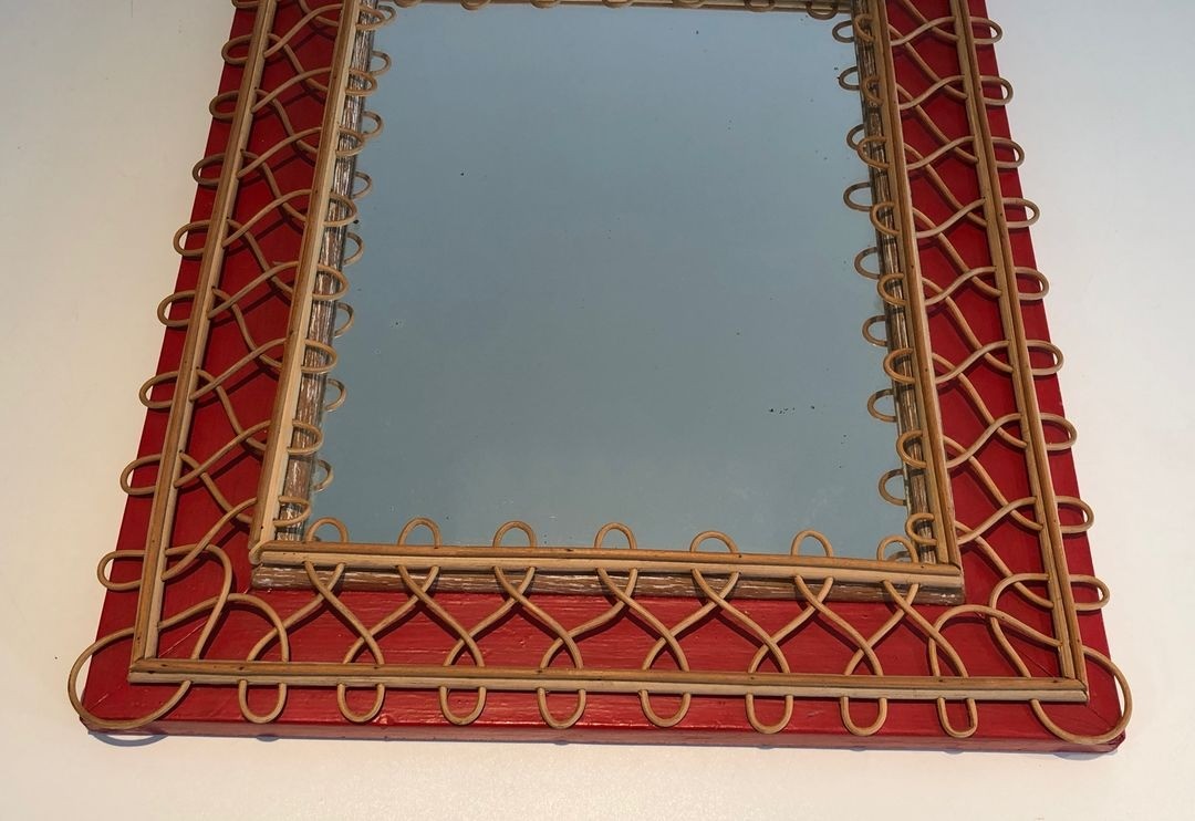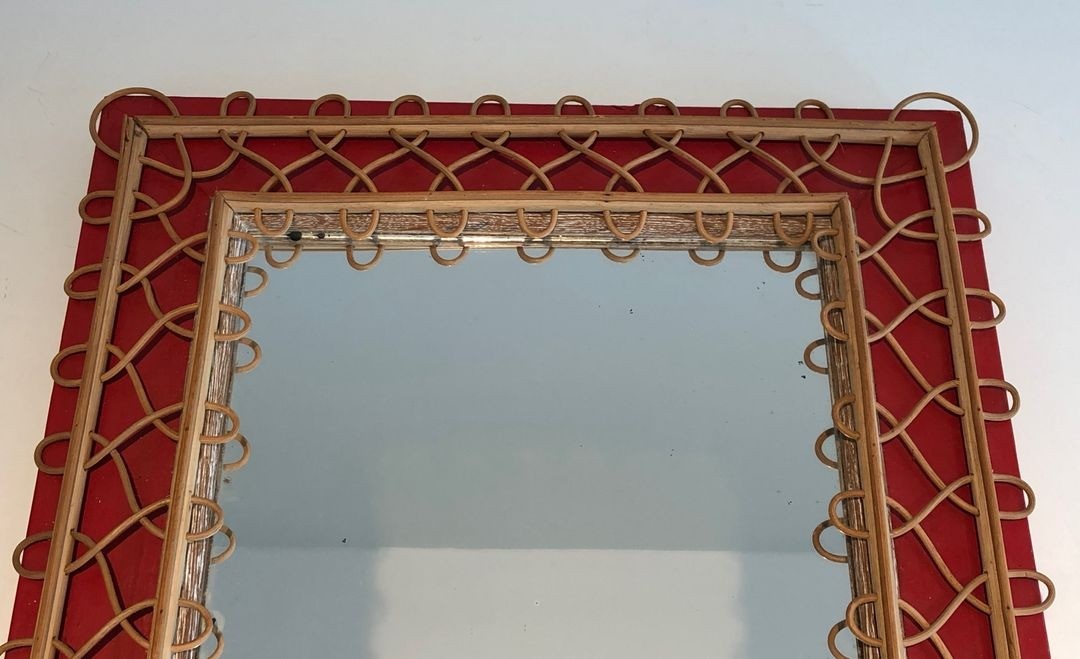 A striking rectangular mirror framed by a geometrical trellis of natural rattan woven over a deep crimson background, with rosette knots at the intersections. French work, circa 1940. 48 × 4 × 57.5 cm.