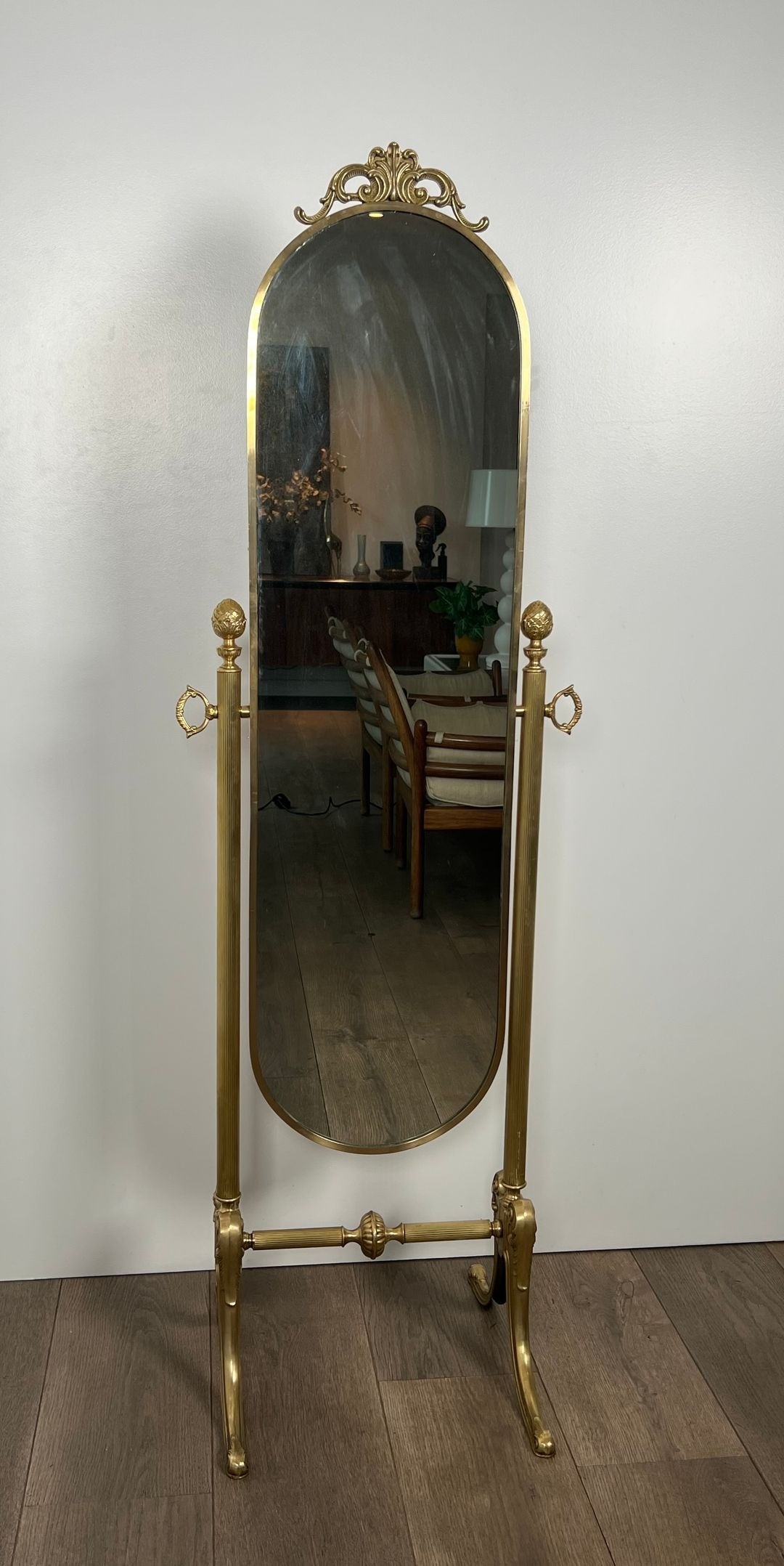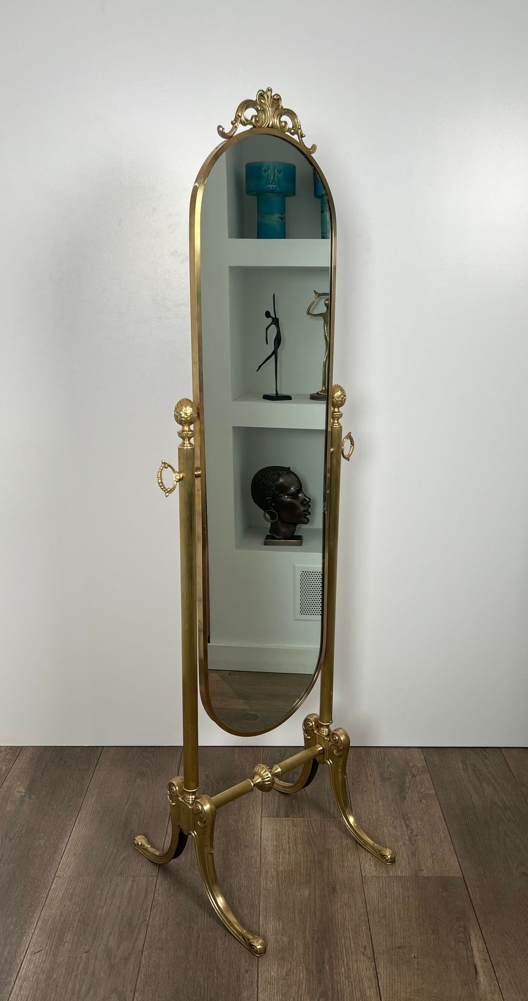 At 52 centimetres in width, 43.5 centimetres in depth, and a full 156 centimetres in height, this psyché is a major presence in any room. It is suited to a master bedroom, a dressing room, or any reception space of sufficient scale to accommodate a free-standing mirror of this quality and ambition.