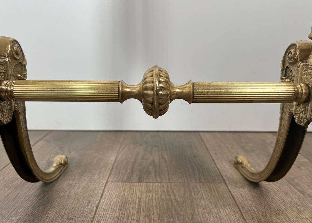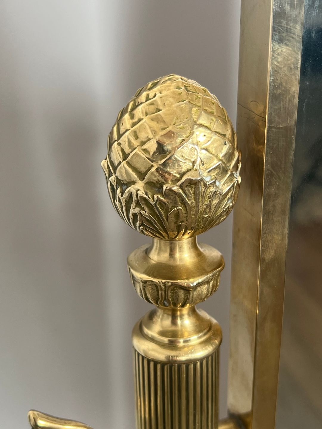 The structure is composed of two vertical columns in fluted brass — a motif drawn directly from the neoclassical vocabulary of the Louis XVI and Directoire periods. Each column is topped by a large, elaborately cast brass finial in the form of an artichoke or pine cone, its repoussé surface worked with concentric scales that catch the light and give the finials an almost sculptural presence at the extremities of the piece. Between the columns, the arched mirror plate is suspended on pivoting ring-form brackets adorned with small scrolled ornamental elements — allowing smooth adjustment of the mirror's angle to any desired inclination.