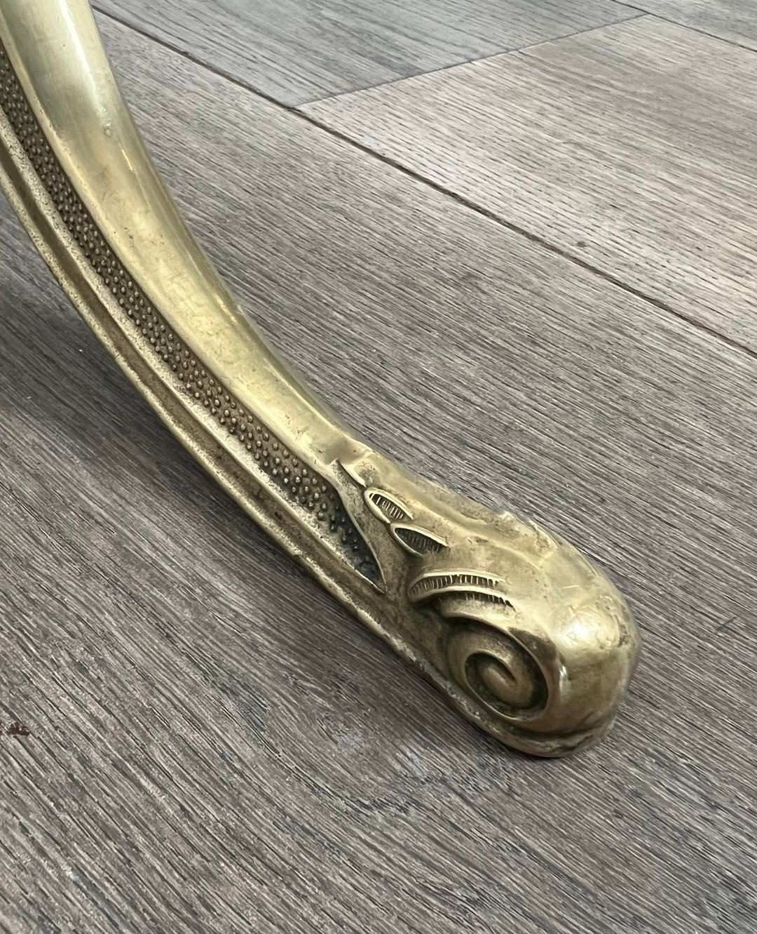 The crowning glory of the piece is the cast brass crest that surmounts the arch of the mirror plate: a full-blown rocaille composition with scrolling acanthus leaves, shells, and foliate ornament of high quality and considerable visual complexity. This type of elaborate cresting is a direct reference to the finest French cabinet-making of the Louis XV and Régence periods, and its presence here on a functional standing mirror elevates the object from furniture to decorative sculpture.