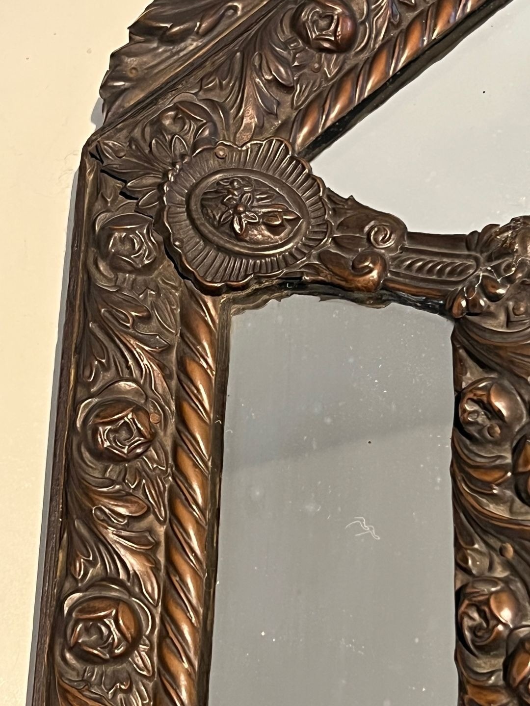 At 52 centimetres in width and 96 centimetres in height, this mirror has a substantial physical presence, suited to a salon, a library, or a formal dining room. In fine condition considering its age, with the repoussé relief well-preserved and the copper patina giving the whole a rich, dark warmth.