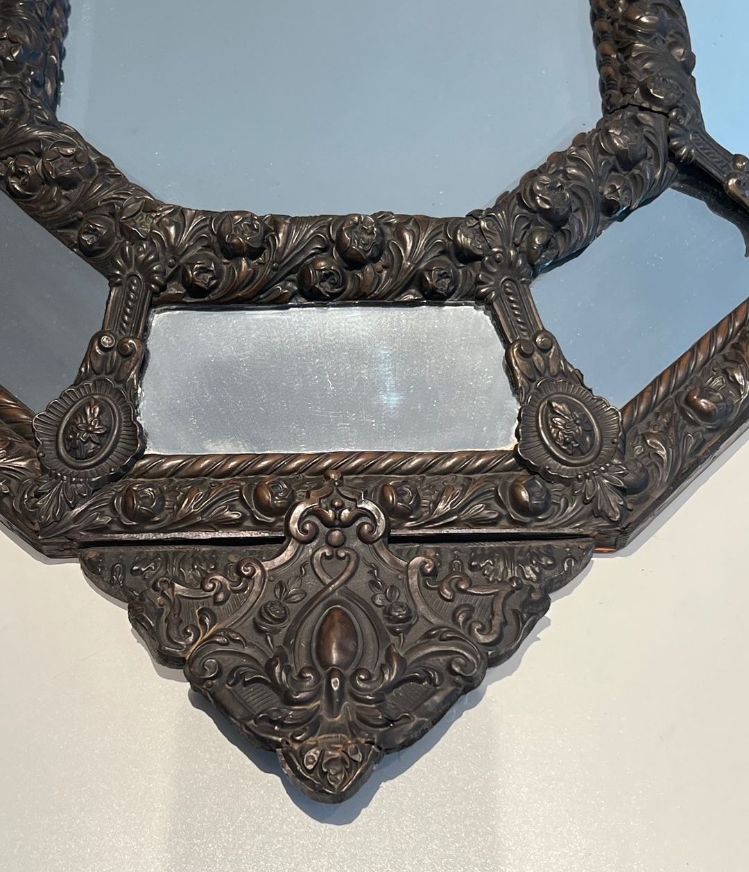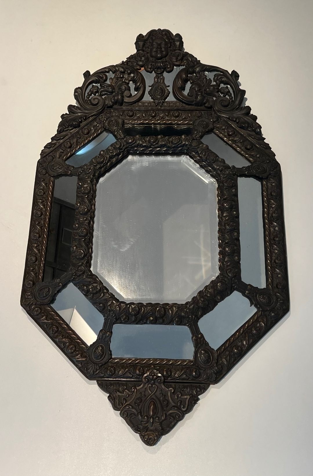A magnificent Napoléon III octagonal mirror in the Louis XIV style, its densely worked repoussé copper frame adorned with floral garlands and acanthus scrolls and topped with the crowned effigy of the Sun King. The octagonal plate is surrounded by bevelled mirror parecloses. Circa 1880. 52 × 7 × 96 cm.