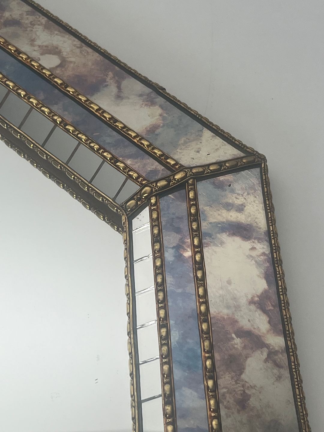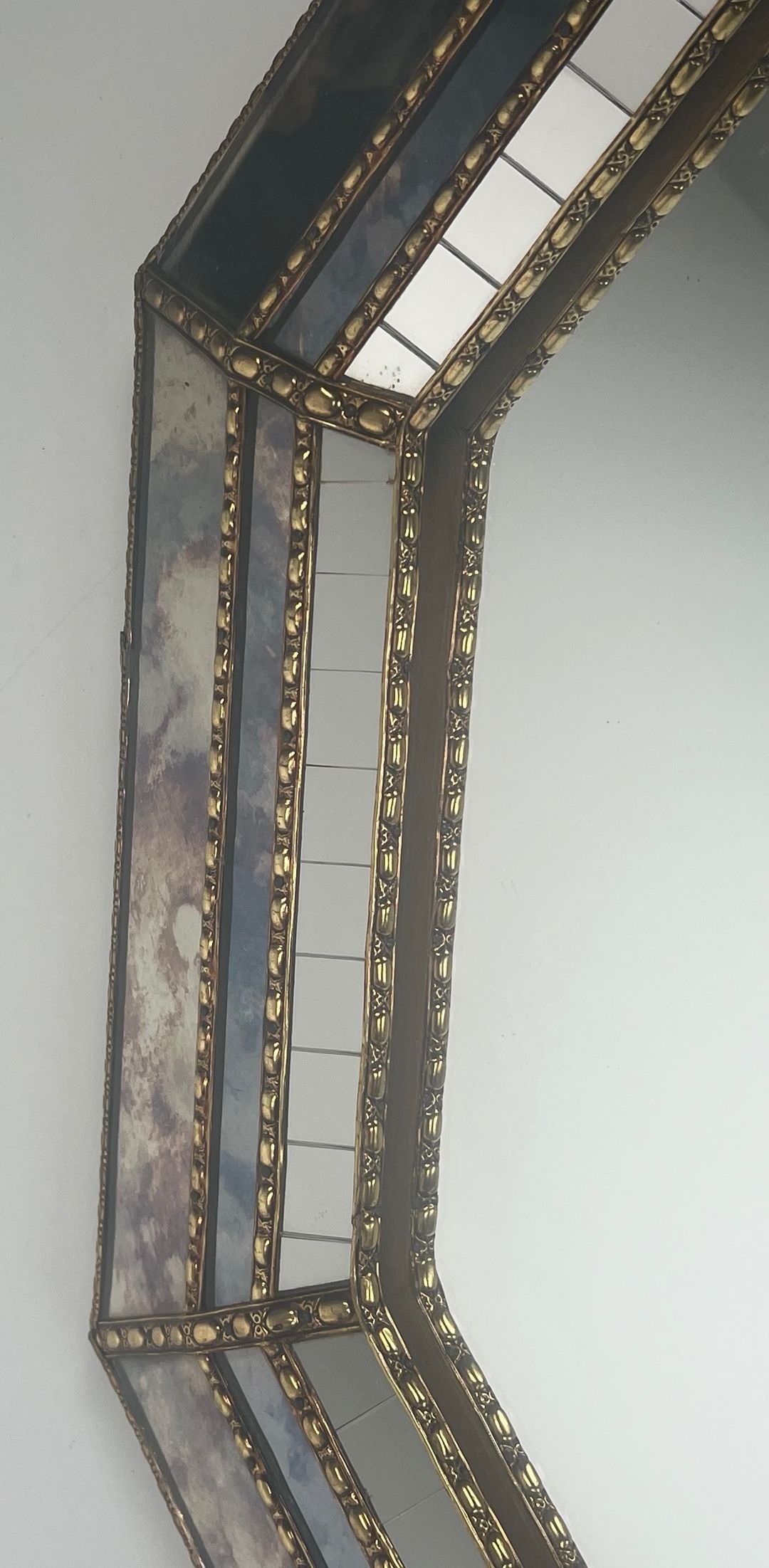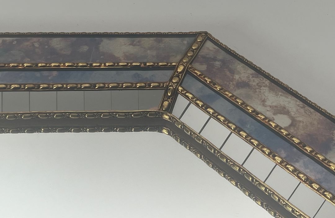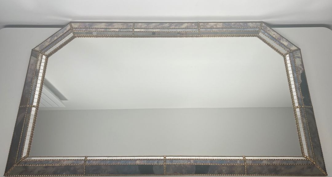 This type of large decorative mirror, combining multi-faceted glass and brass ornament, belonged to a distinguished tradition of French mirror-making that drew on the Venetian and classical French heritage while updating it for the modern interior. The scale and ambition of this piece place it squarely in the category of statement decorative objects — designed for spaces of a certain grandeur and intended to transform the visual character of a room through multiplication of light and reflection.