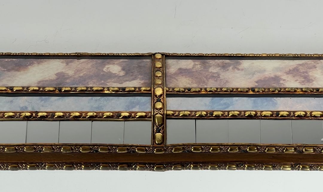 This impressively scaled mirror commands attention through both its generous proportions and the rich decorative vocabulary of its frame. At 160 centimetres in width and 92.5 centimetres in height, it is conceived as a landscape-format piece for a principal wall — above a fireplace, a long console, or in a salon or dining room where its horizontal sweep and luminous framing can be fully appreciated.