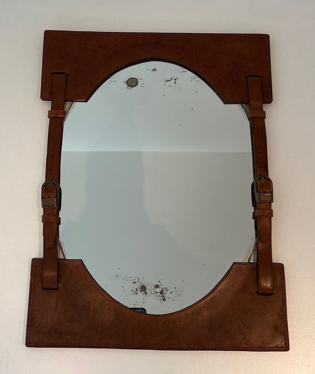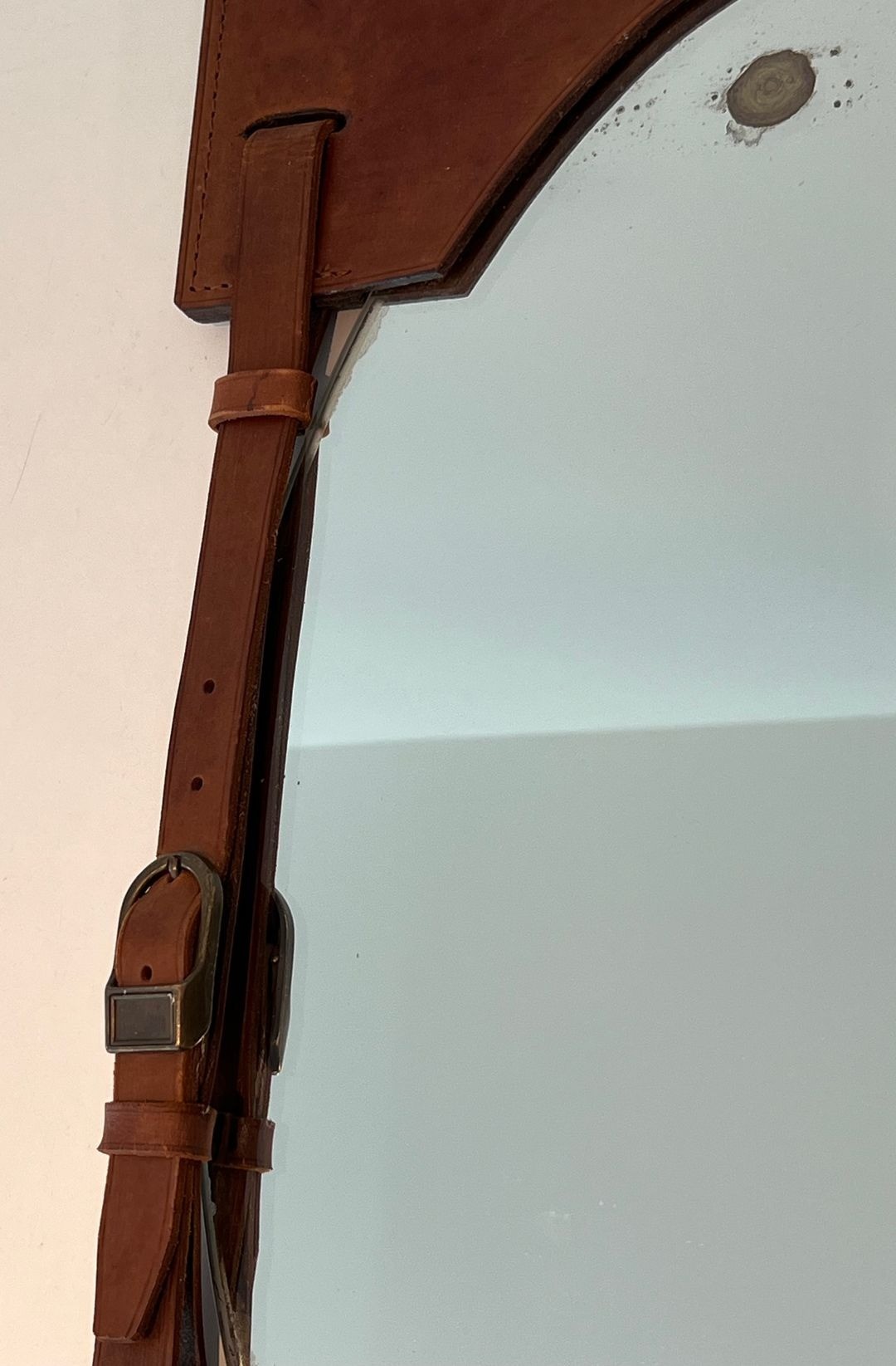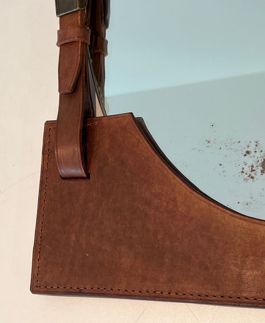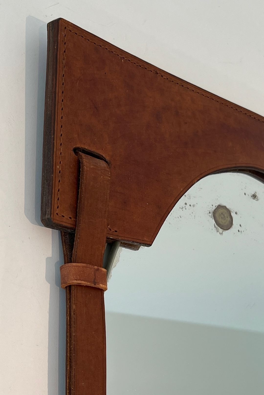 The resulting composition has an almost tectonic quality — the mirror plate, arched at the top and flat at the base, appears to float within a leather armature that functions simultaneously as frame, support, and decorative statement. The hand-stitching running along the edges of each leather element adds a refined artisanal note and underscores the quality of the construction. This structural approach to the frame — in which the support becomes the ornament — was central to Adnet's design philosophy and stands in deliberate contrast to the gilded excesses of earlier decorative traditions.