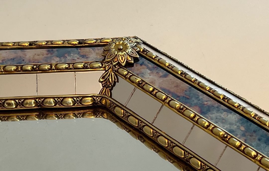 Octagonal Multi-Faceted Mirror with Brass Garland Mouldings — French Work, Circa 1970
