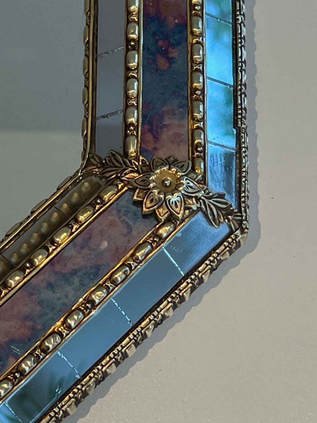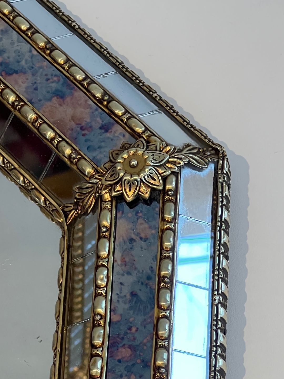 The corners of the composition are marked by cast brass garland mouldings, each one a miniature relief of stylized foliage and floral motifs rendered with fine craftsmanship. These brass accents, positioned at the eight angles of the frame, serve both a structural and a purely decorative function, binding the faceted border at its joints while adding a note of warm, golden contrast to the cool silver of the mirror surfaces. The result is a piece that oscillates gracefully between the palatial grandeur of the Baroque tradition and the refined decorative sensibility of mid-century French design.