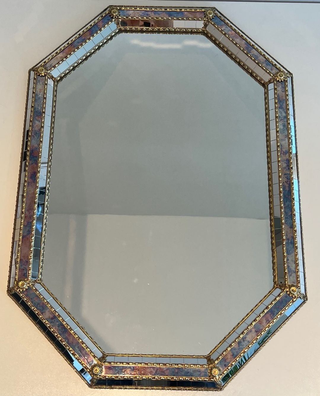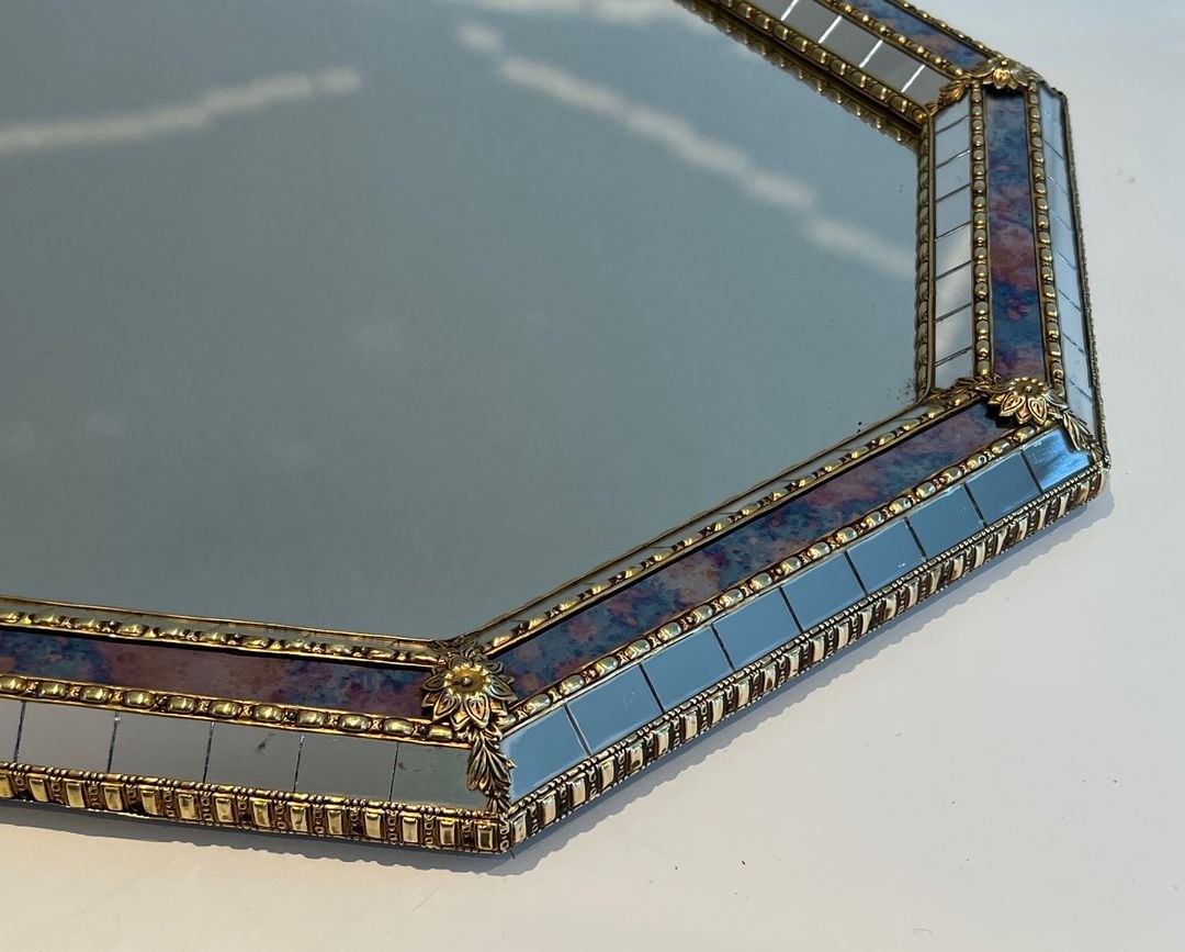 An elegant octagonal mirror framed by a border of faceted mirror tiles and ornate brass garland mouldings at the corners. French work in the Venetian tradition, circa 1970. 58.5 × 3.5 × 86 cm.