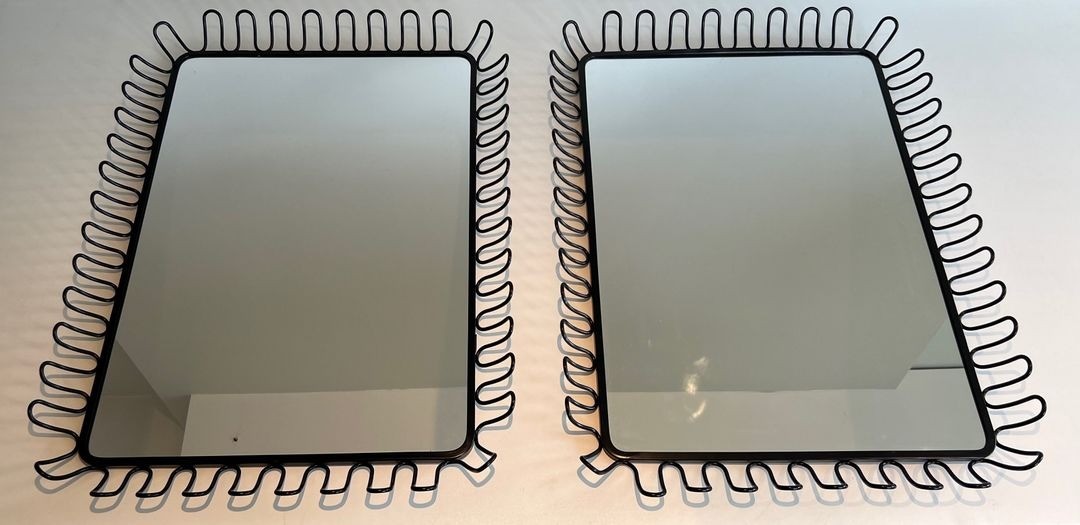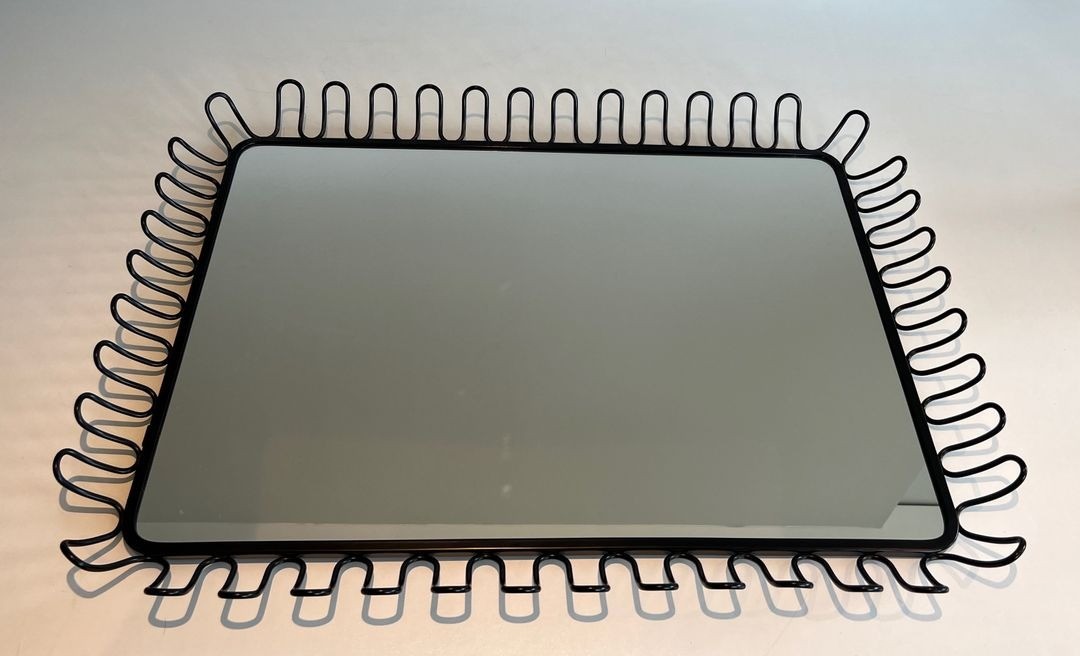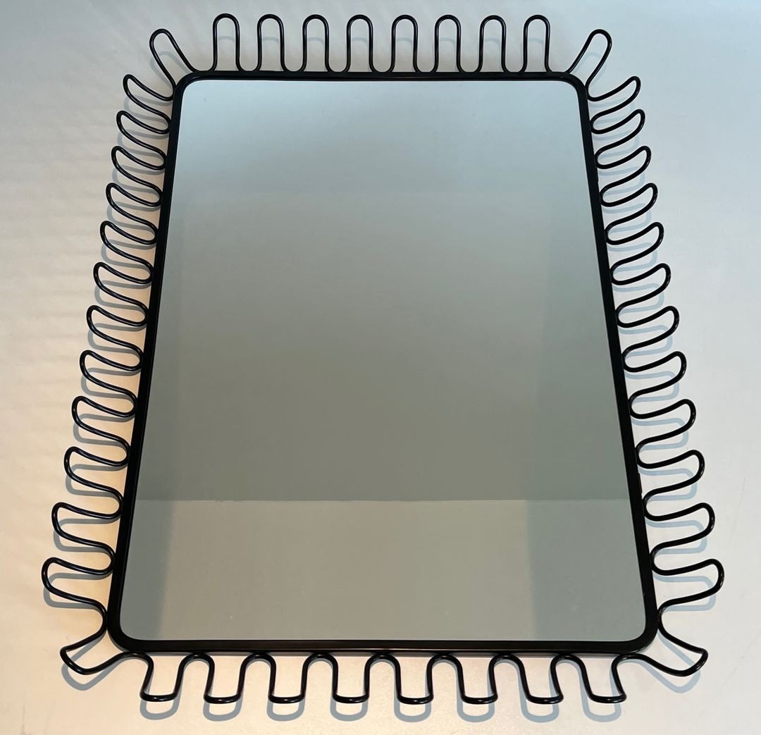 This distinguished pair of rectangular mirrors is an accomplished exercise in the decorative spirit of Jean Royère, the celebrated French designer whose mid-century output brought a uniquely fantastical and organic sensibility to the canon of modern furniture and objects. The frames, wrought from black lacquered metal, are entirely encircled by a continuous border of tightly wound coiled wire — a hallmark feature directly associated with Royère's celebrated aesthetic and widely reproduced by French craftsmen working in his wake.