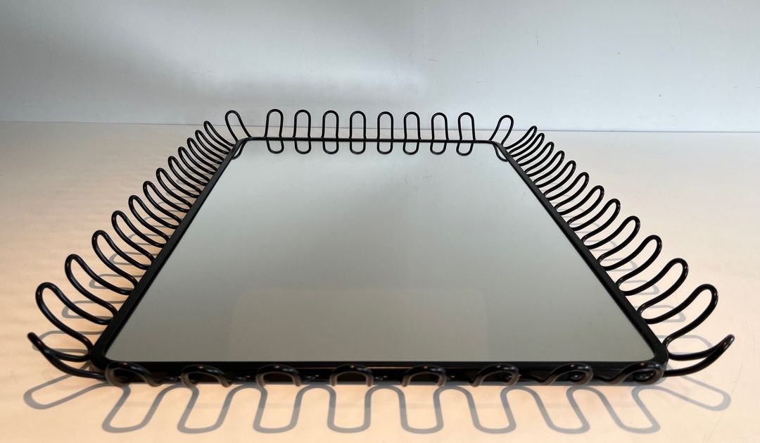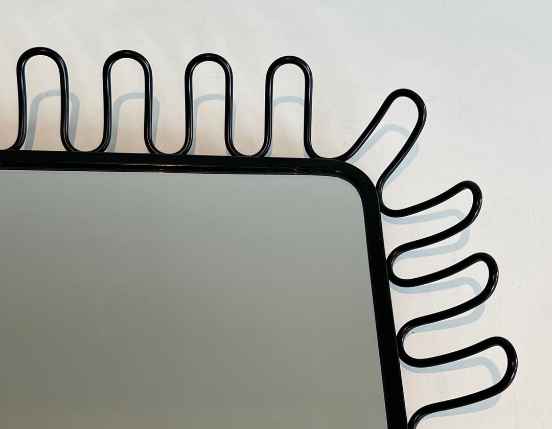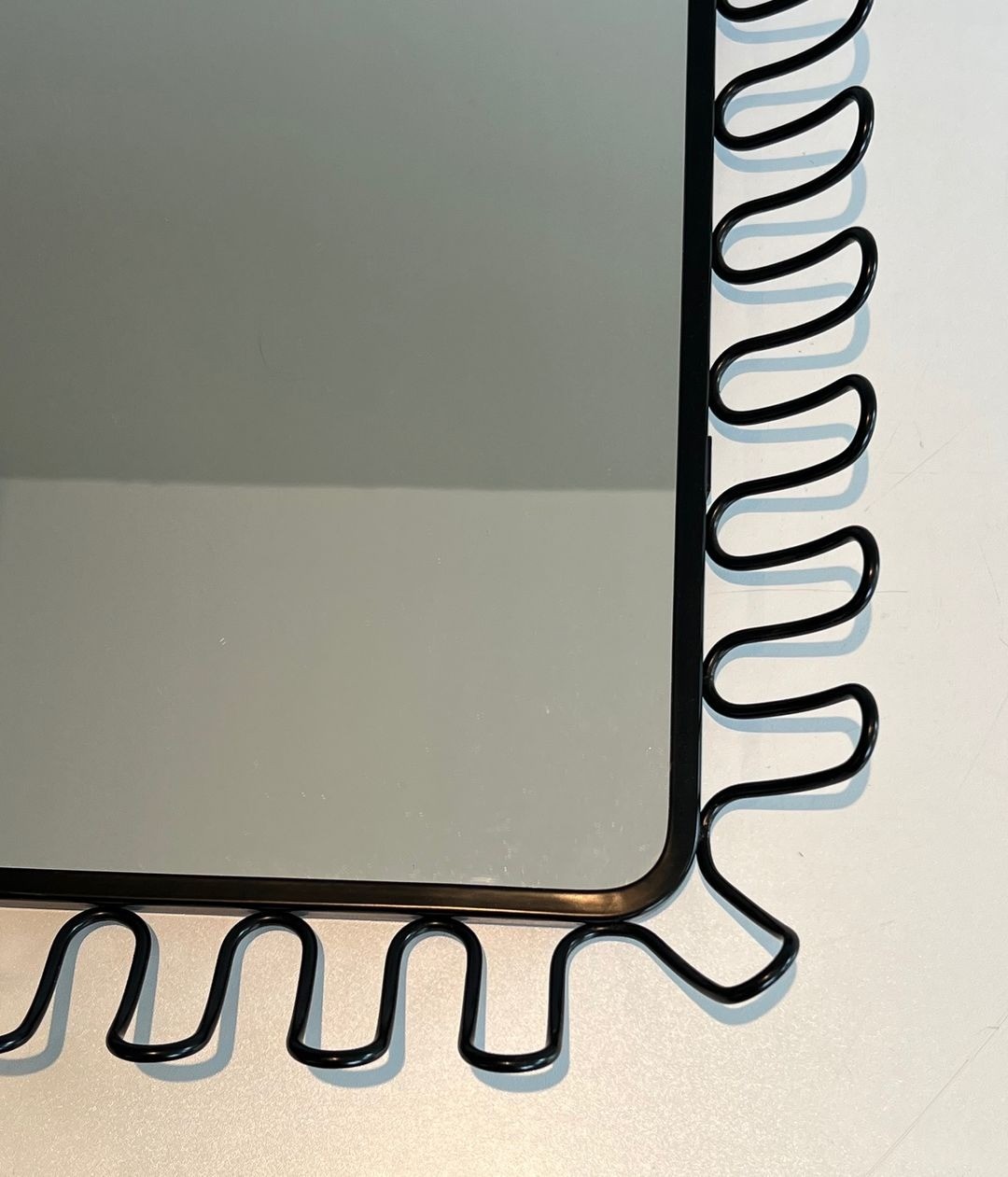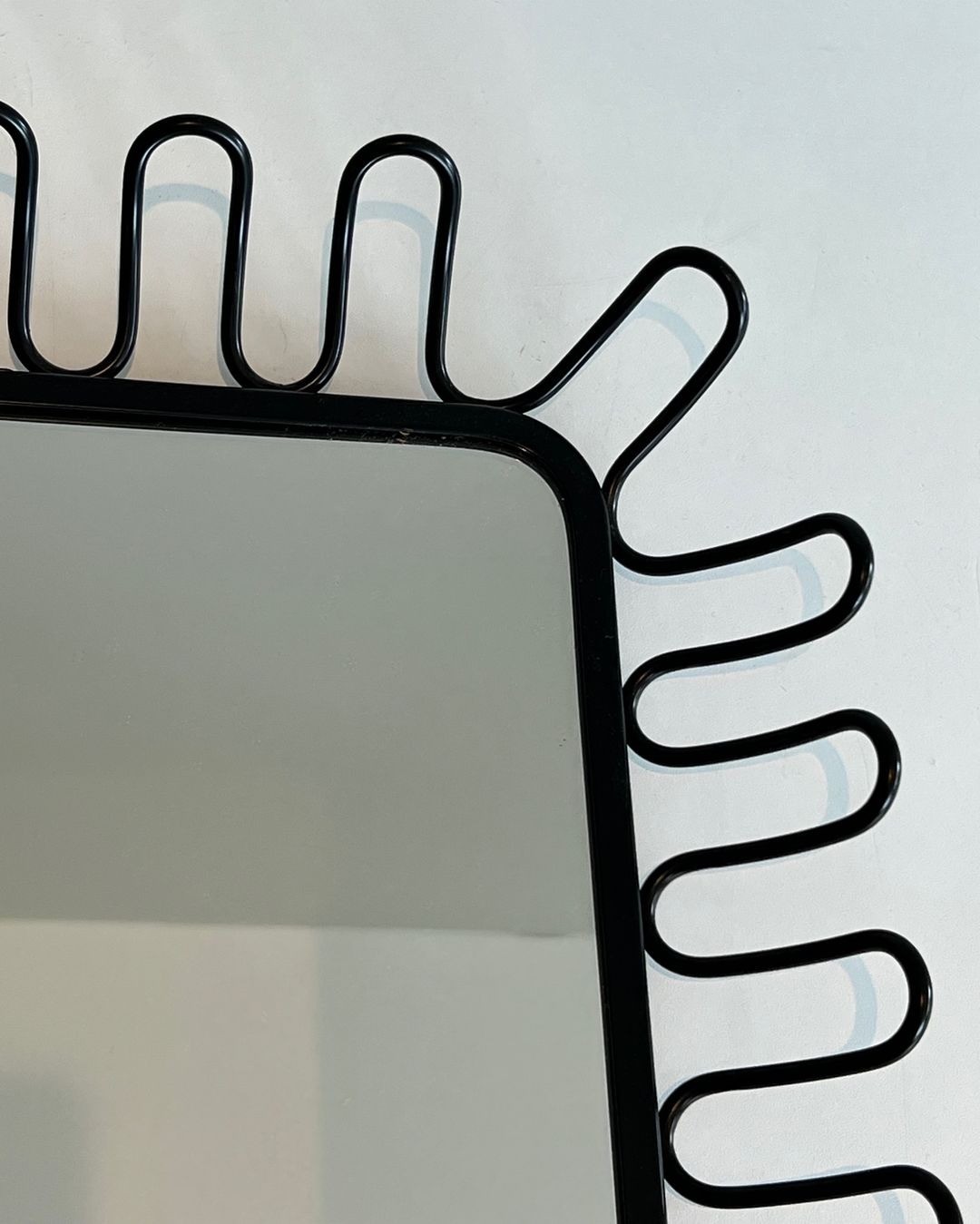 A striking pair of rectangular black lacquered metal mirrors with characteristic coiled wire frames, evocative of the playful sculptural vocabulary of Jean Royère. French work, circa 1980. 57.5 × 5.5 × 78.5 cm each.