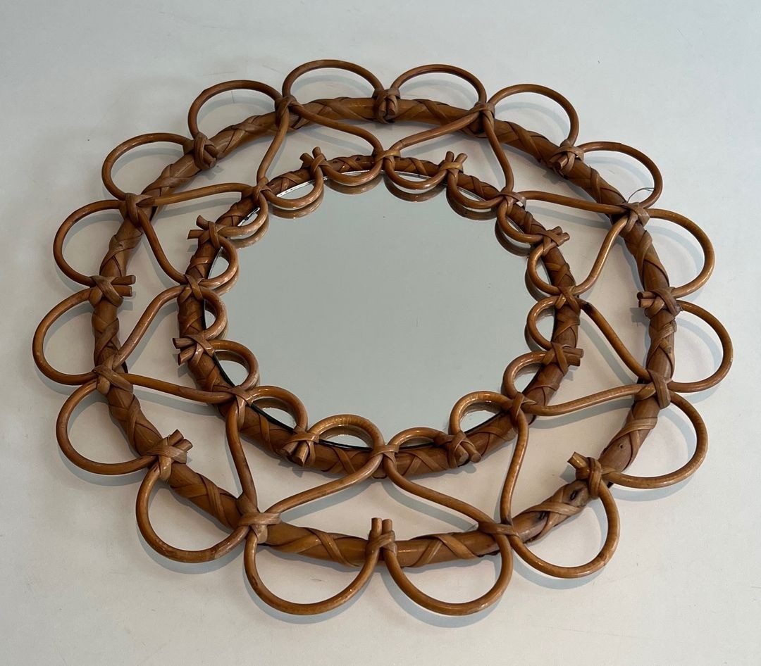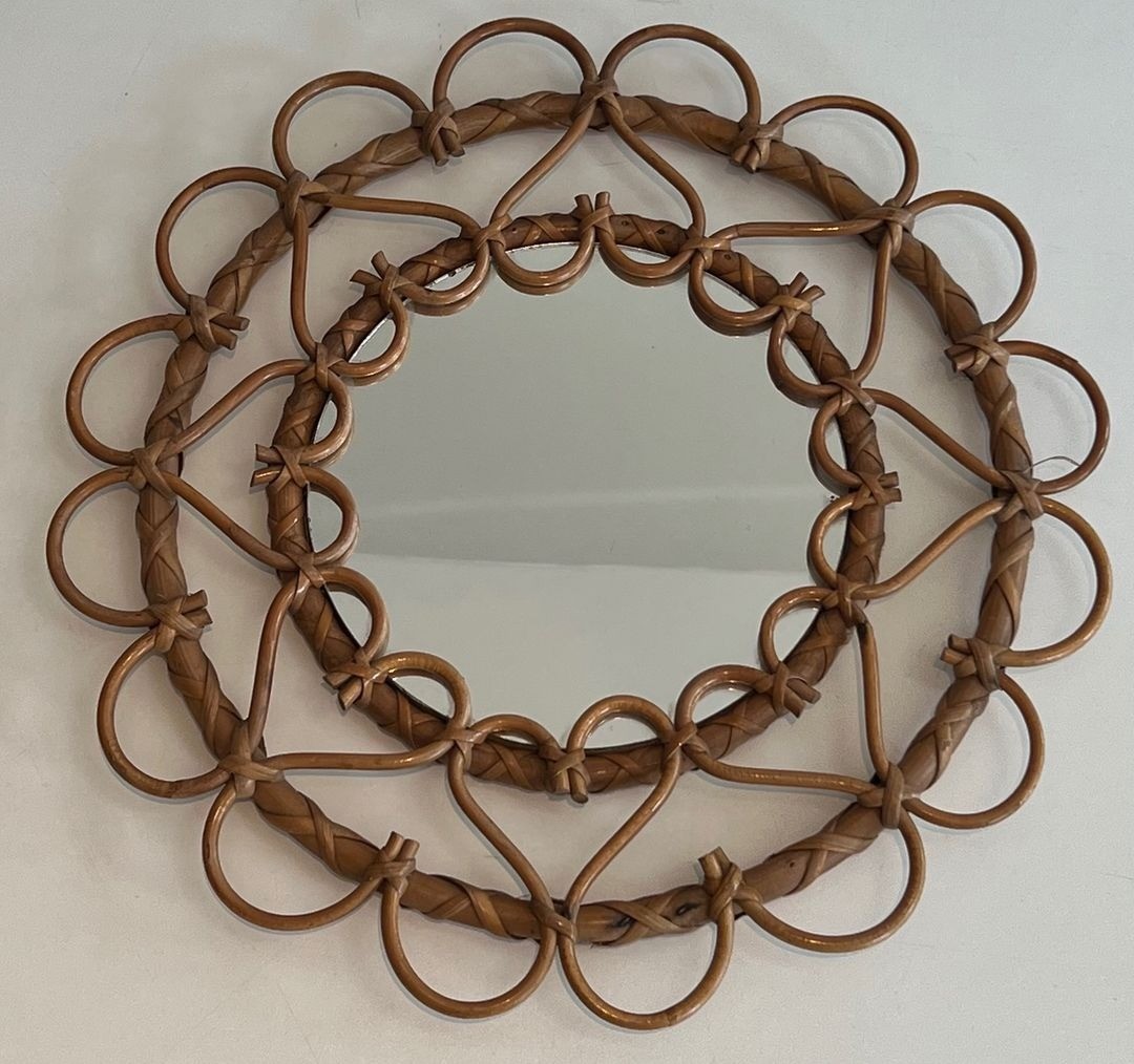 Circular rattan mirror in a decorative open-work frame composed of large overlapping rattan loops arranged in a ring, creating an airy, lace-like surround. French work, circa 1970. Overall diameter: 38.5 cm; frame depth: 2 cm.