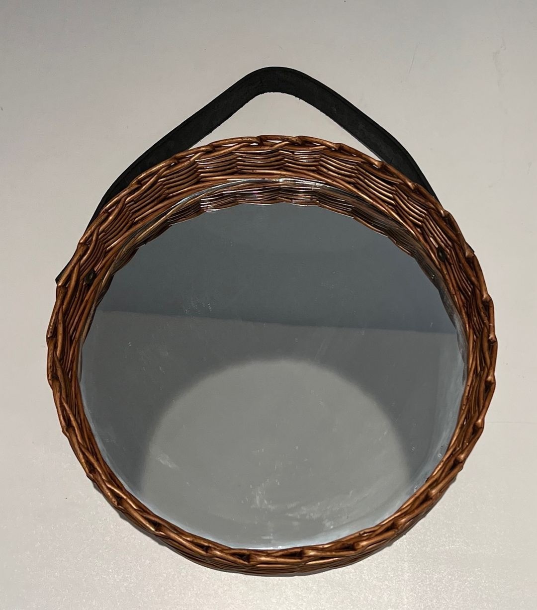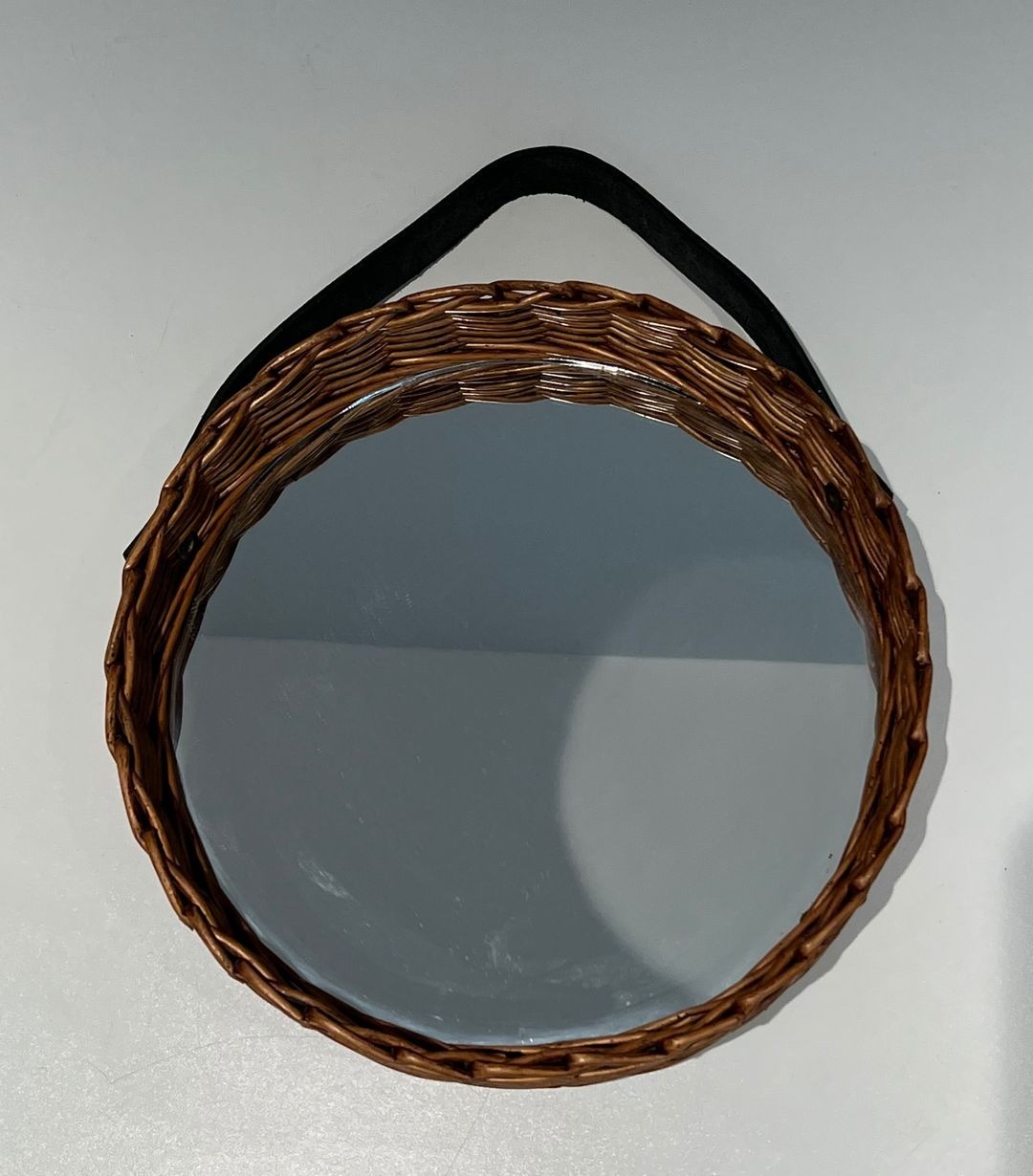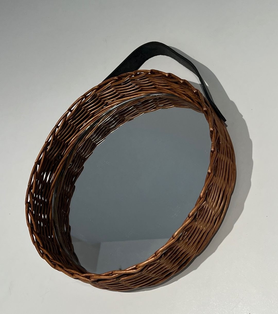 Oval mirror set within a deeply woven rattan basket-weave frame, suspended by an original leather strap. French work, circa 1950. Dimensions: 33 × 8 × 42.5 cm (W × D × H, including strap).