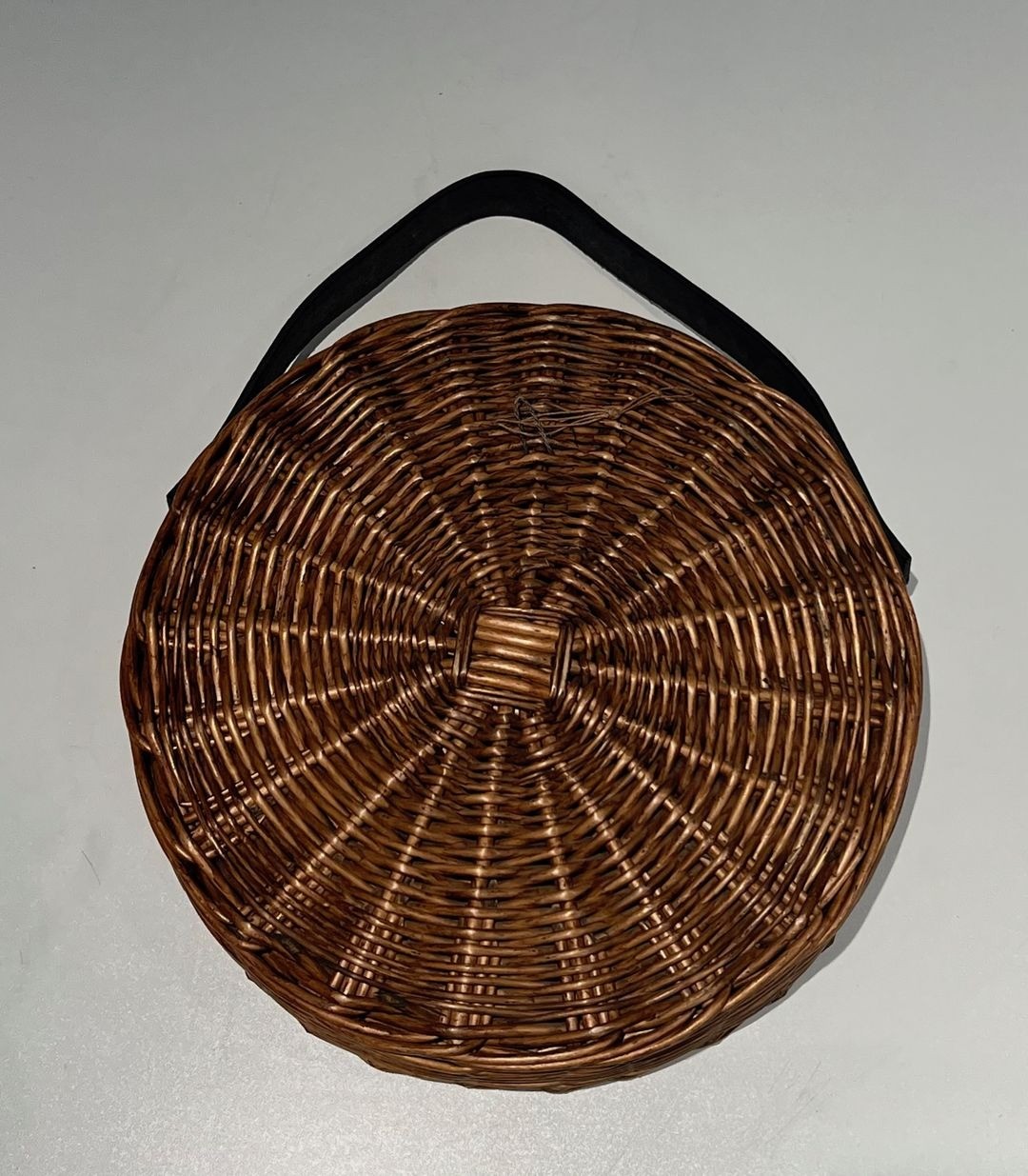 In very good condition, the rattan retaining its natural warmth and the leather strap its suppleness. Overall dimensions including strap: 33 cm wide by 42.5 cm tall, 8 cm deep. A highly characterful example of mid-century French artisanal design that will bring immediate warmth and personality to any interior.
