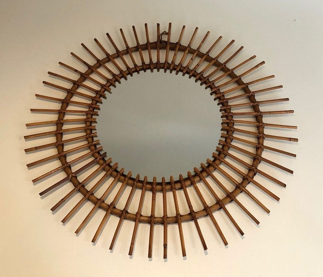 A circular wall mirror framed in natural rattan reeds arranged in a radiating sunburst pattern, the cane spokes fanning outward from the central mirror plate to create a warm, organic halo effect. French, circa 1950. 69 cm diameter.