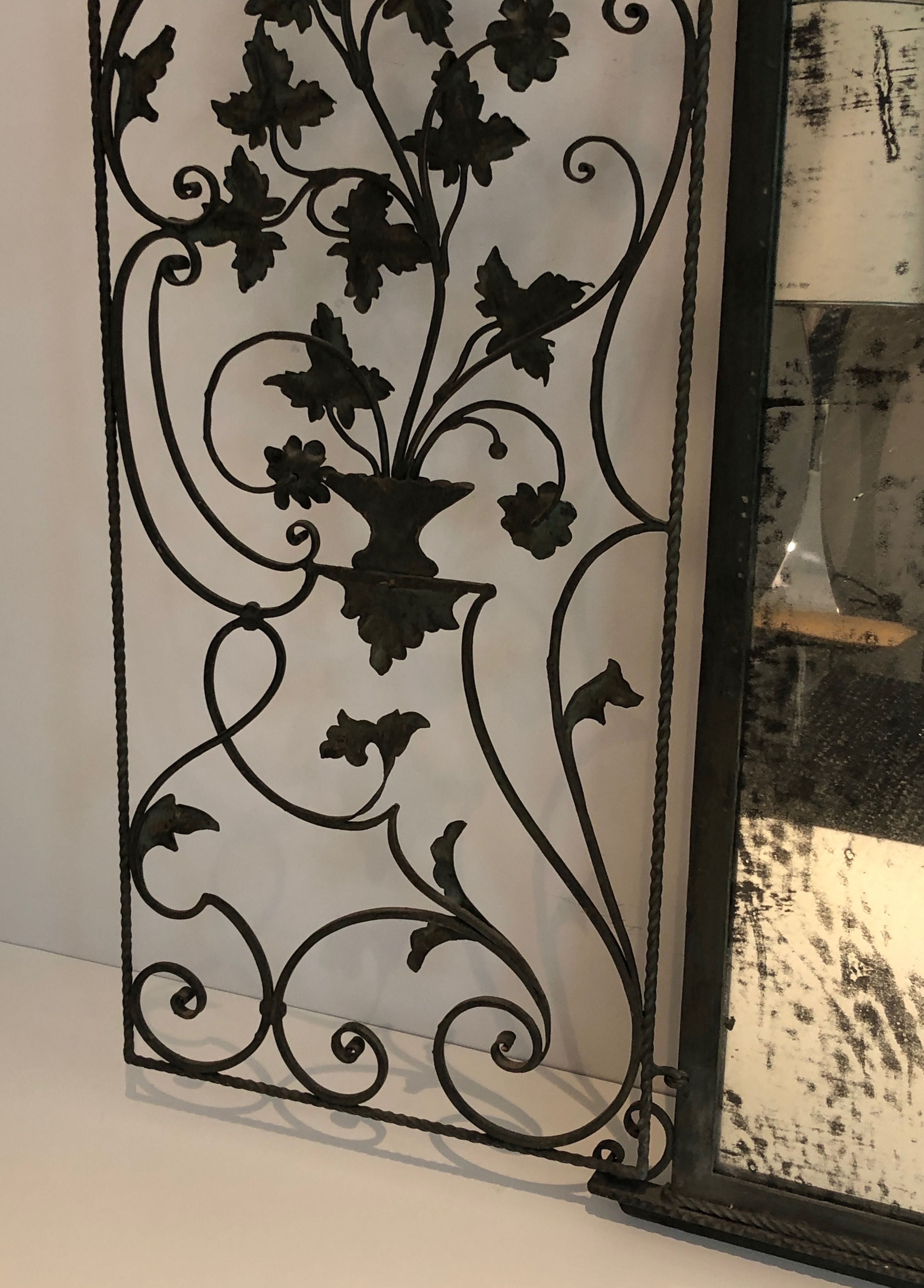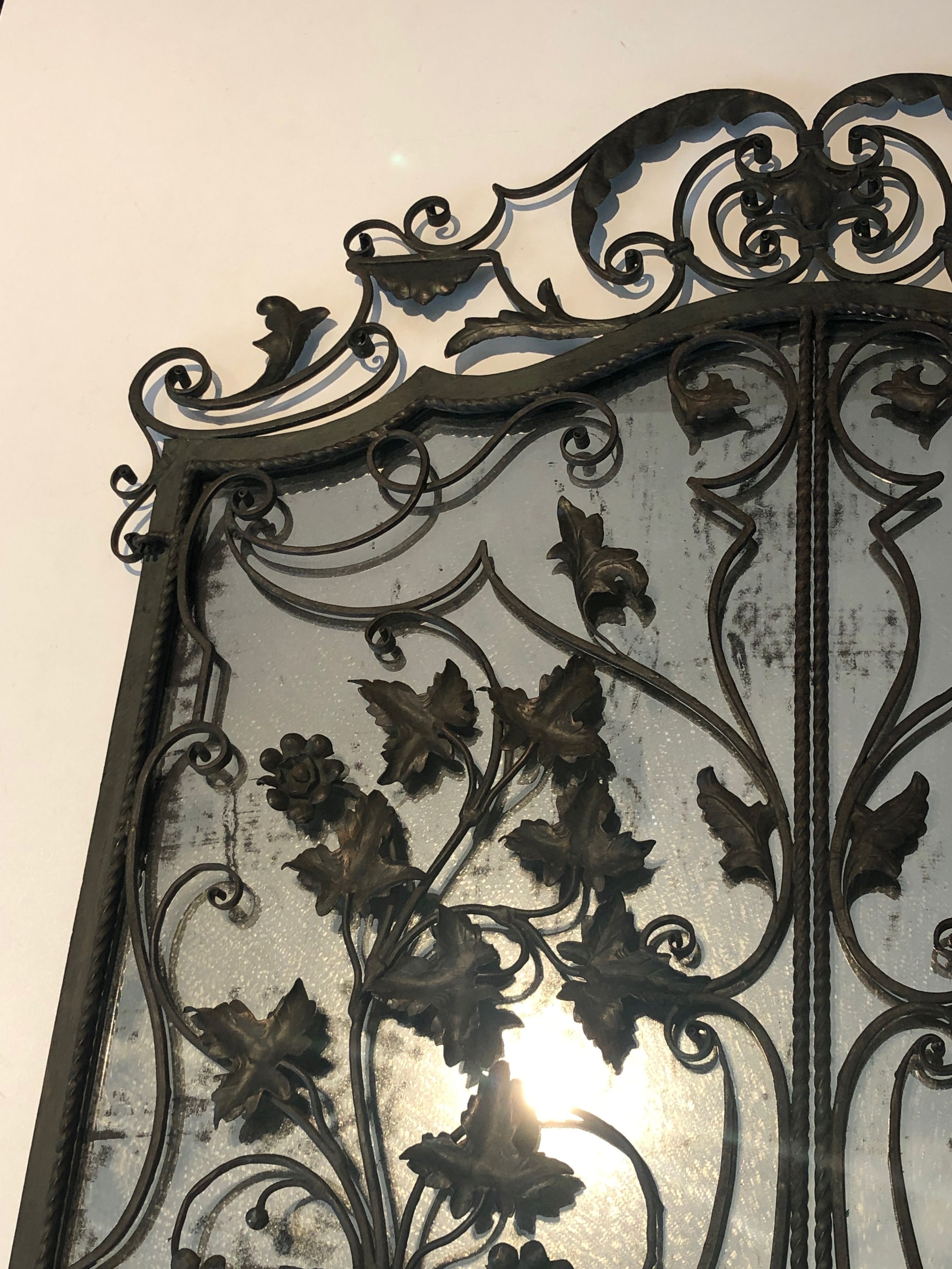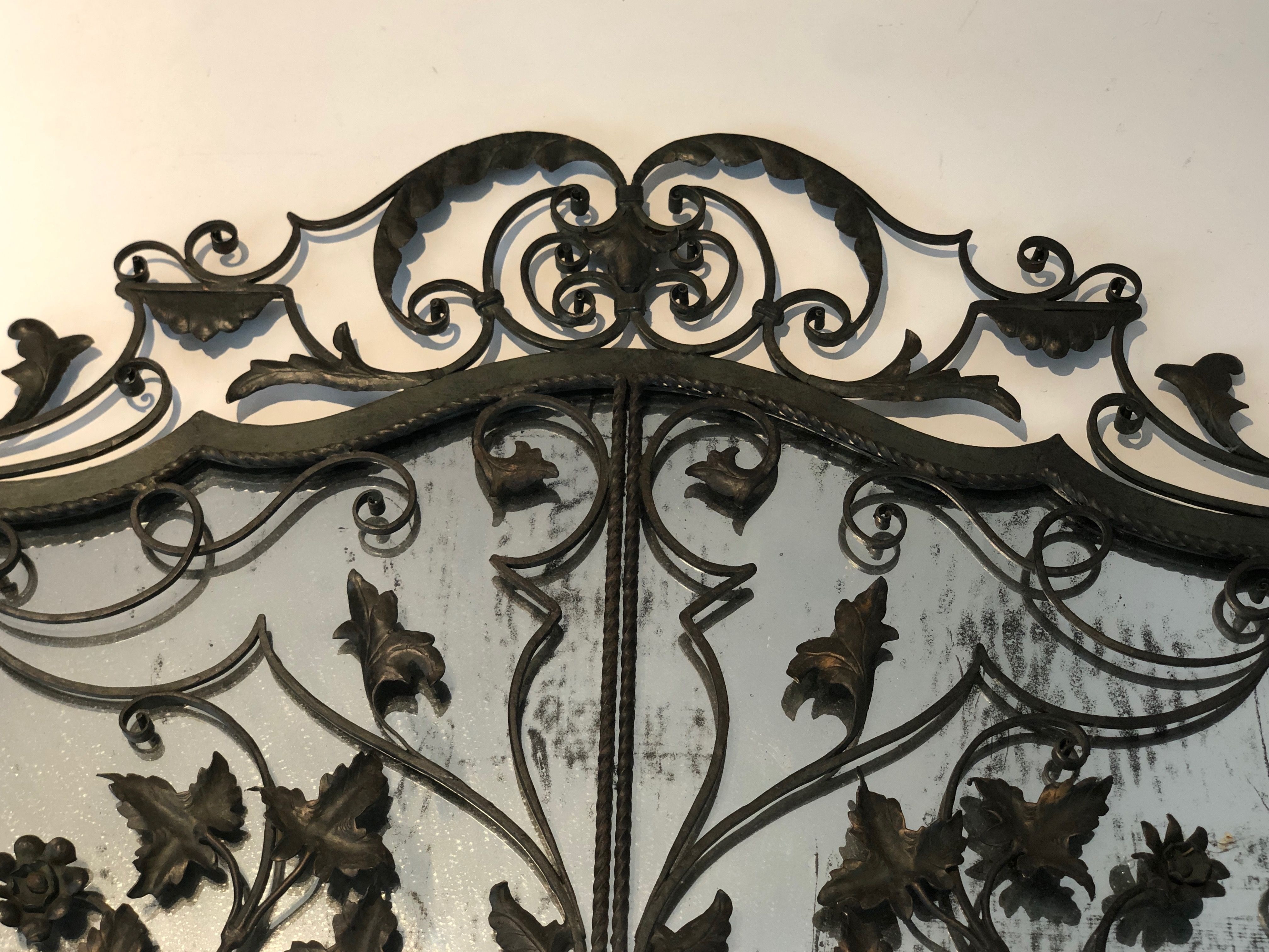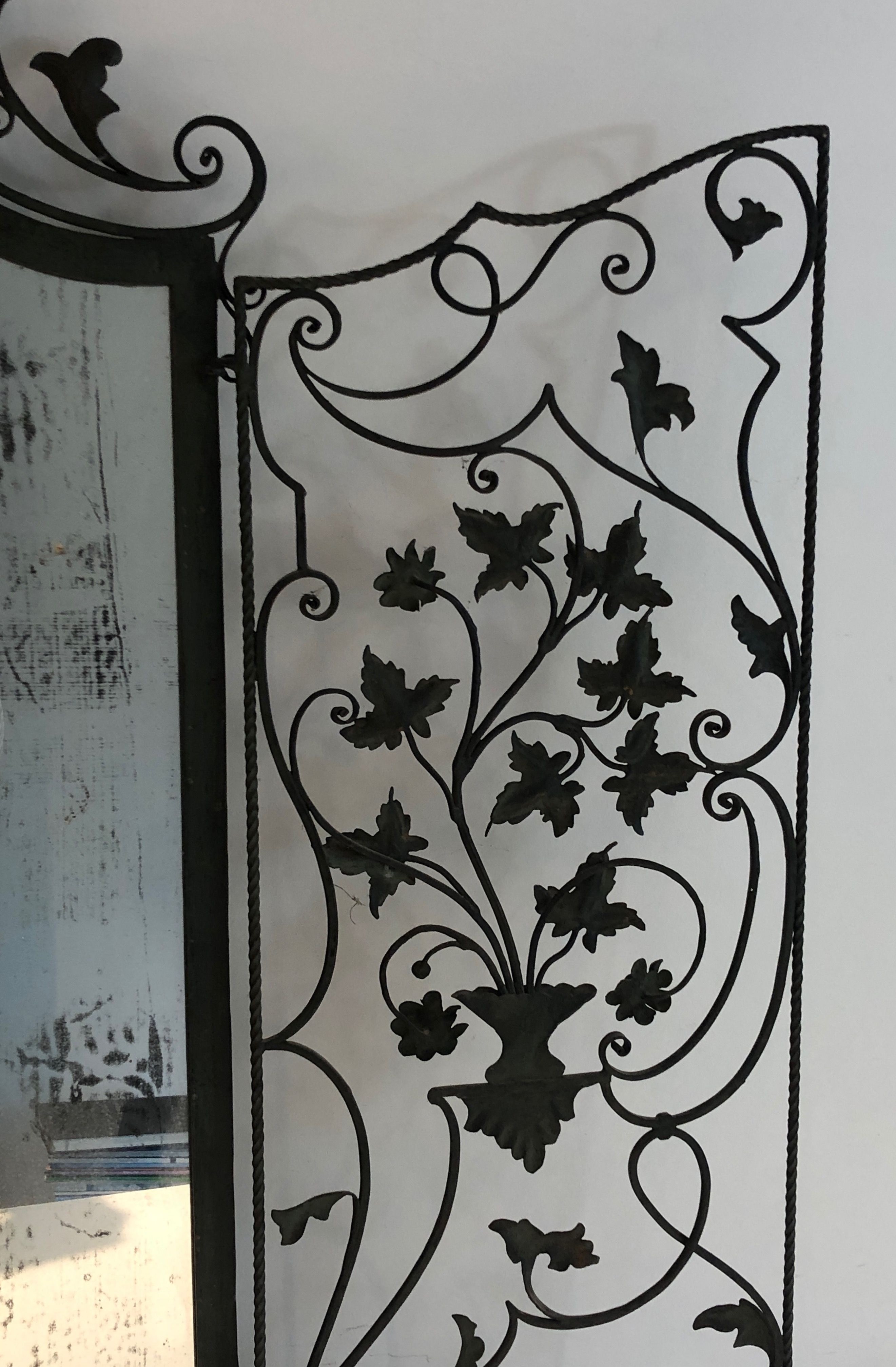 This exceptional wrought iron mirror is distinguished by its rare two-panel composition, in which a pair of hinged leaves open to reveal the central mirror plate. The entire frame is enriched with hand-forged foliage and scrollwork — intertwining leaves, acanthus-inspired forms, and elegant volutes — all executed with the mastery of the French ferronnerie d'art tradition. The interplay of the dark iron and the reflective glass creates a striking visual contrast, full of light and shadow.