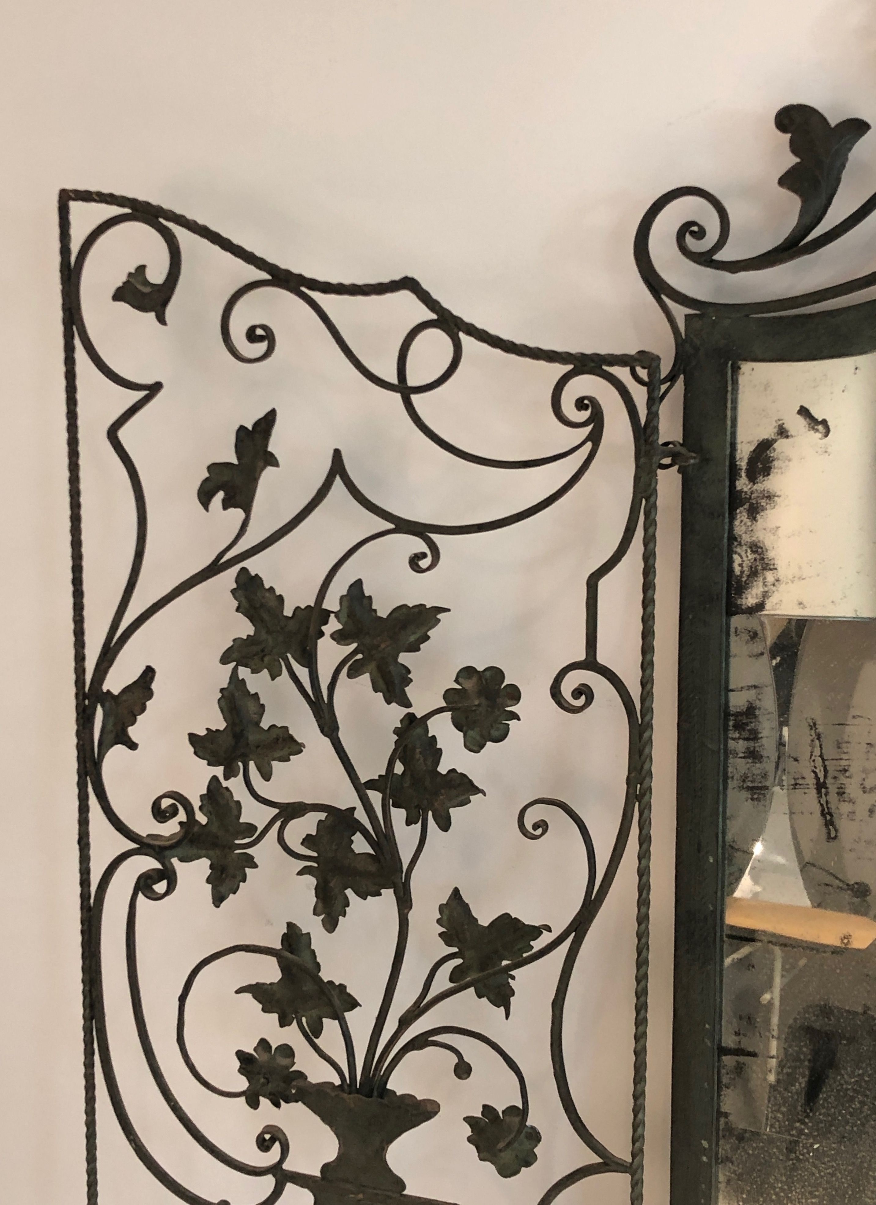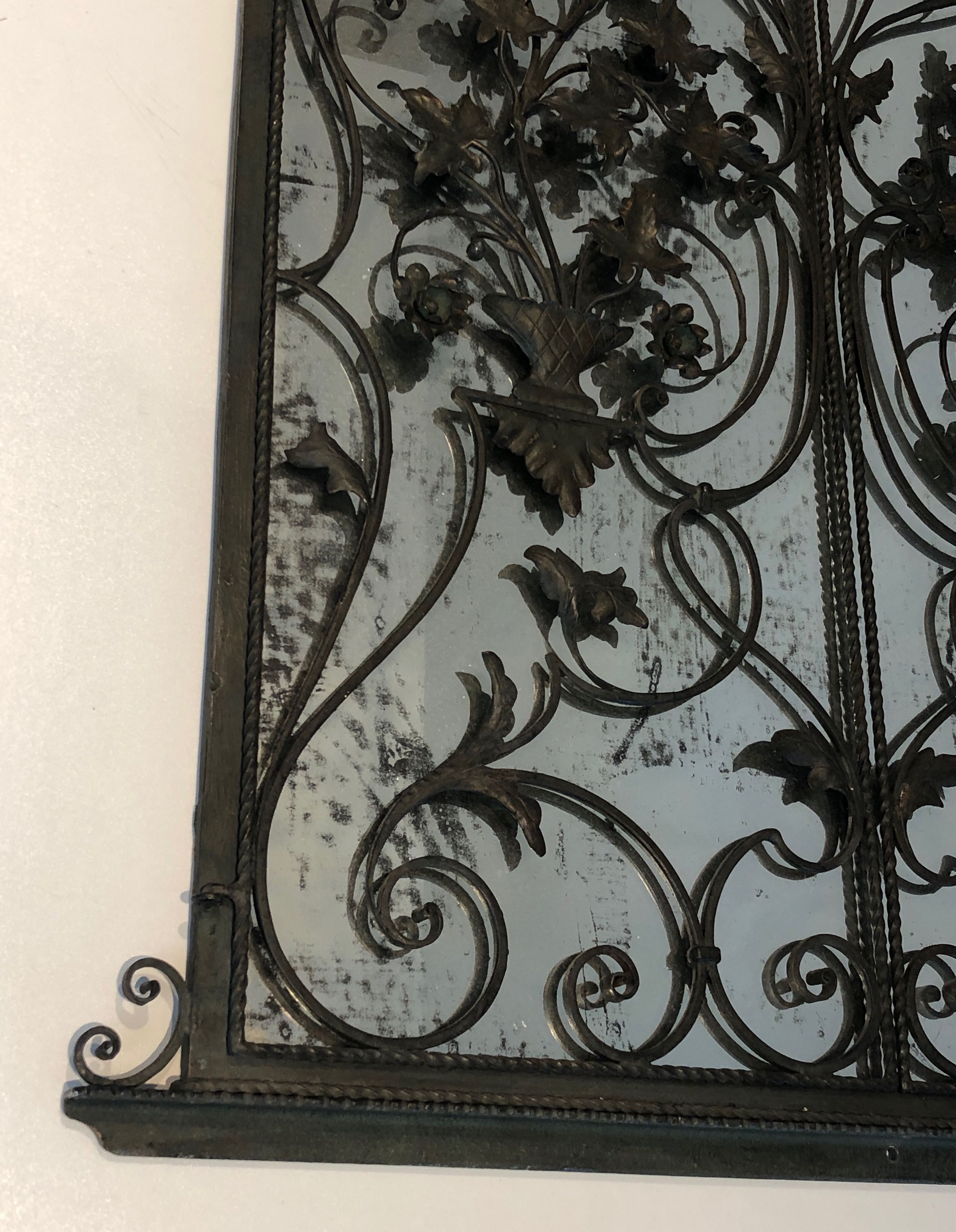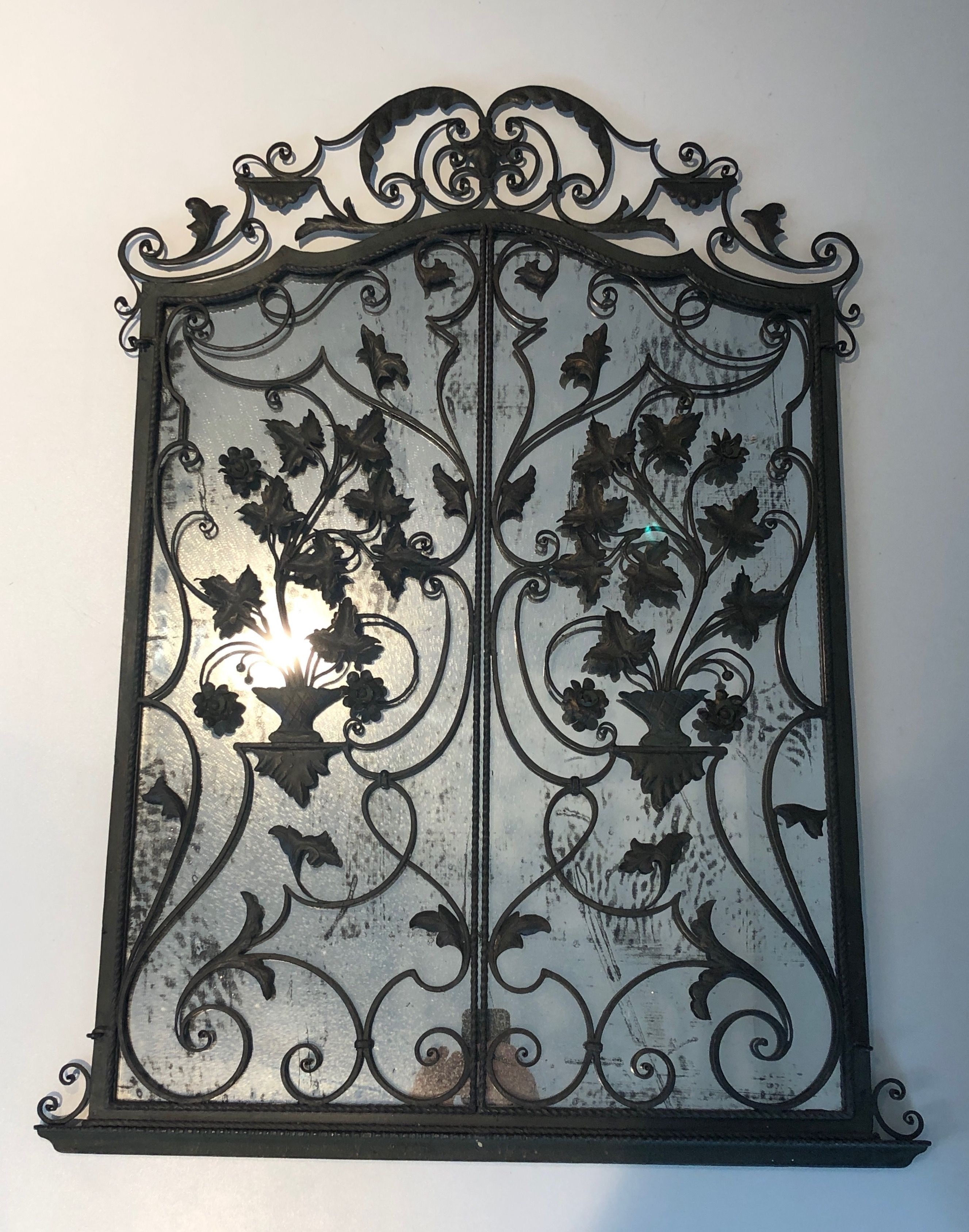 The creation of ornamental wrought iron objects — including mirrors, consoles, and screens — reached its apex in France during the 1920s to 1940s, a period that saw the revival of historic smithing techniques alongside the influence of Art Deco and Modernist aesthetics. Eminent craftsmen such as Edgar Brandt, Raymond Subes, and Gilbert Poillerat elevated ferronnerie d'art to the level of fine art, producing objects of great complexity and beauty for prestigious private and public commissions. A two-panel mirror of this type is particularly unusual and suggests the work of a skilled atelier catering to a discerning clientele.