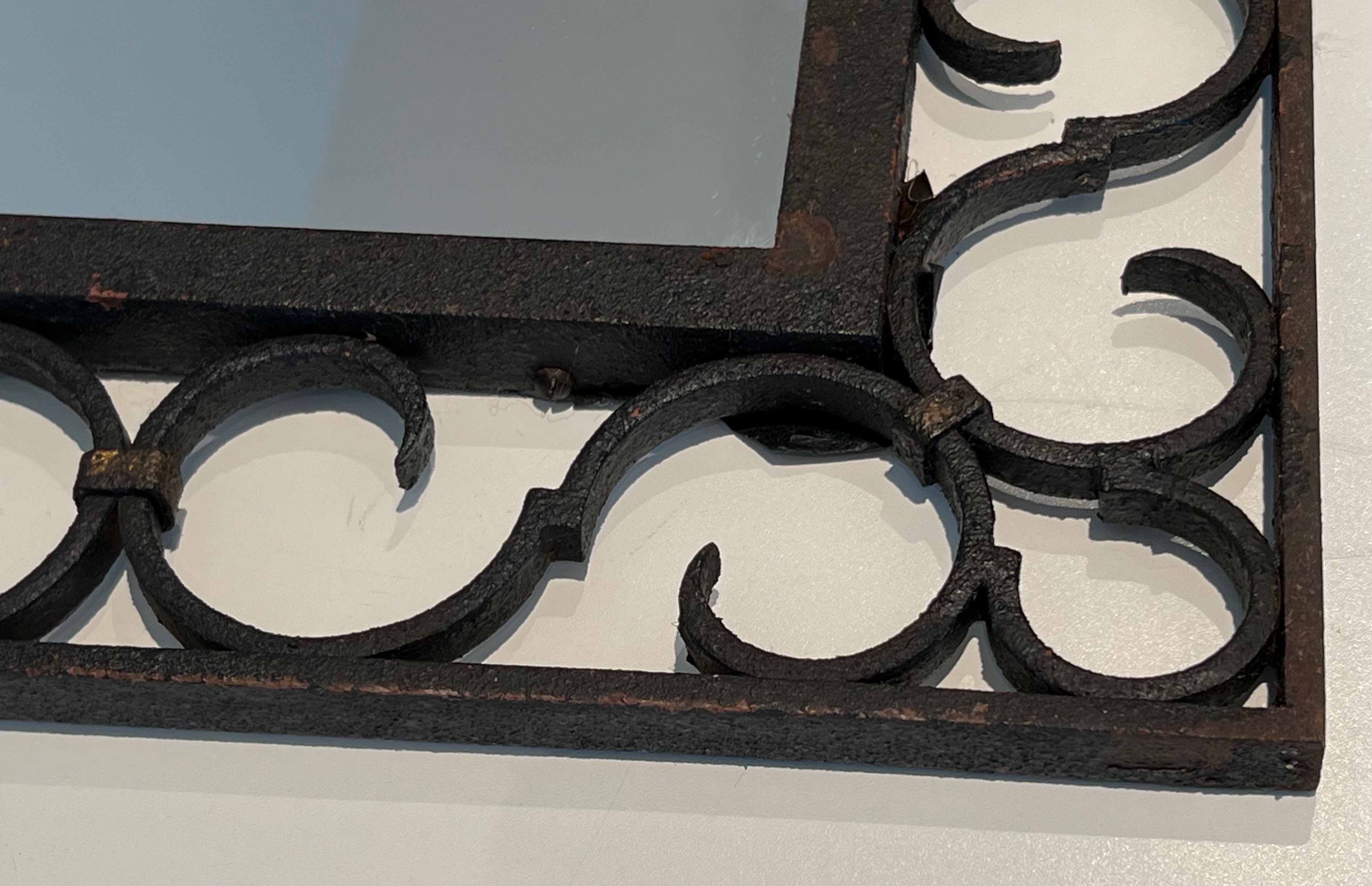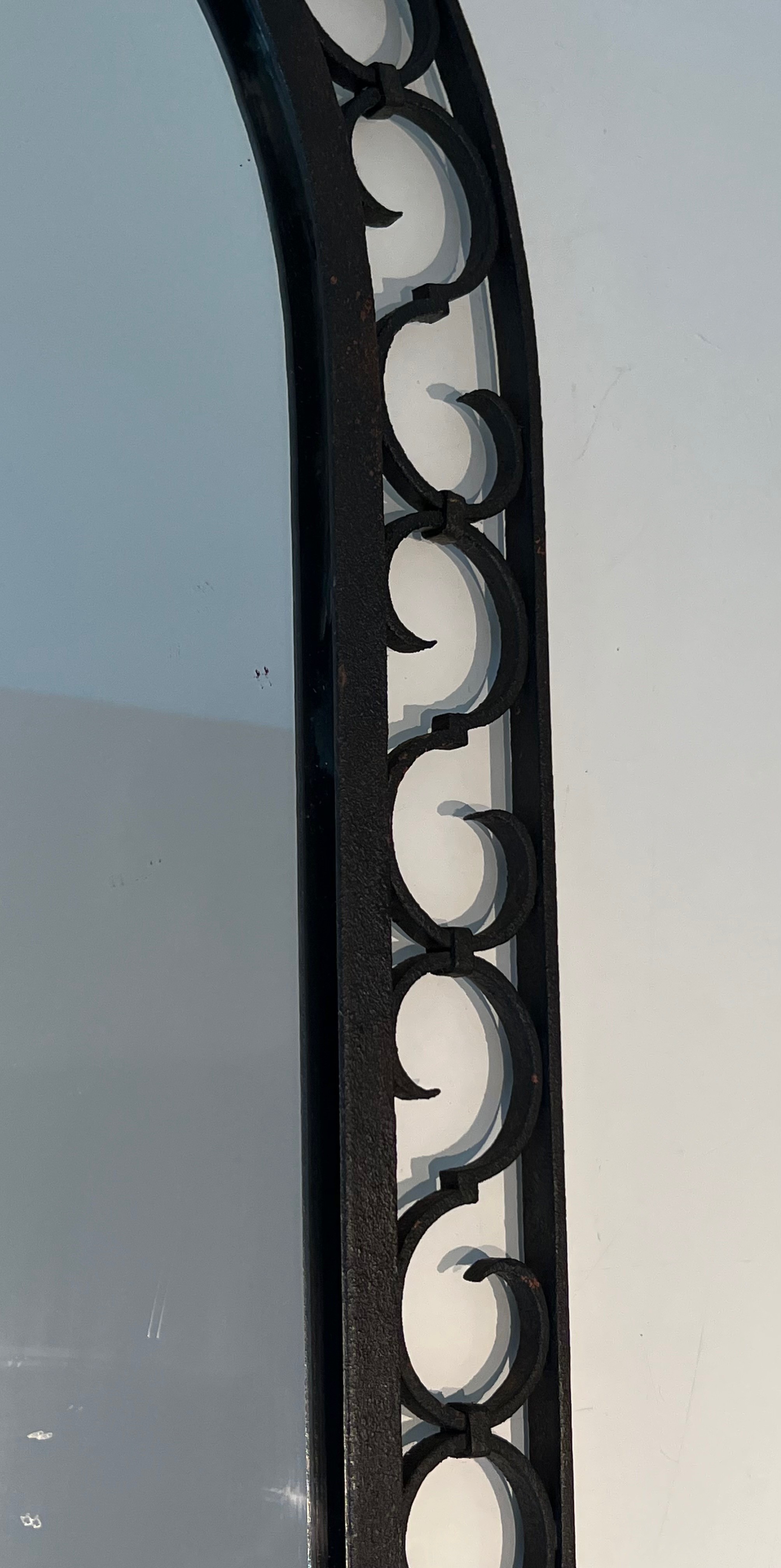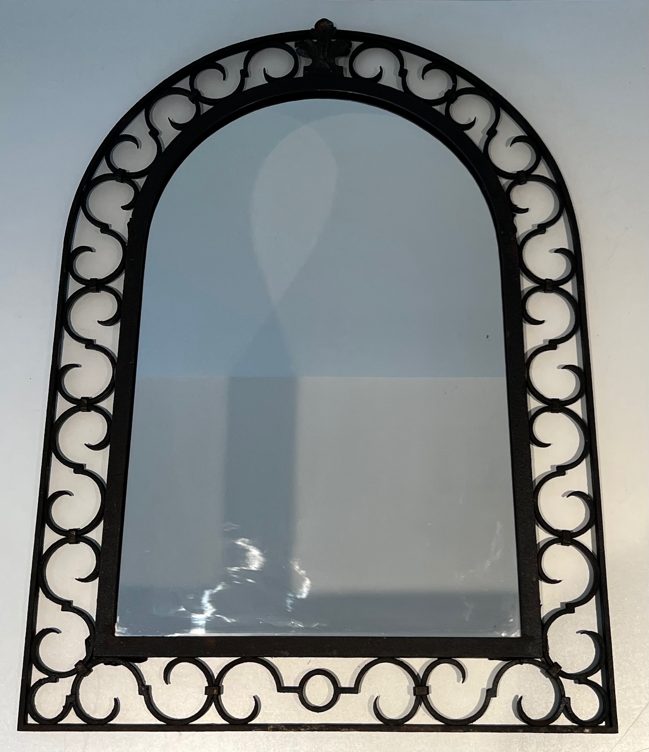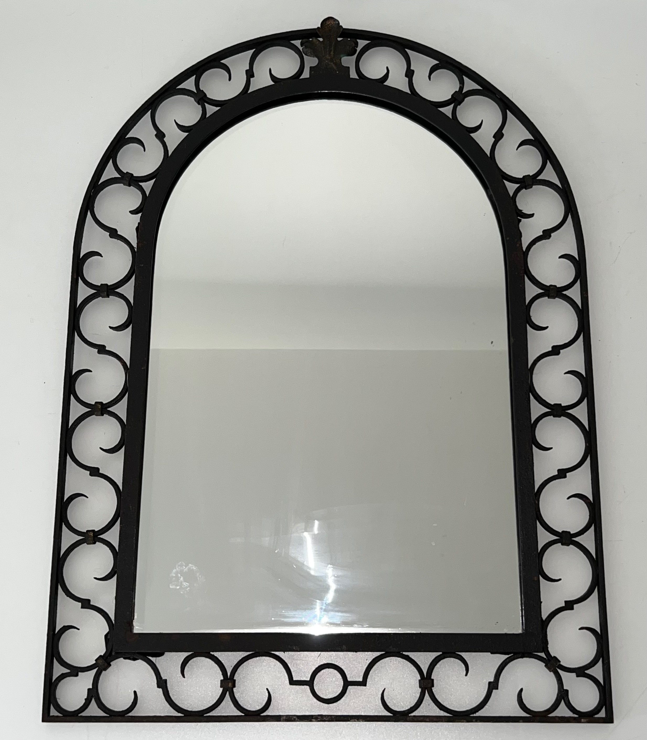 This mirror would make a distinguished and versatile decorative addition to virtually any interior: above a fireplace, on a feature wall, in a corridor, bedroom or entrance hall, where its warm iron patina and the gleam of the gilded acanthus would introduce a note of historical character and artisanal quality. Its arched form ensures harmonious integration in both period-furnished rooms and more contemporary settings. A charming and characteristic example of French artisanal ironwork at its most refined.