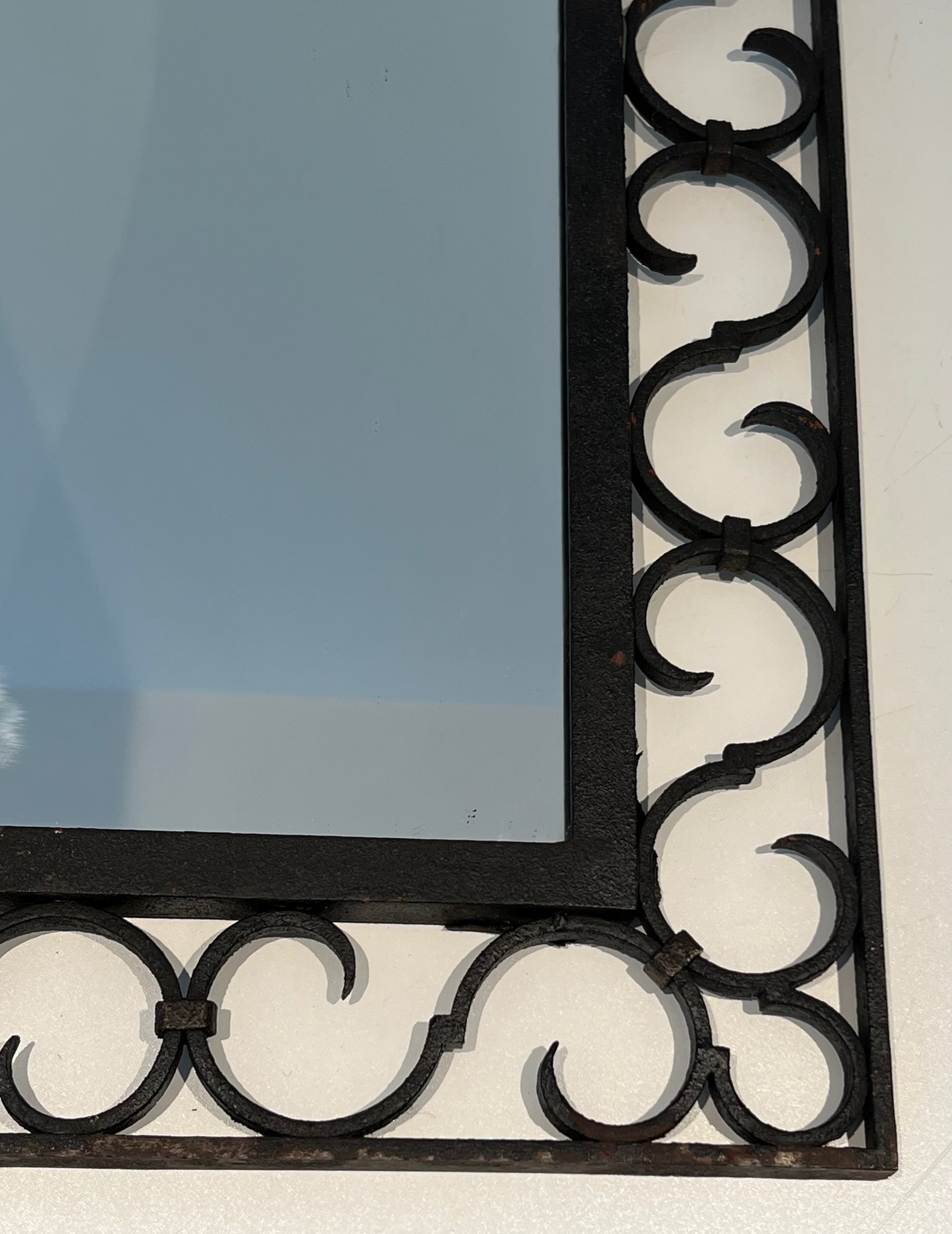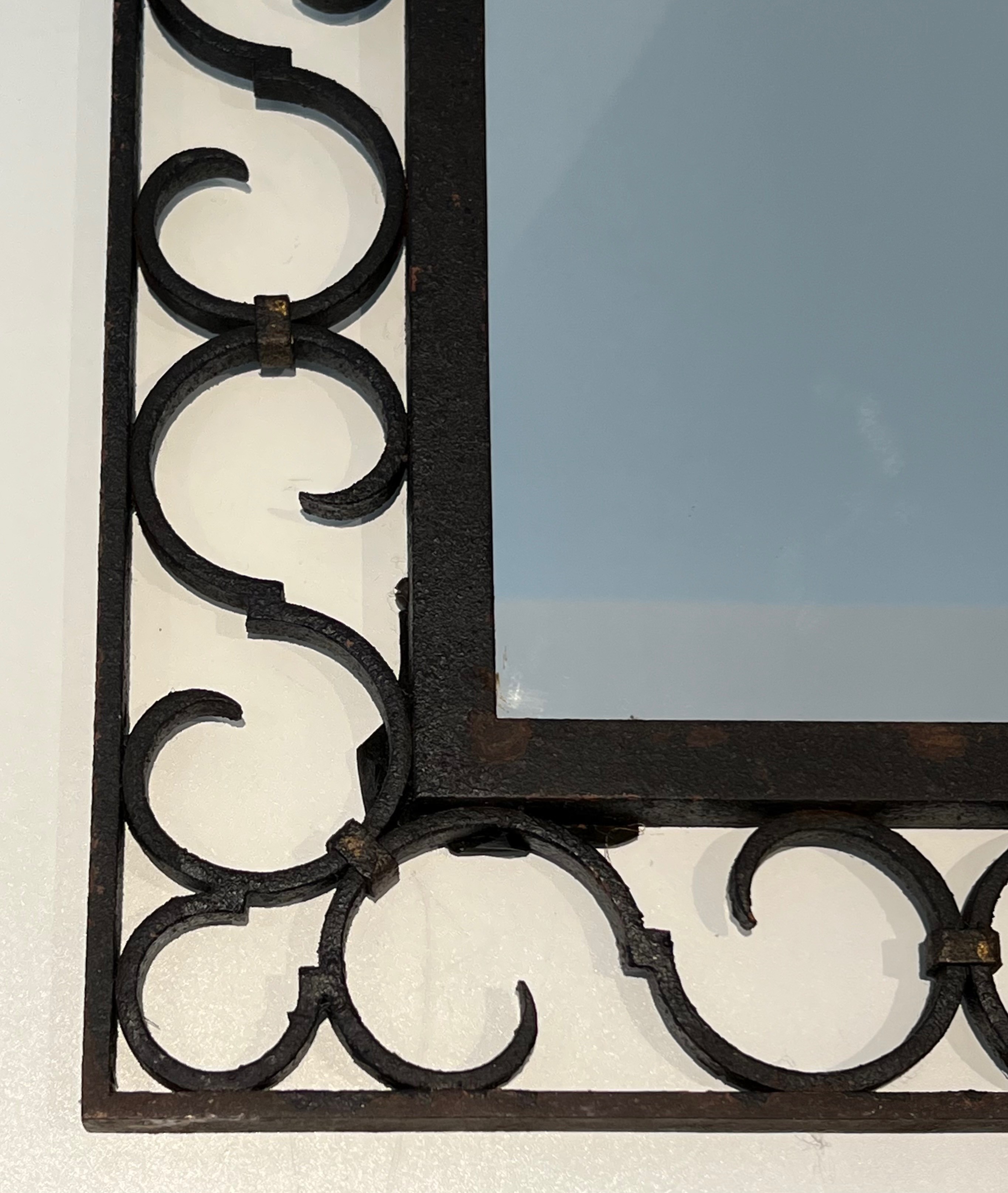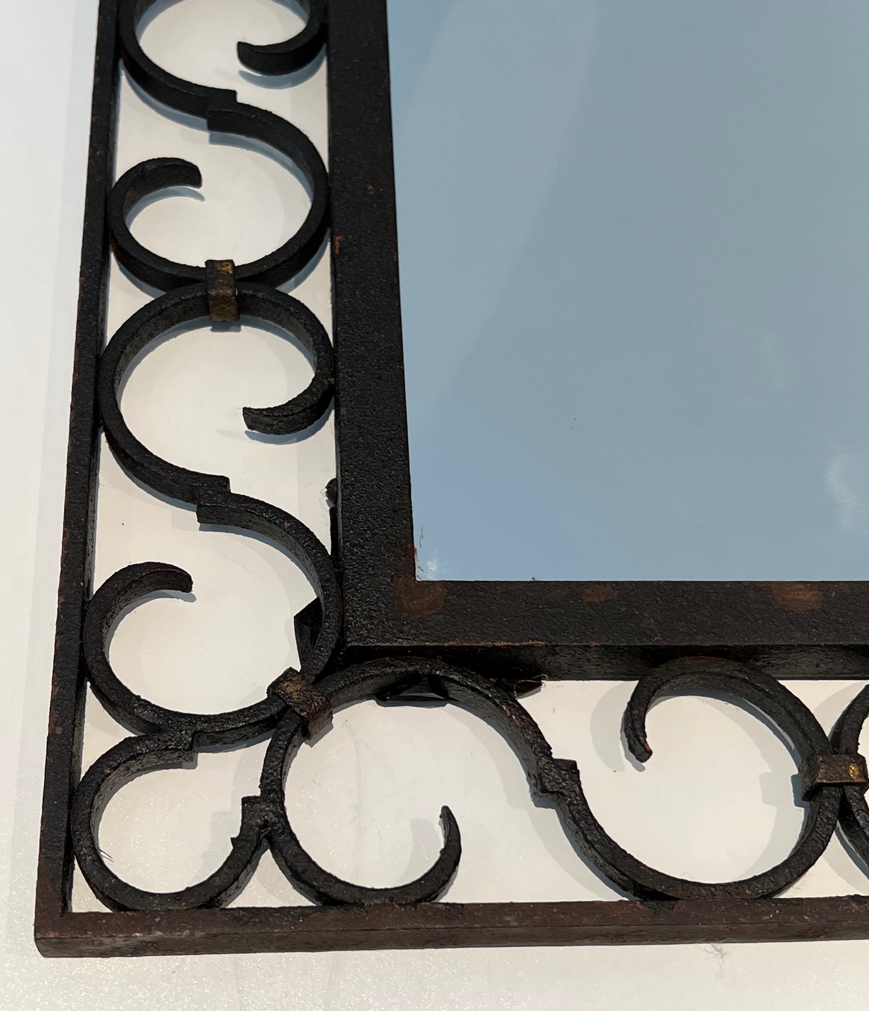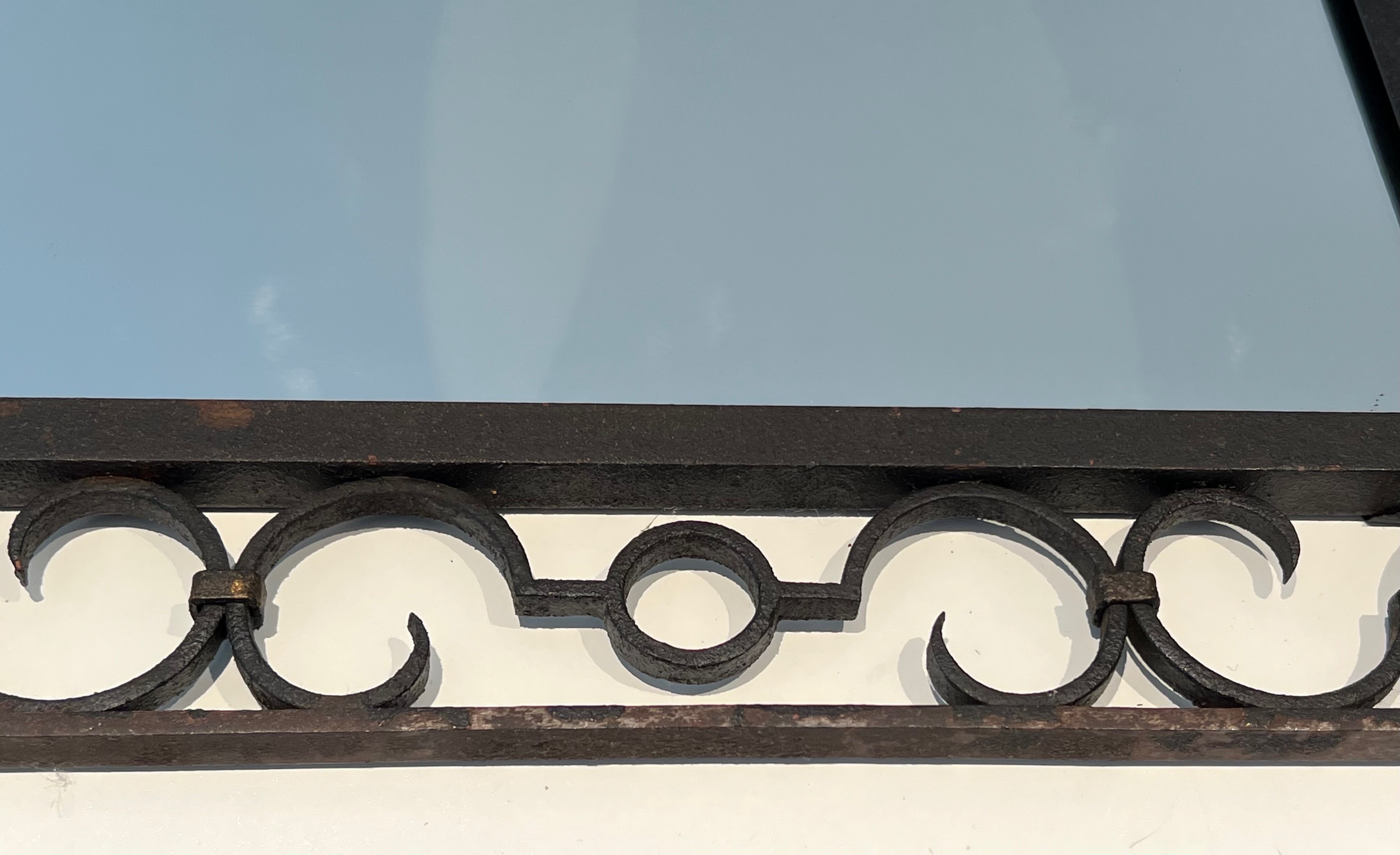 This mirror would make a distinguished and versatile decorative addition to virtually any interior: above a fireplace, on a feature wall, in a corridor, bedroom or entrance hall, where its warm iron patina and the gleam of the gilded acanthus would introduce a note of historical character and artisanal quality. Its arched form ensures harmonious integration in both period-furnished rooms and more contemporary settings. A charming and characteristic example of French artisanal ironwork at its most refined.