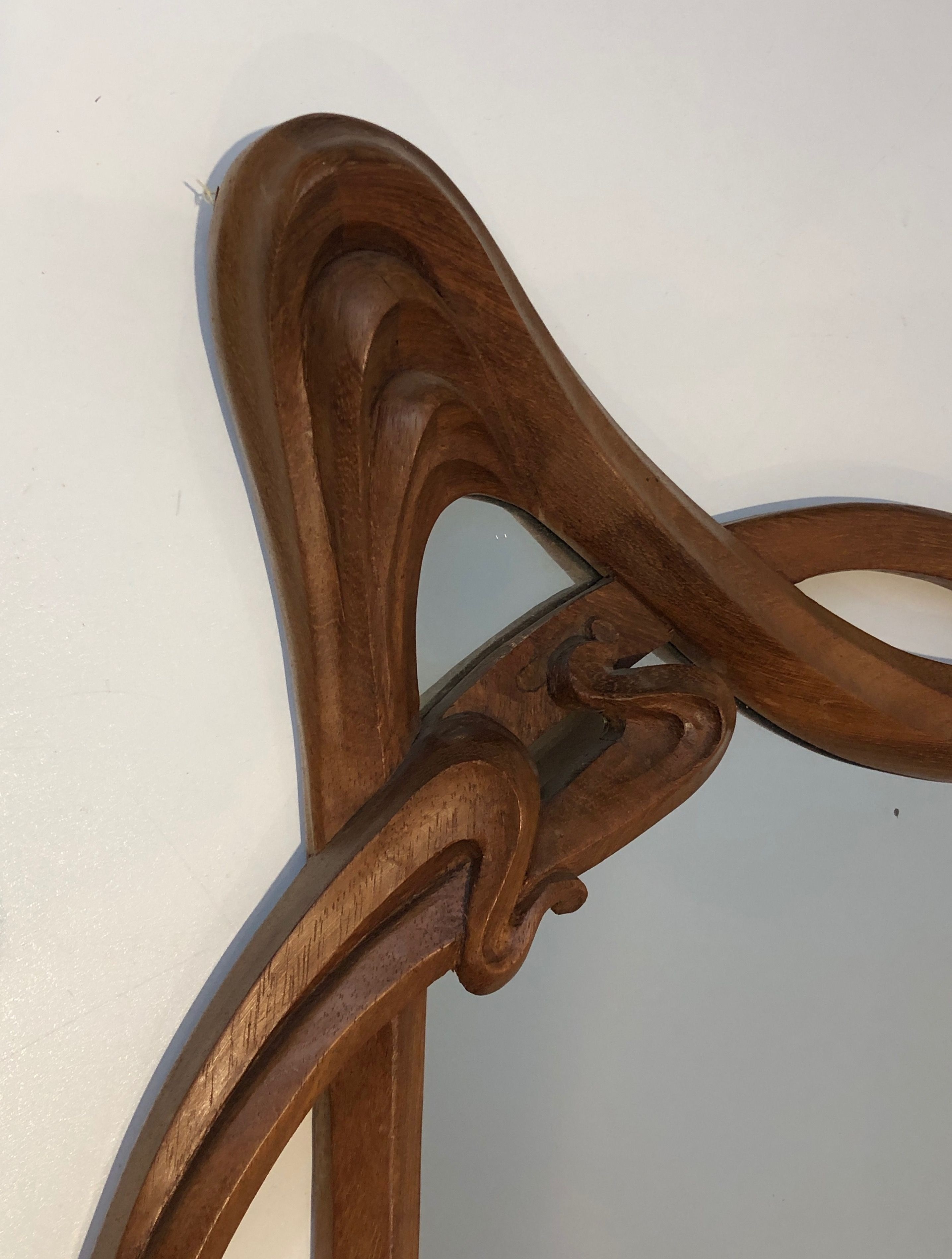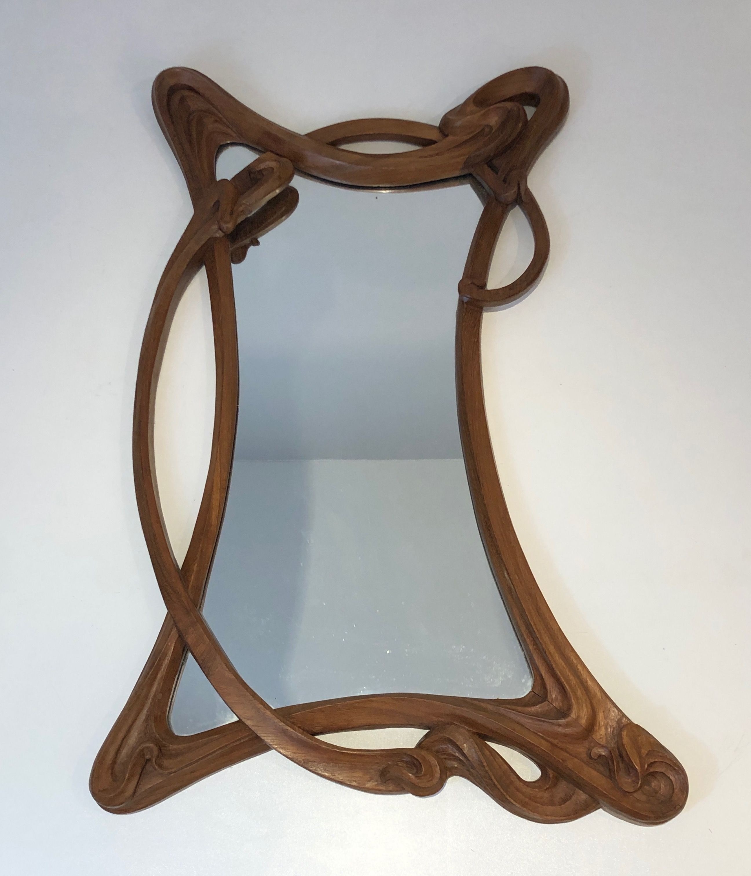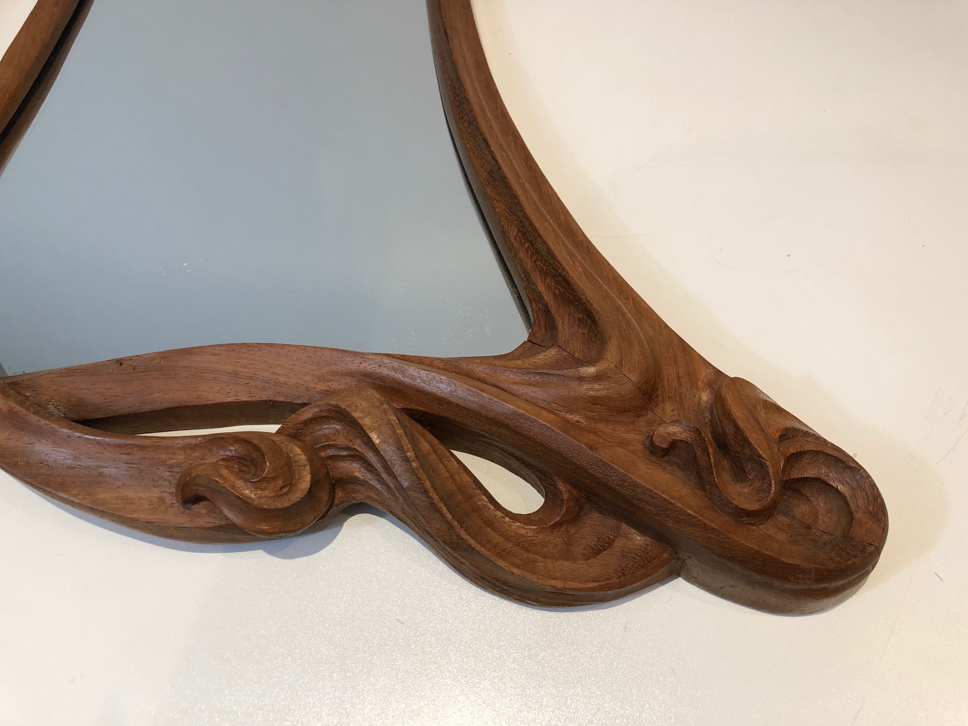 This Art Nouveau mirror is crafted in richly grained walnut, its frame sculpted with the flowing, naturalistic motifs that define the style at its most eloquent. Sinuous curves, stylized leaf forms, and organic ornament cascade around the glass with fluid grace, the composition unified by the warm, sculpted depth of the wood itself. The patina of the aged walnut enhances the sculptural quality of the carving, while the original mirror plate retains its period character, with the subtle warmth of aged silvering lending the piece an irreplaceable authenticity.