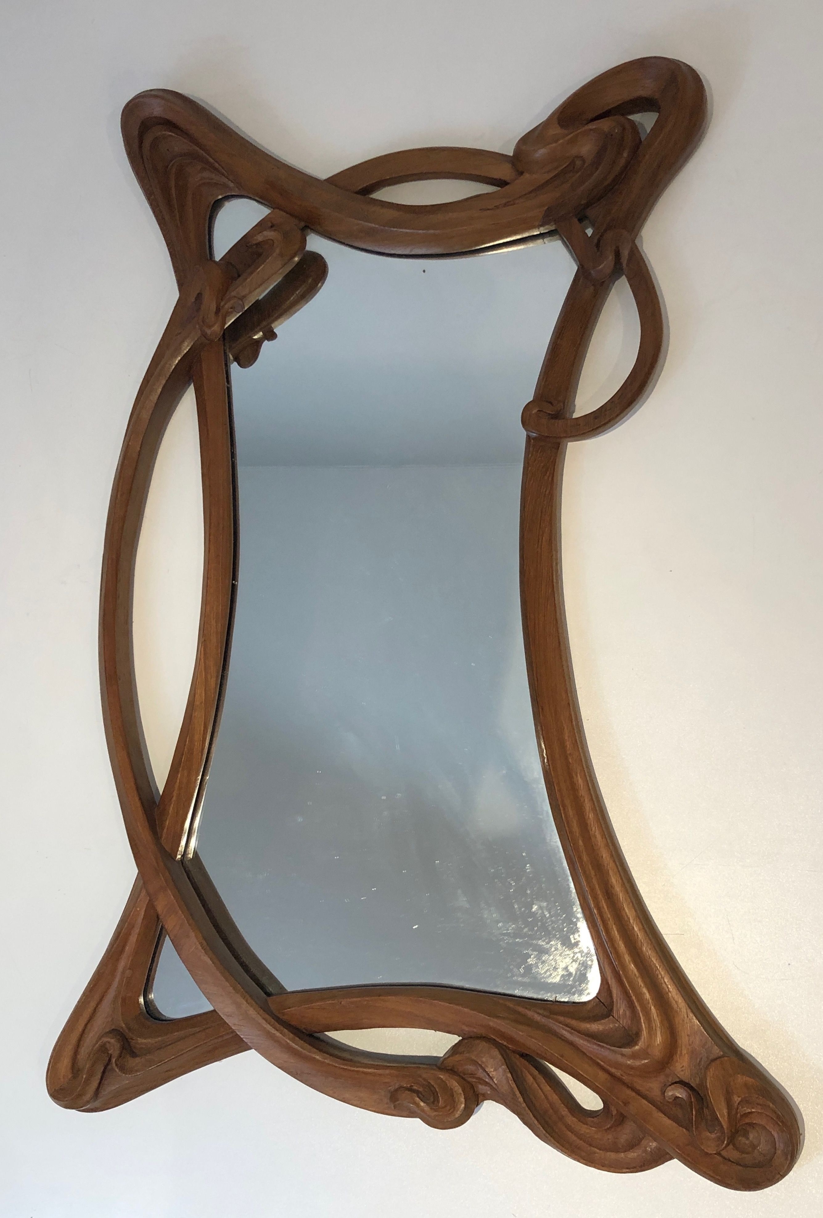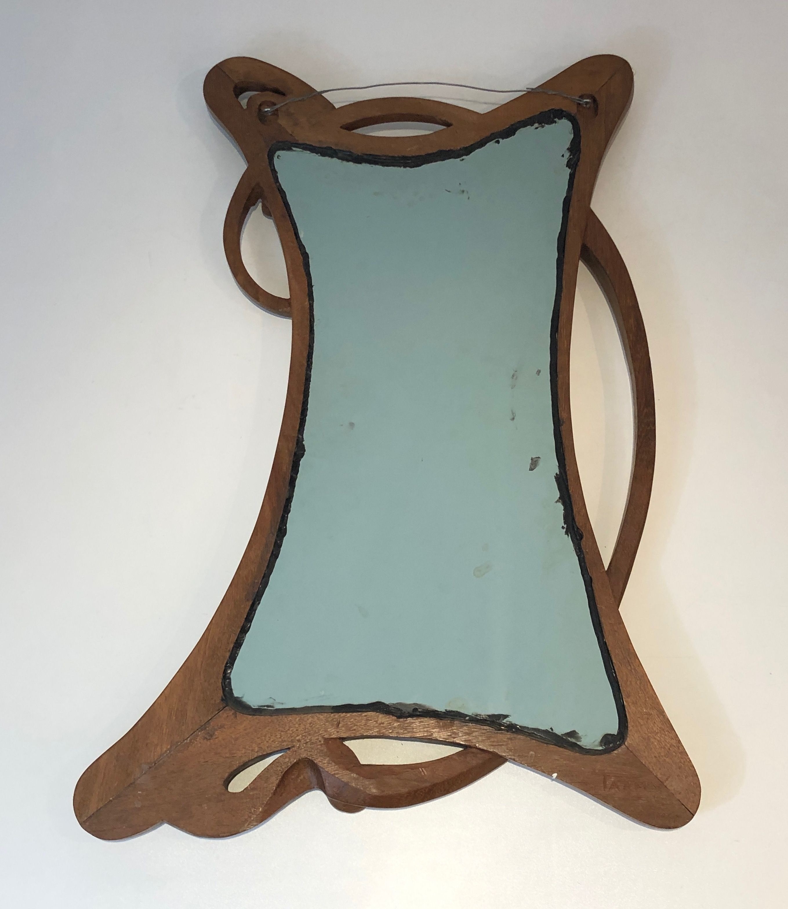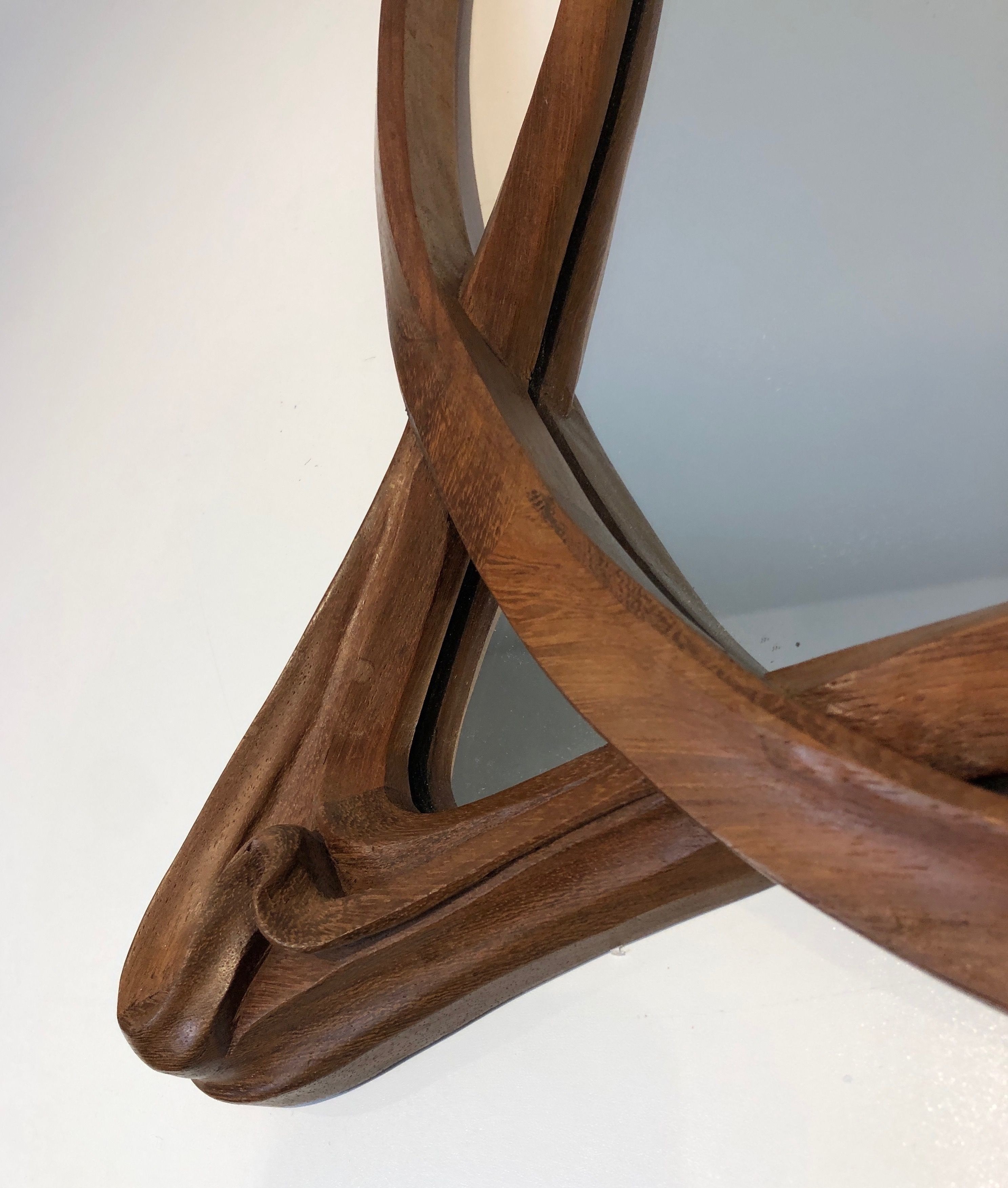 This Art Nouveau mirror is crafted in richly grained walnut, its frame sculpted with the flowing, naturalistic motifs that define the style at its most eloquent. Sinuous curves, stylized leaf forms, and organic ornament cascade around the glass with fluid grace, the composition unified by the warm, sculpted depth of the wood itself. The patina of the aged walnut enhances the sculptural quality of the carving, while the original mirror plate retains its period character, with the subtle warmth of aged silvering lending the piece an irreplaceable authenticity.