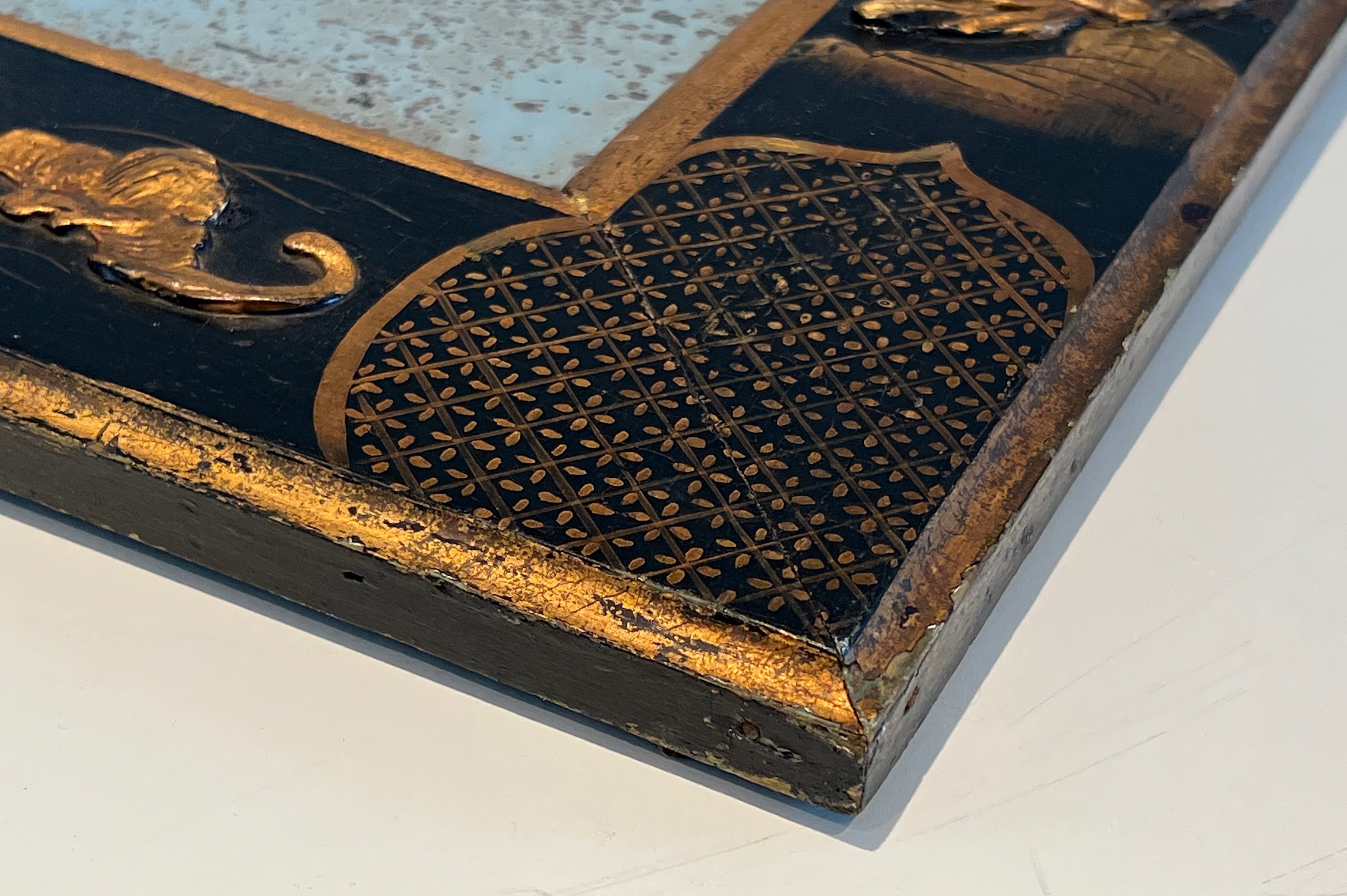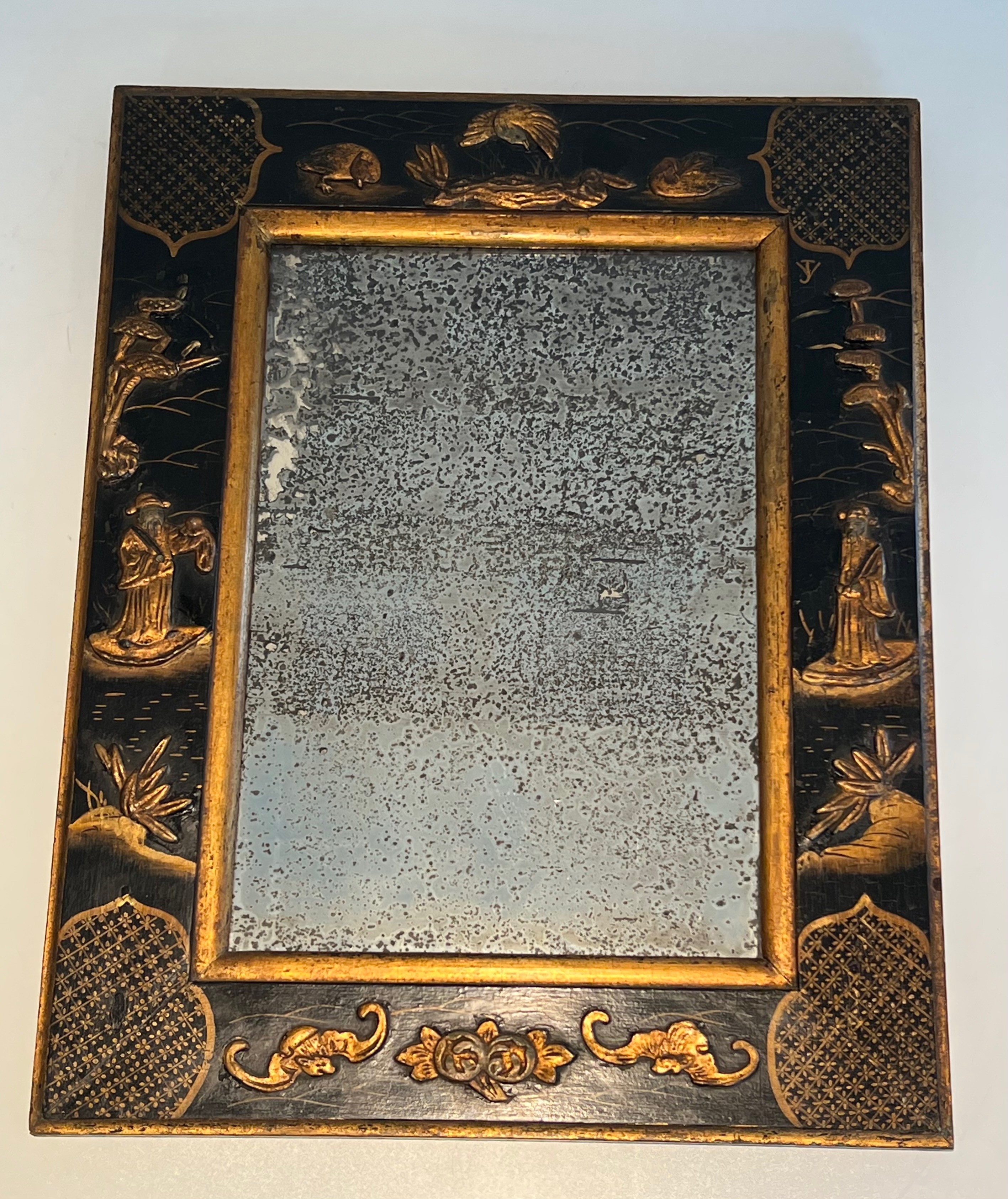 Lacquer and Gilding Mirror with Chinese Scenes. The mirror is a mercury mirror. French work in the style of Maison Jansen. Circa 1940