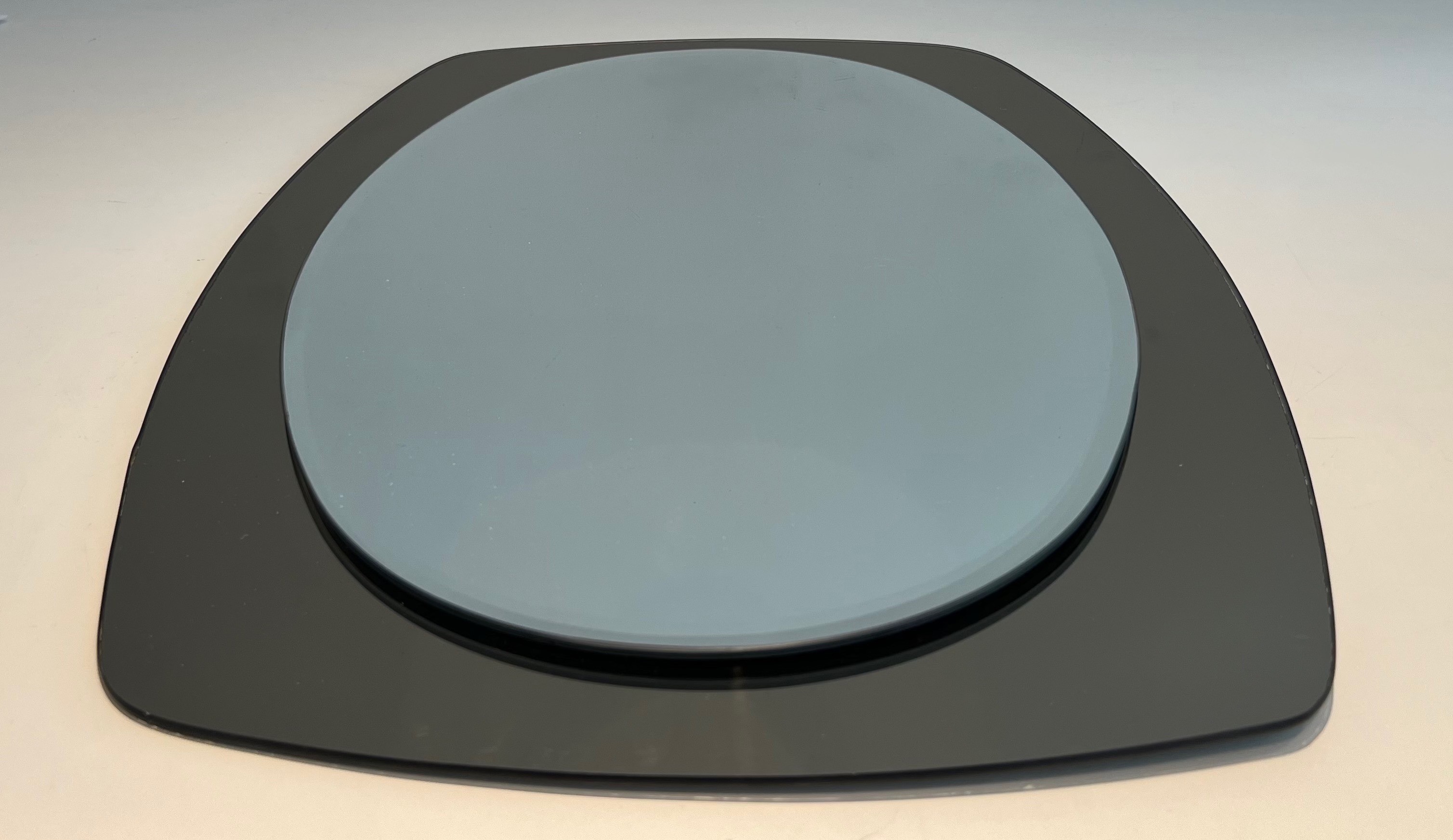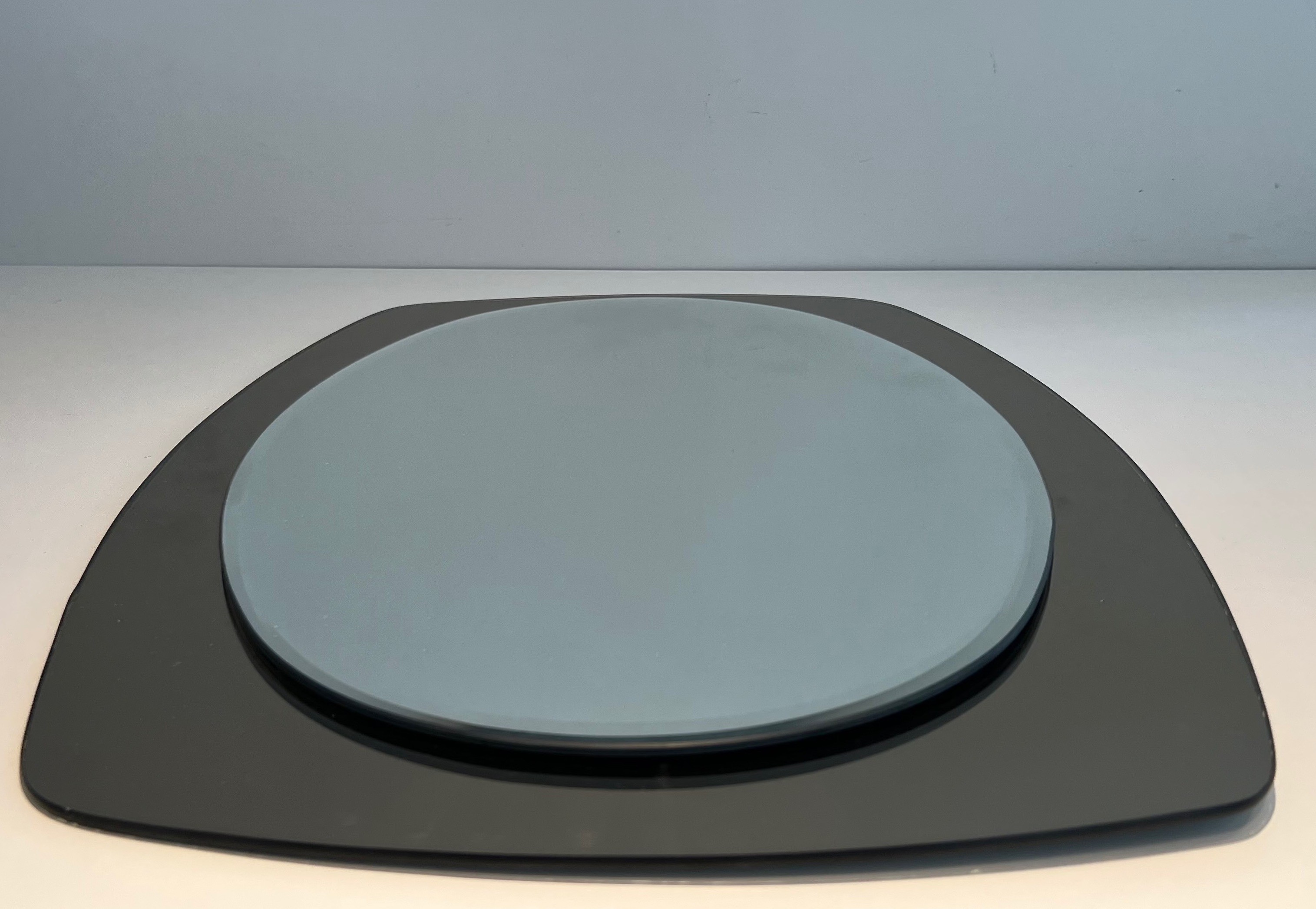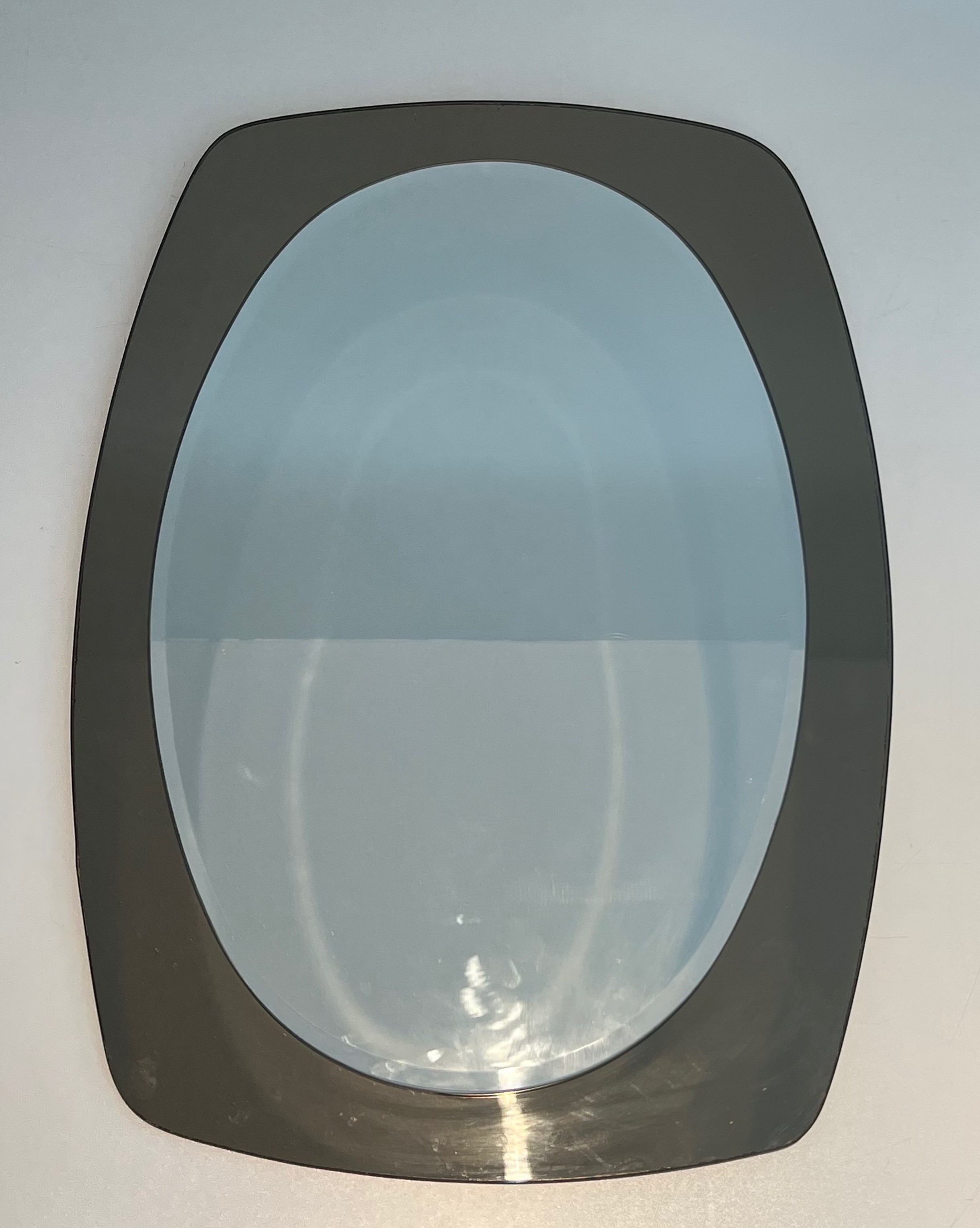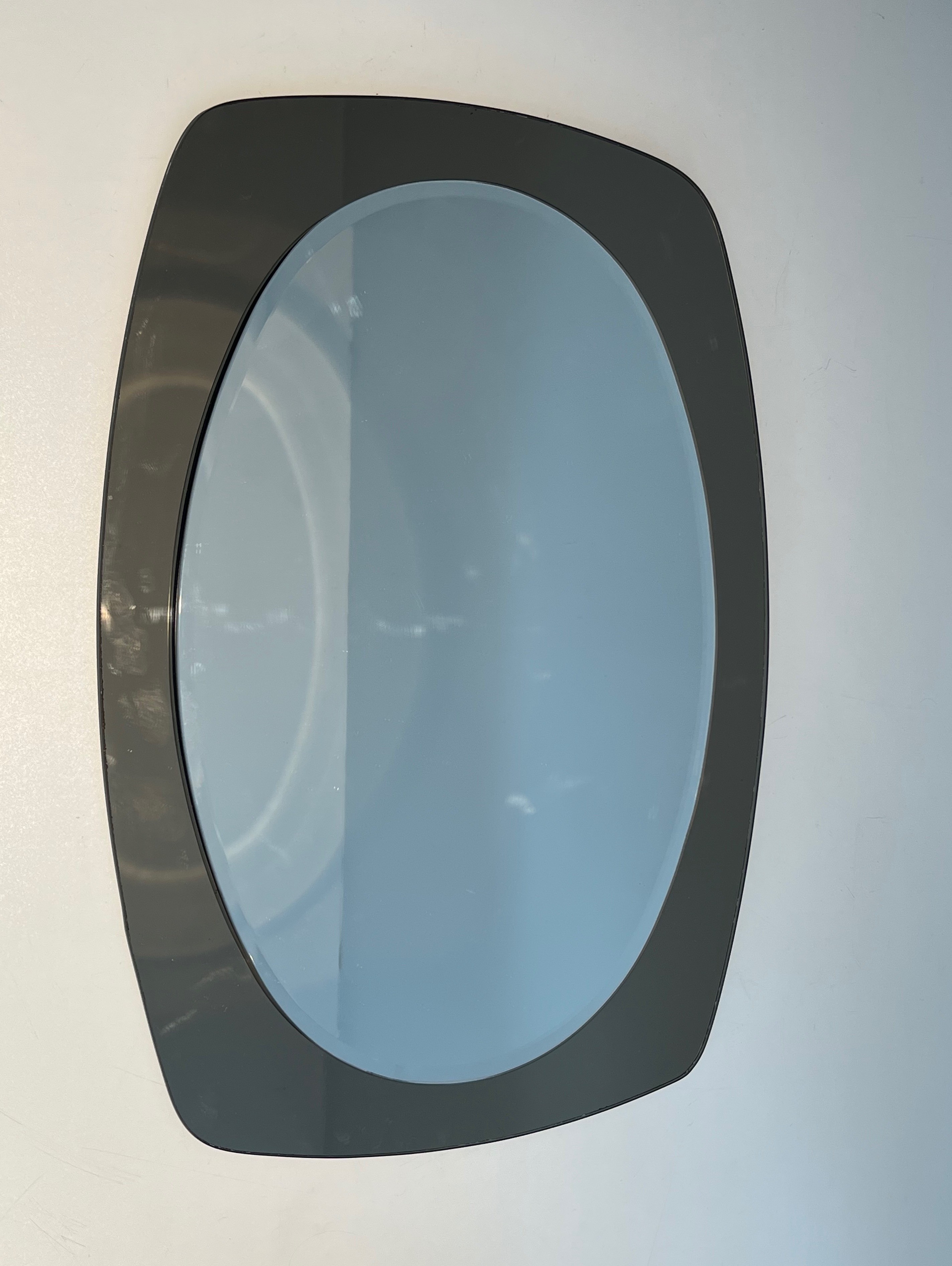 This oval mirror, composed of a clear mirrored centre framed by a surround of smoked mirror glass, is an elegant creation by Fontana Arte — the celebrated Milanese glass manufacturer and design house that since its founding in 1932 has been synonymous with the finest tradition of Italian craftsmanship in glass and mirror work. Associated in its early years with the visionary architect Gio Ponti, and producing objects designed by Pietro Chiesa and other great names of Italian design, Fontana Arte represents the gold standard of Italian luxury glass.
