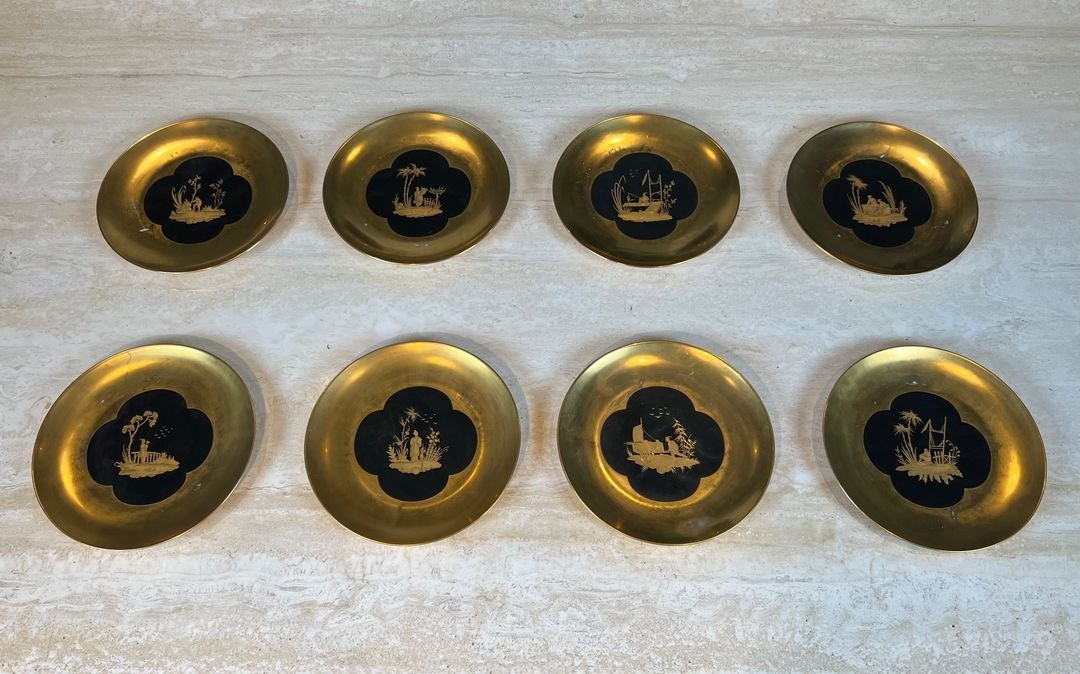 The black and gold palette places these plates within the long French tradition of lacquer-inspired table decoration, traceable from the imports of laque de Chine in the 17th century through the chinoiserie craze of the Rococo period and its successive revivals. The mid-20th century saw a renewed appetite for this aesthetic, particularly in the Parisian luxury interior furnishing trade, where black-ground porcelain with gold chinoiserie remained an unmistakable mark of refinement and cosmopolitan taste.