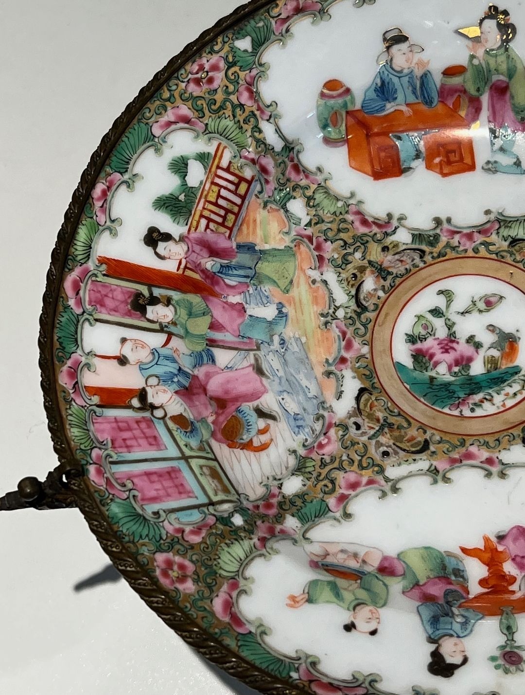 Canton Famille Rose Porcelain Plate with Court Scenes on a Bronze Stand, China, 19th Century