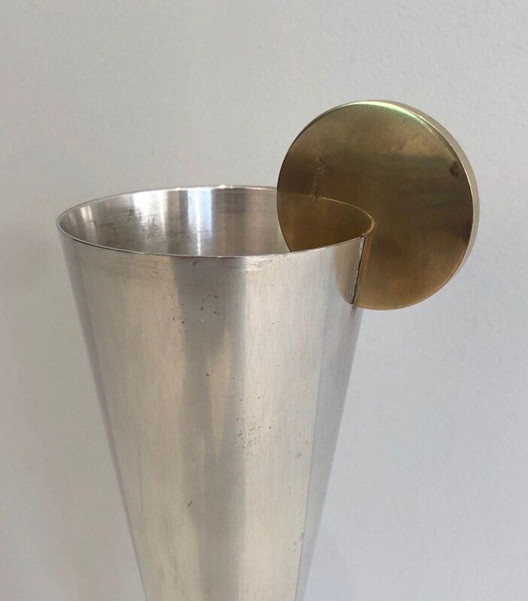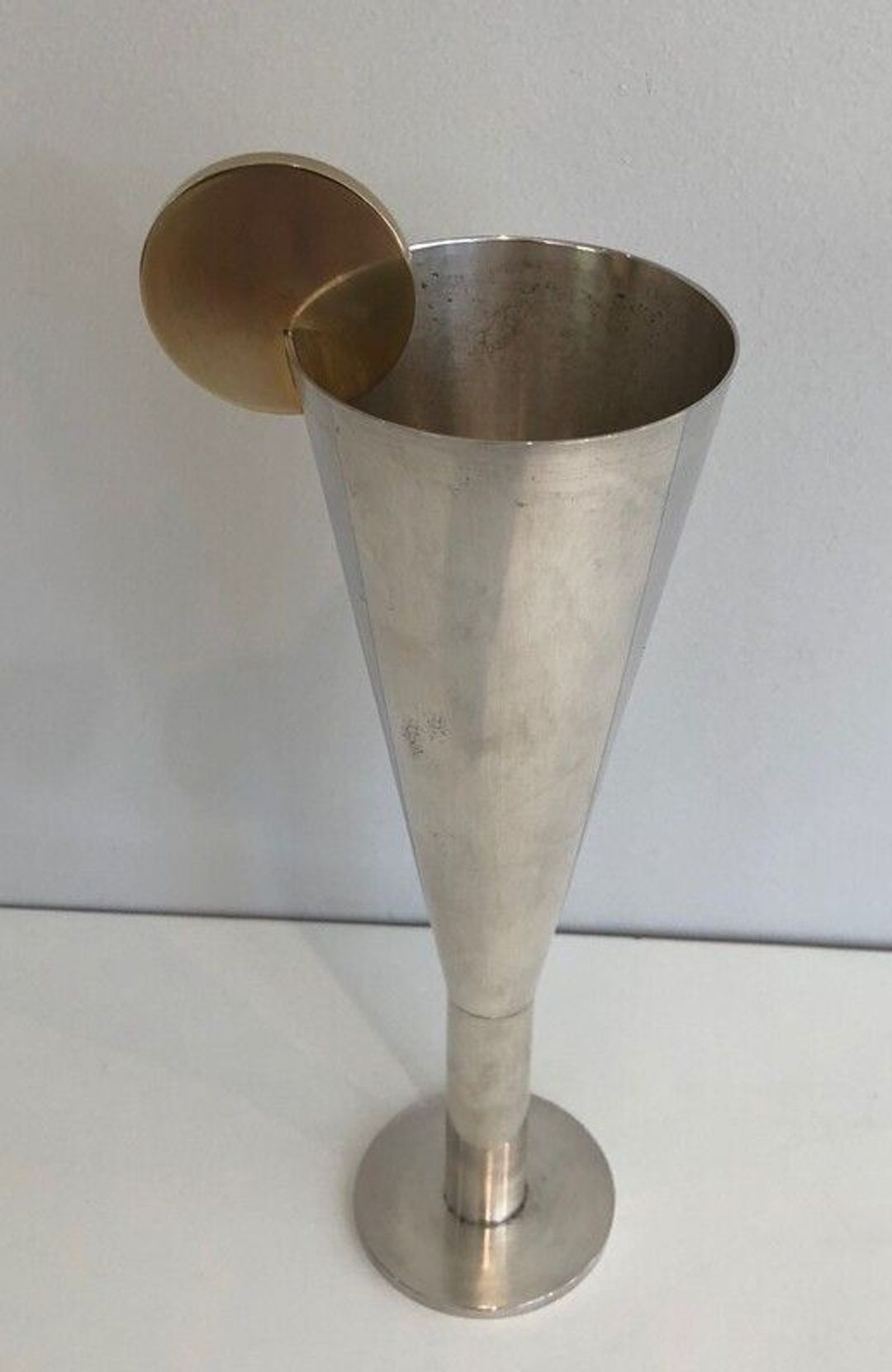 This cocktail flute by A. Pozzi of Padova is a piece of pure sculptural geometry. The silver-plated cup is formed as a perfect inverted cone — its sides absolutely straight, its walls smooth and polished — rising from a slender cylindrical stem to a wide, open rim. The foot is a flat circular disc, grounding the composition with confident minimalism. The entire silver-plated assembly is animated by a single bold accent: a large flat disc in polished brass set at the junction of cup and stem, its warm golden tone creating a deliberate and sophisticated chromatic contrast with the cool mirror-silver of the cone above.
