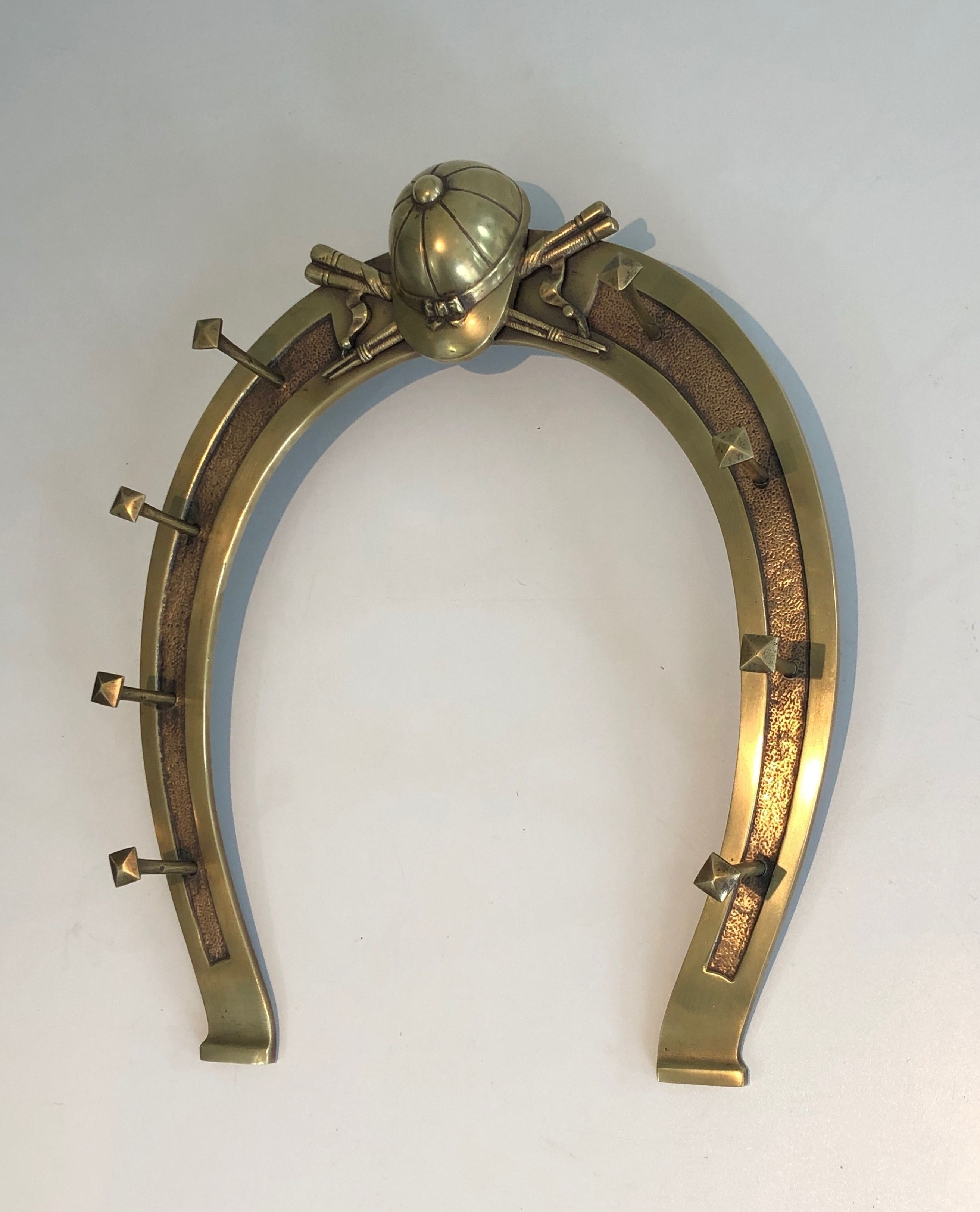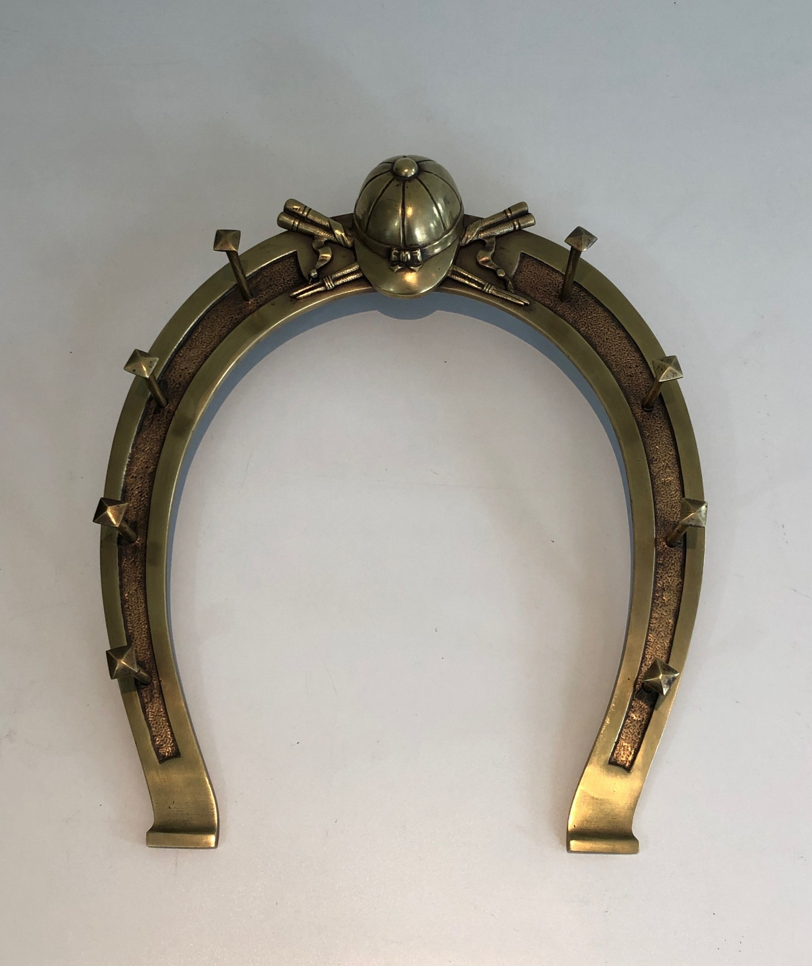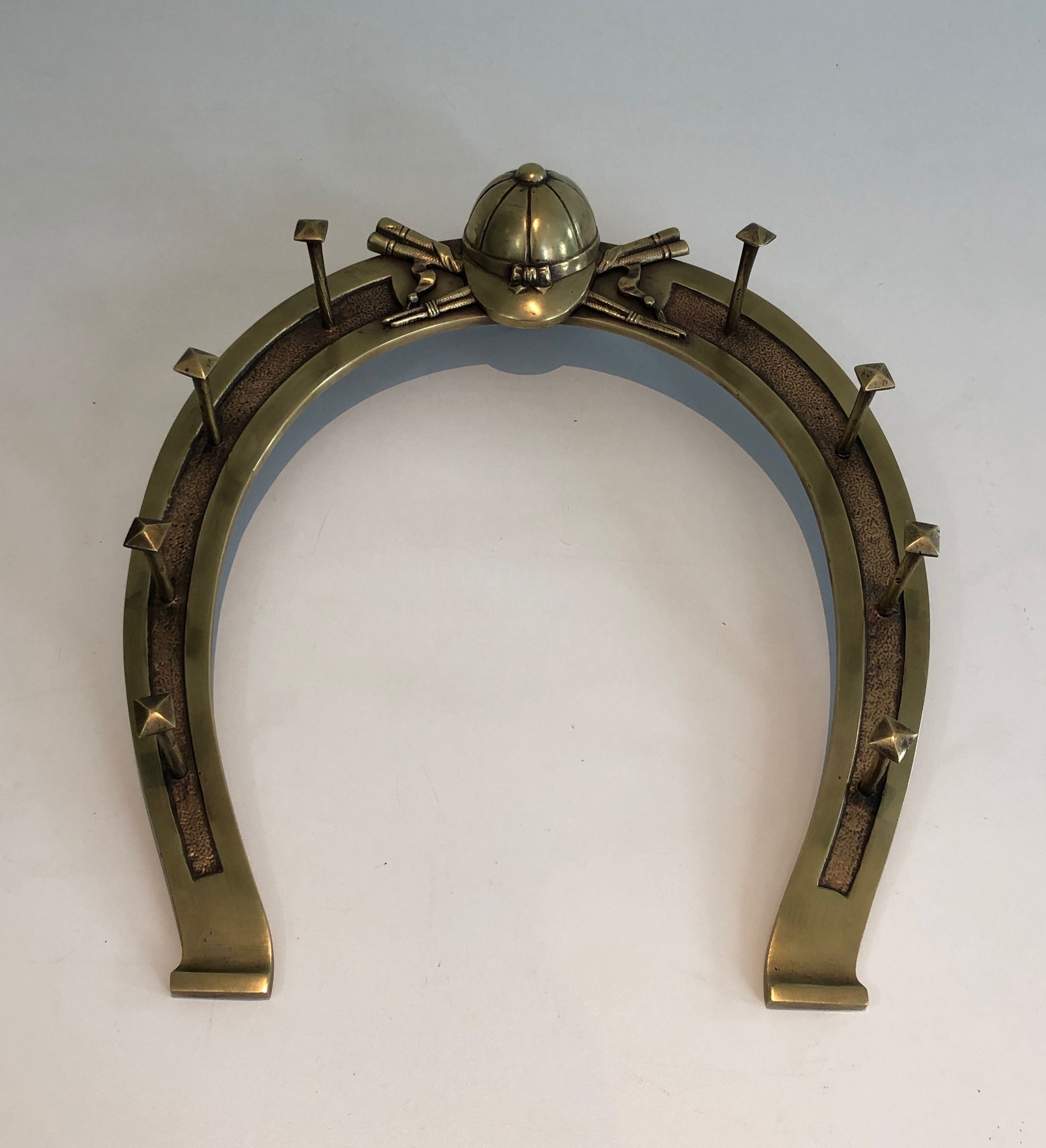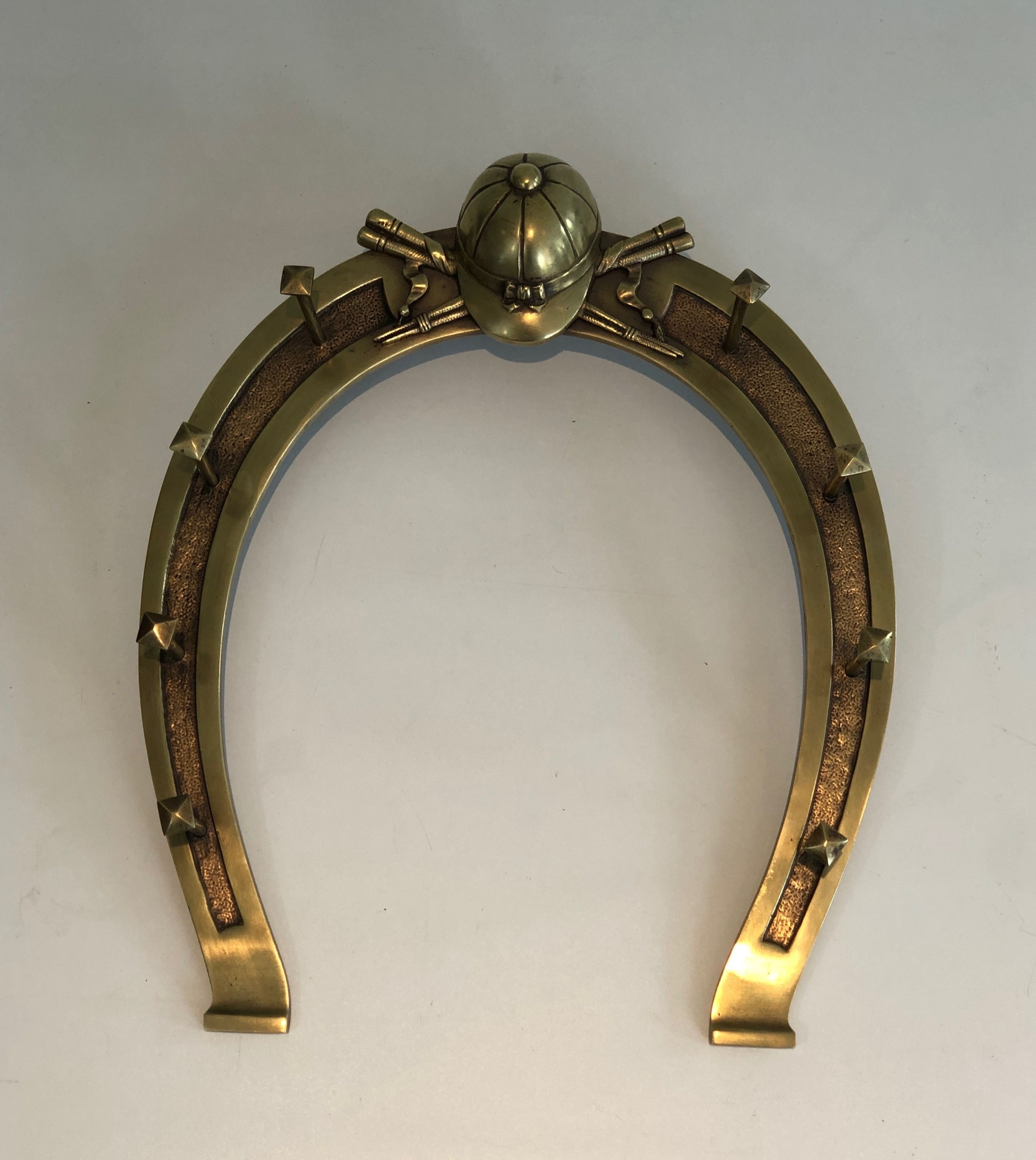 This distinctive wall-mounted holder is cast and worked in brass, its design centred on a horseshoe — that most ancient symbol of good fortune — adorned with decorative elements drawn from the vocabulary of equitation: crops, stirrups, bridles, or other riding accessories rendered with the naturalism and precision of a craftsman steeped in the equestrian tradition. Conceived to display and store riding accessories, it is both a functional object and a work of decorative art that celebrates the culture of the horse in the finest French country house tradition.