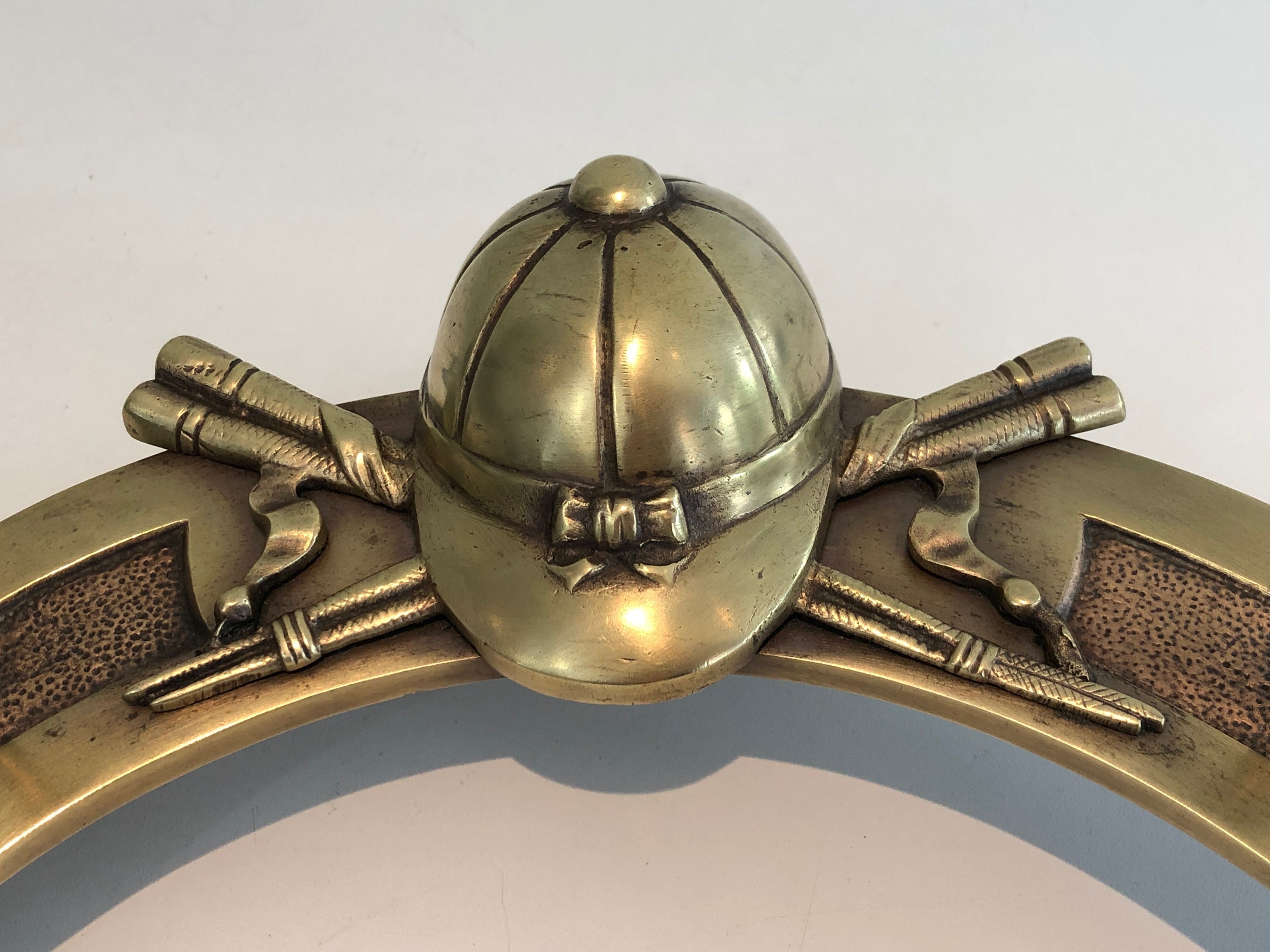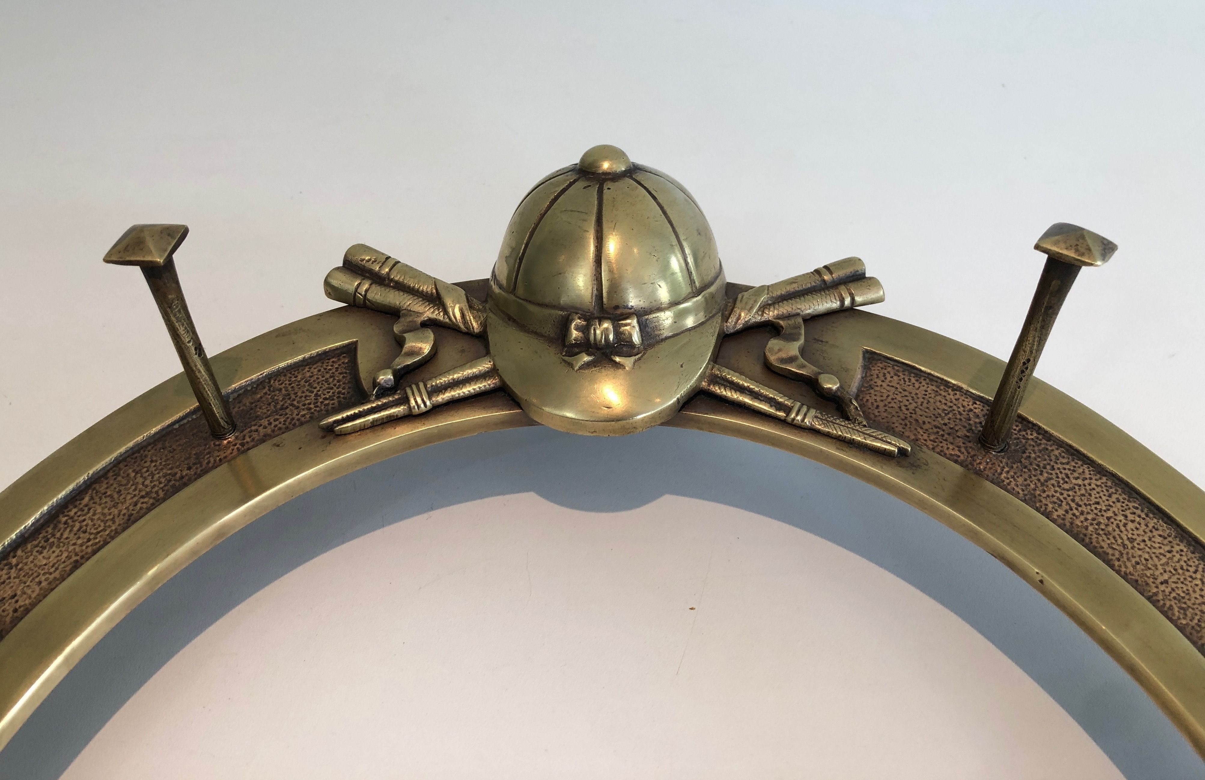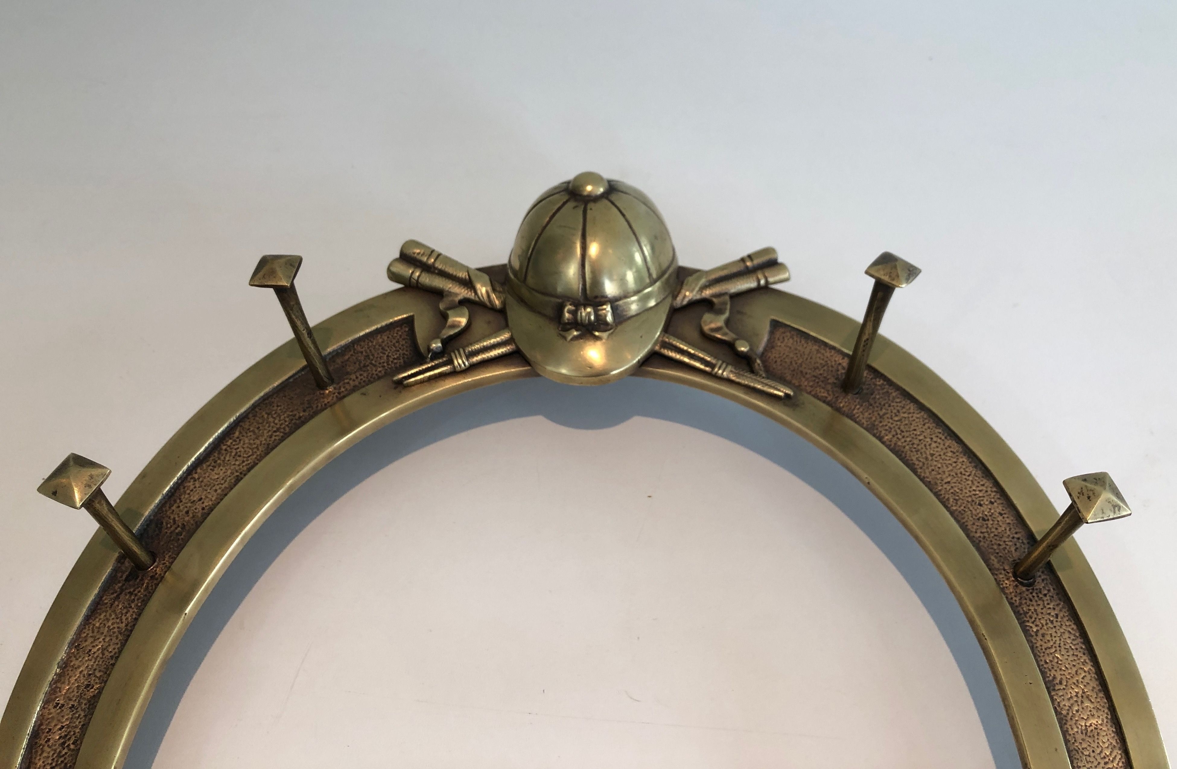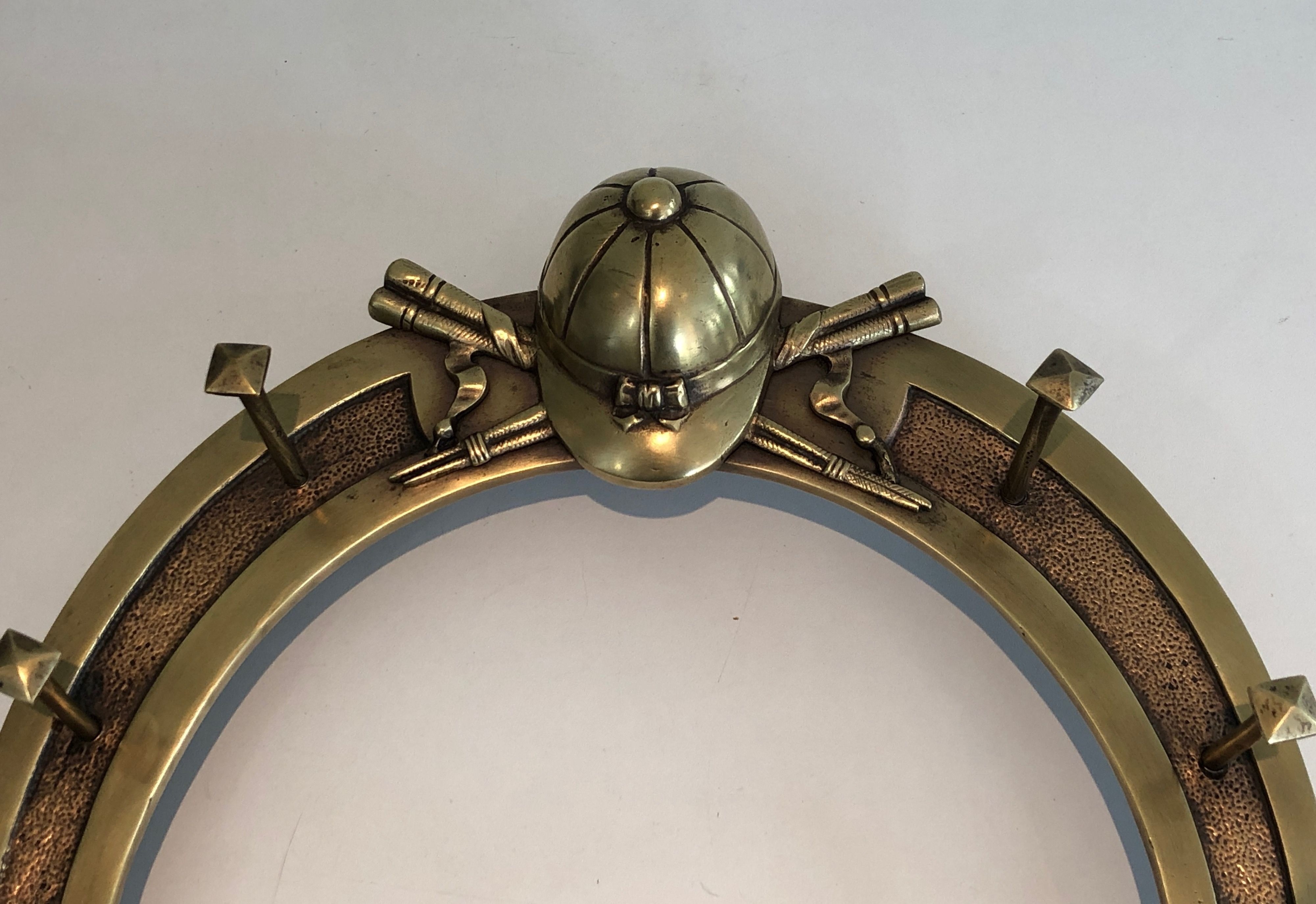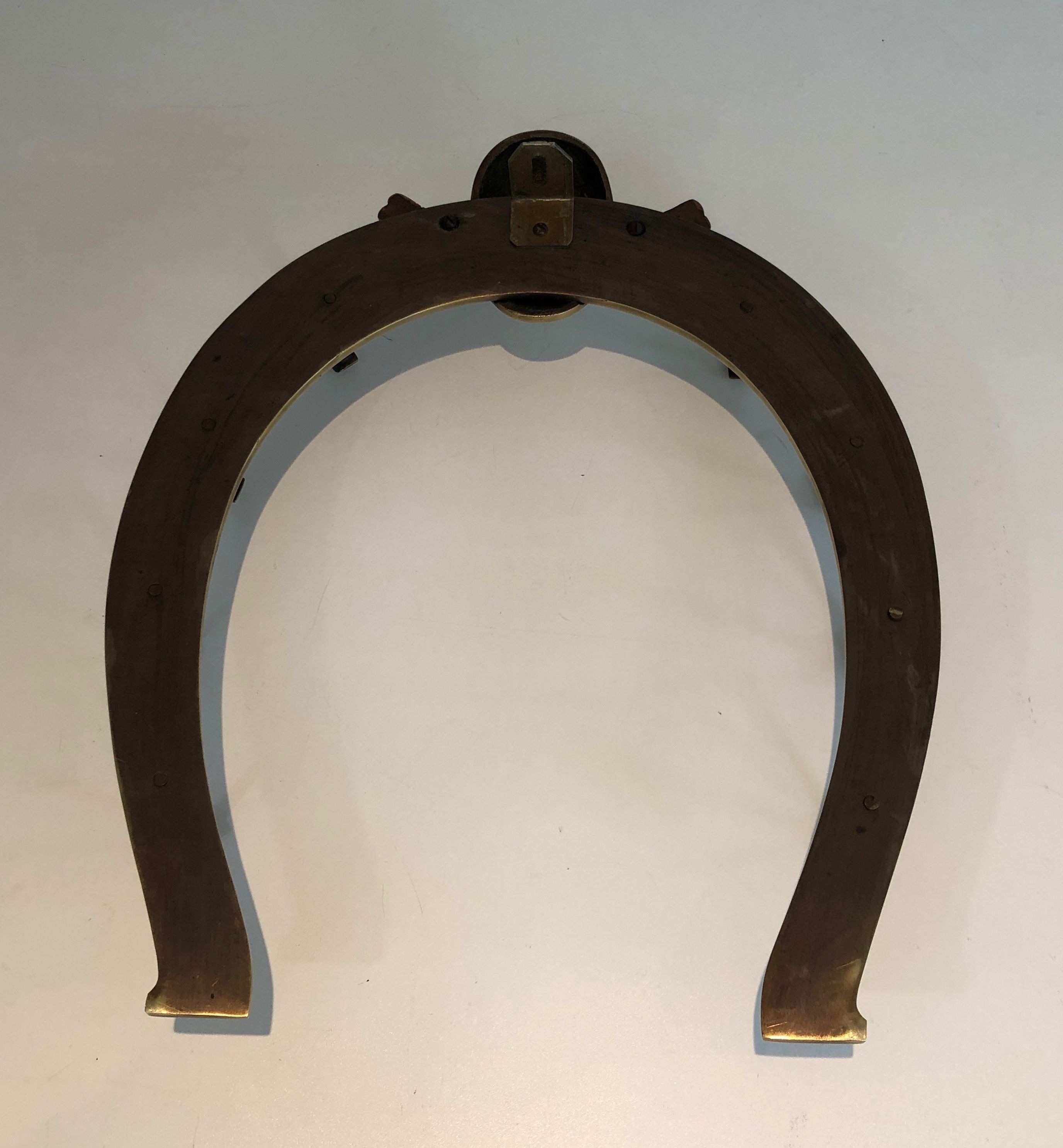 This distinctive wall-mounted holder is cast and worked in brass, its design centred on a horseshoe — that most ancient symbol of good fortune — adorned with decorative elements drawn from the vocabulary of equitation: crops, stirrups, bridles, or other riding accessories rendered with the naturalism and precision of a craftsman steeped in the equestrian tradition. Conceived to display and store riding accessories, it is both a functional object and a work of decorative art that celebrates the culture of the horse in the finest French country house tradition.