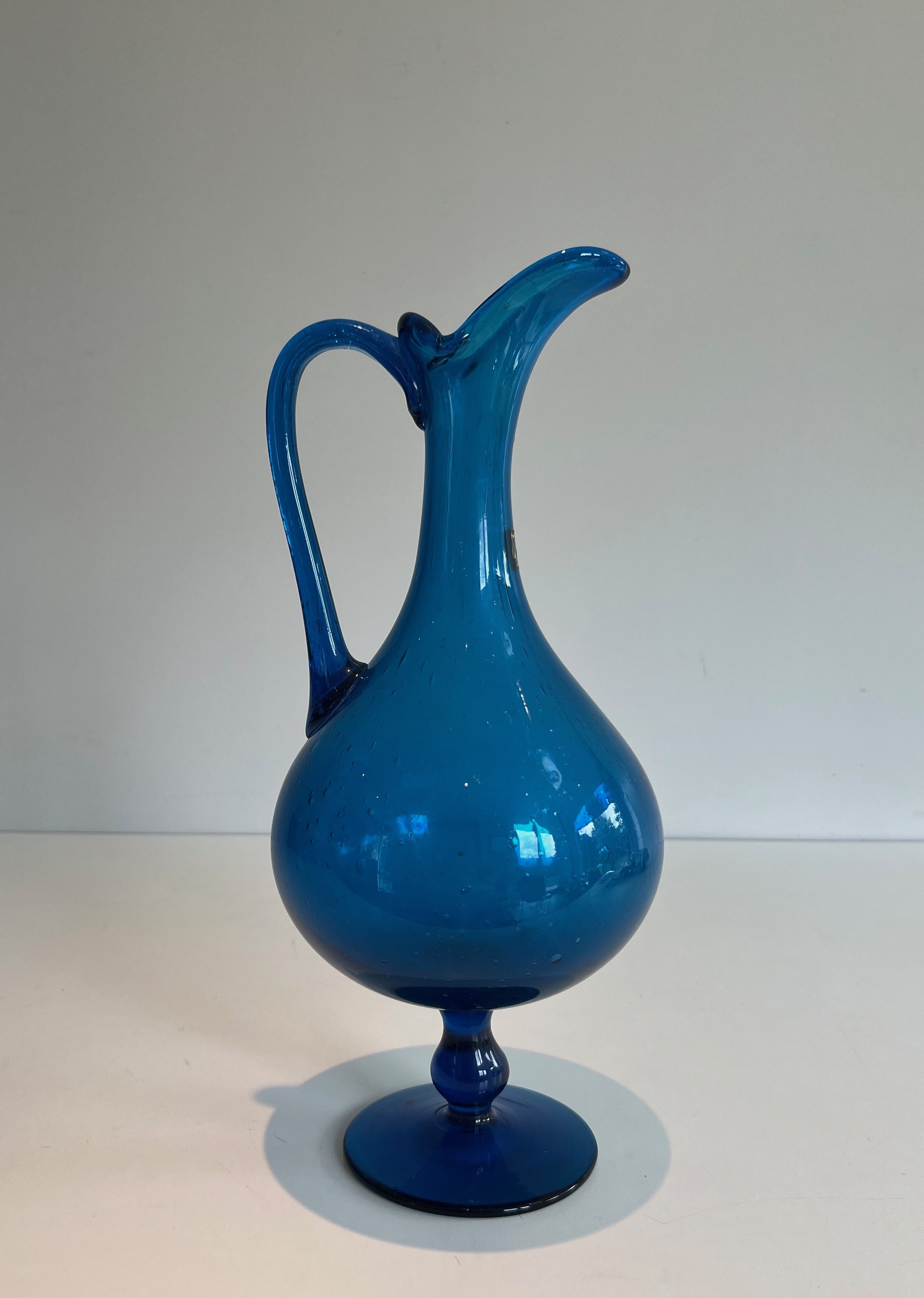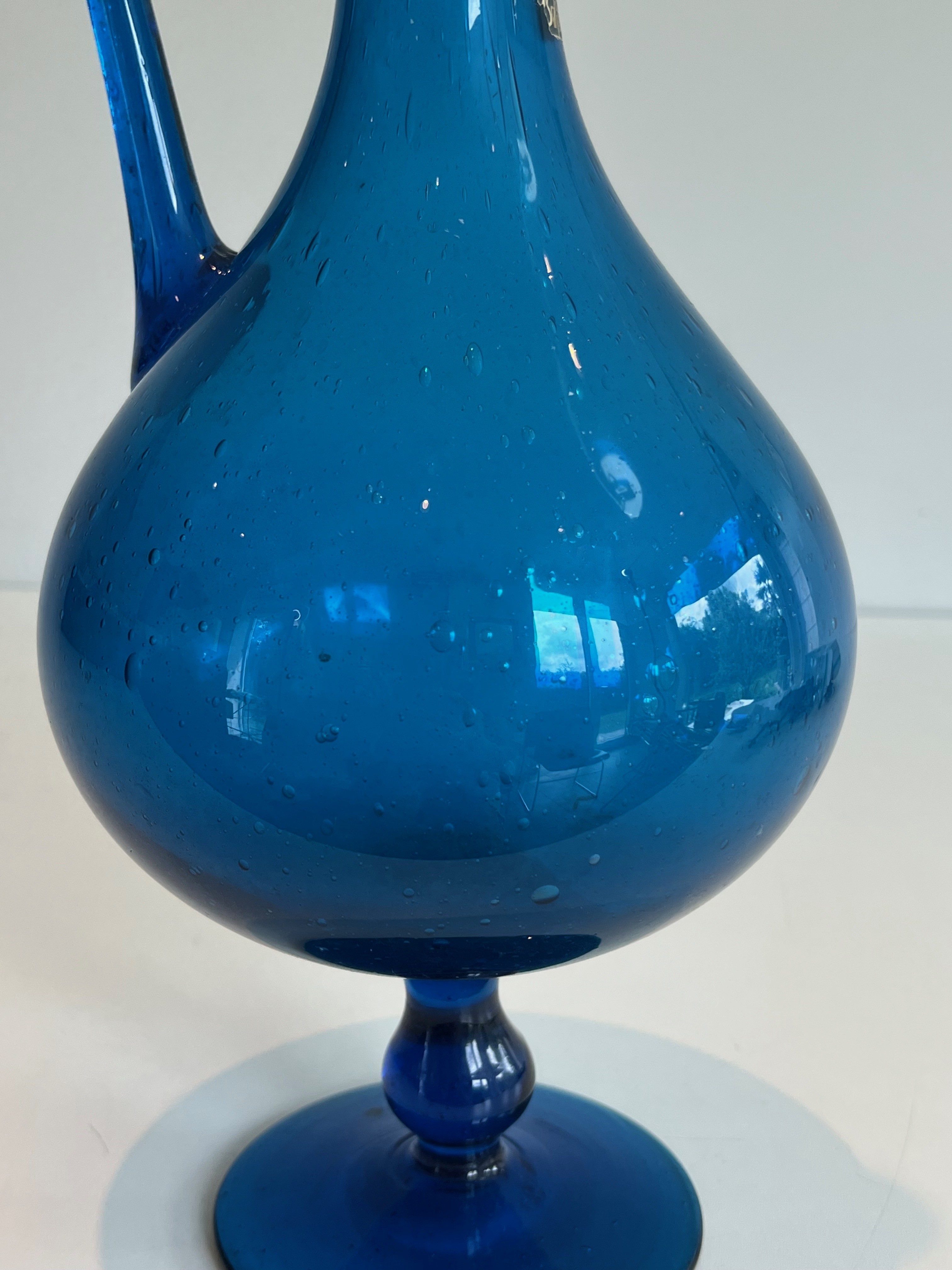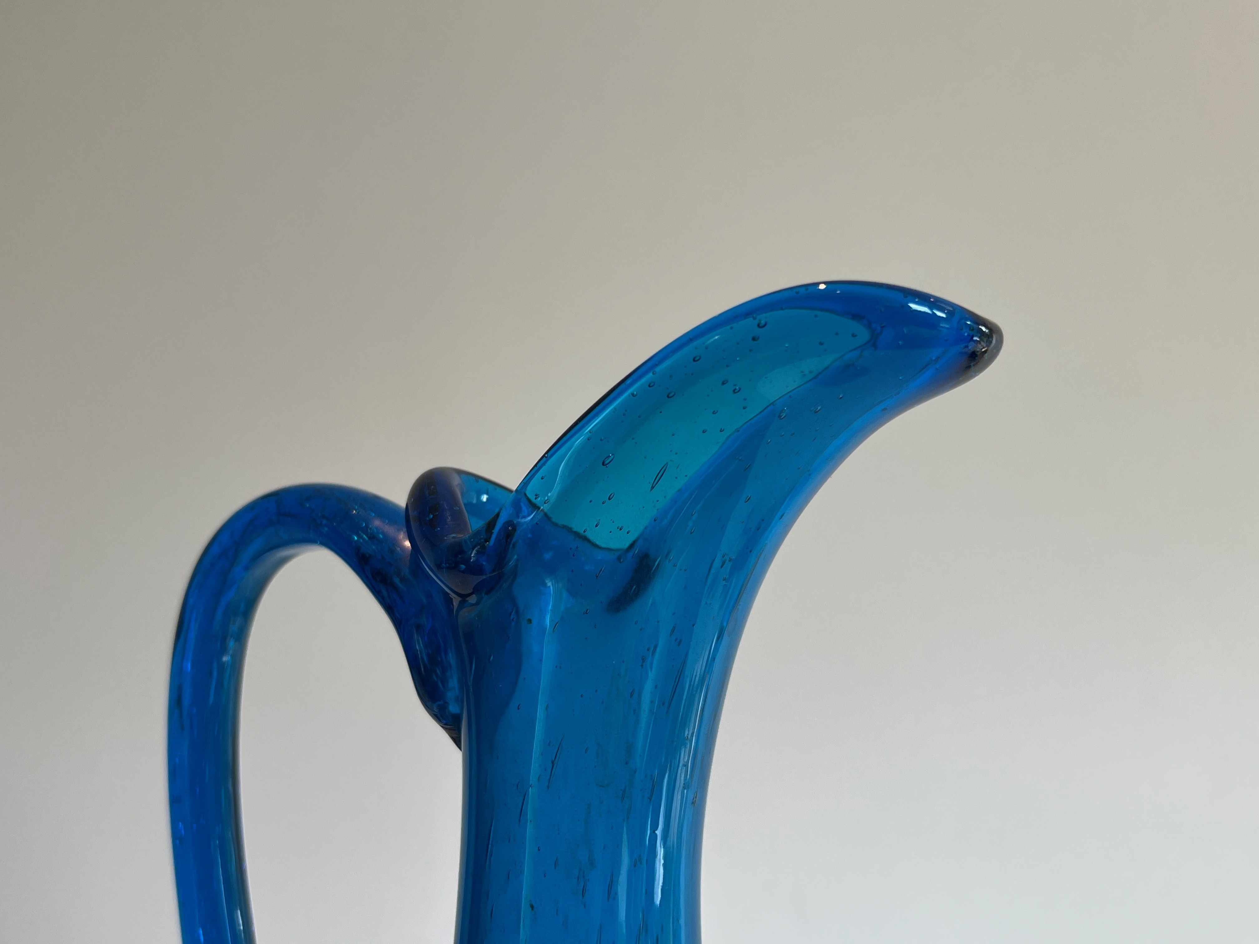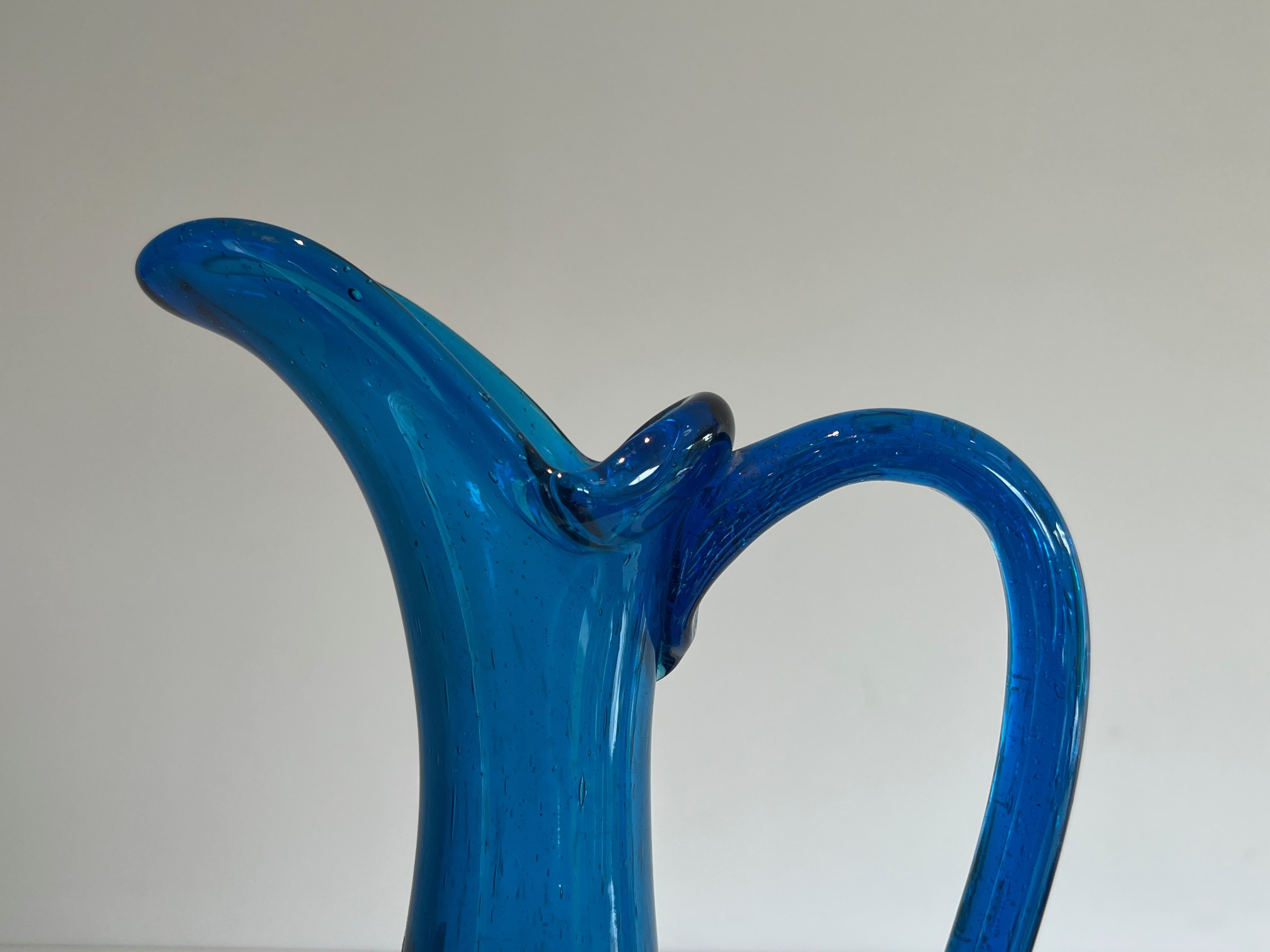 This pitcher is at once a functional object and a work of decorative art, suited equally to display on a sideboard, a console, or a dining table. Its intense blue tonality harmonises with interior schemes from the Scandinavian to the Mediterranean, and it makes a particularly striking composition when grouped with other coloured glass objects. A distinguished example of Italian glassmaking artistry from the golden decade of post-war design.