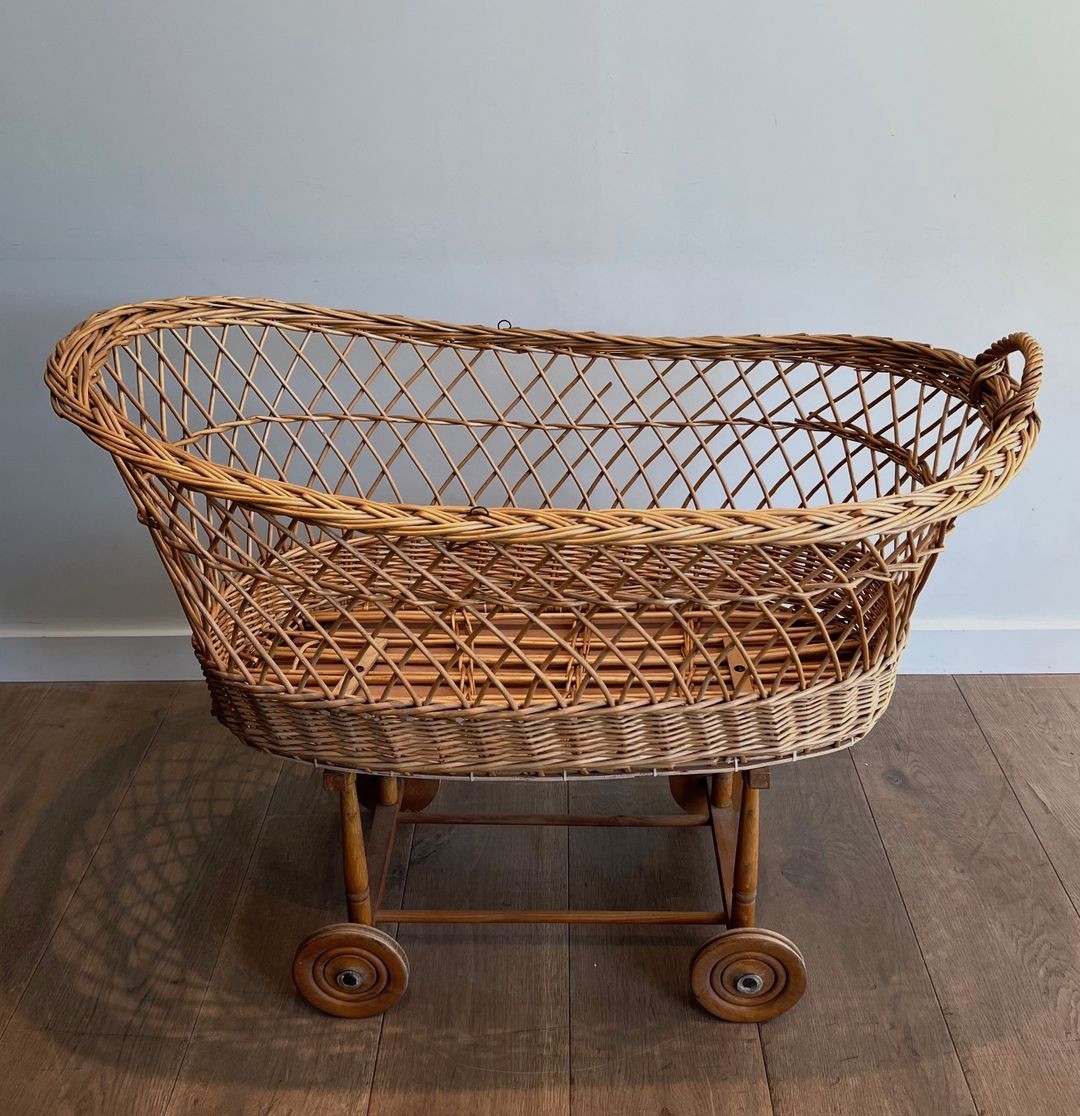 The rattan cradle occupies a particular place in the history of French domestic furnishing: since the eighteenth century, the vannier — the basket-weaving craftsman — was entrusted with making the first furniture to receive a newborn. Rattan established itself as the material of choice for this purpose, offering lightness, resilience and natural breathability that solid wood could not match for a child’s earliest months. By the post-war years, this tradition had stripped away the ornamental canopies of earlier generations, arriving at a purer, more structural form.