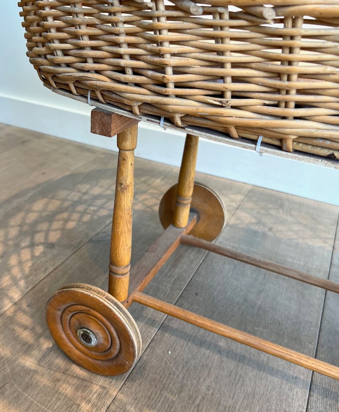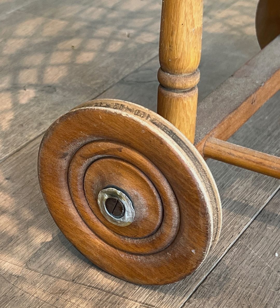 The defining feature of this cradle is its mobility: mounted on four swivelling casters, it became a companion to the household rather than a fixed station, moving from bedroom to kitchen, from the morning light of one room to the warmth of another. In the reorganised French domestic interior of the 1940s — smaller, more practical, shared between several functions — this ease of movement answered a real need with unpretentious intelligence.