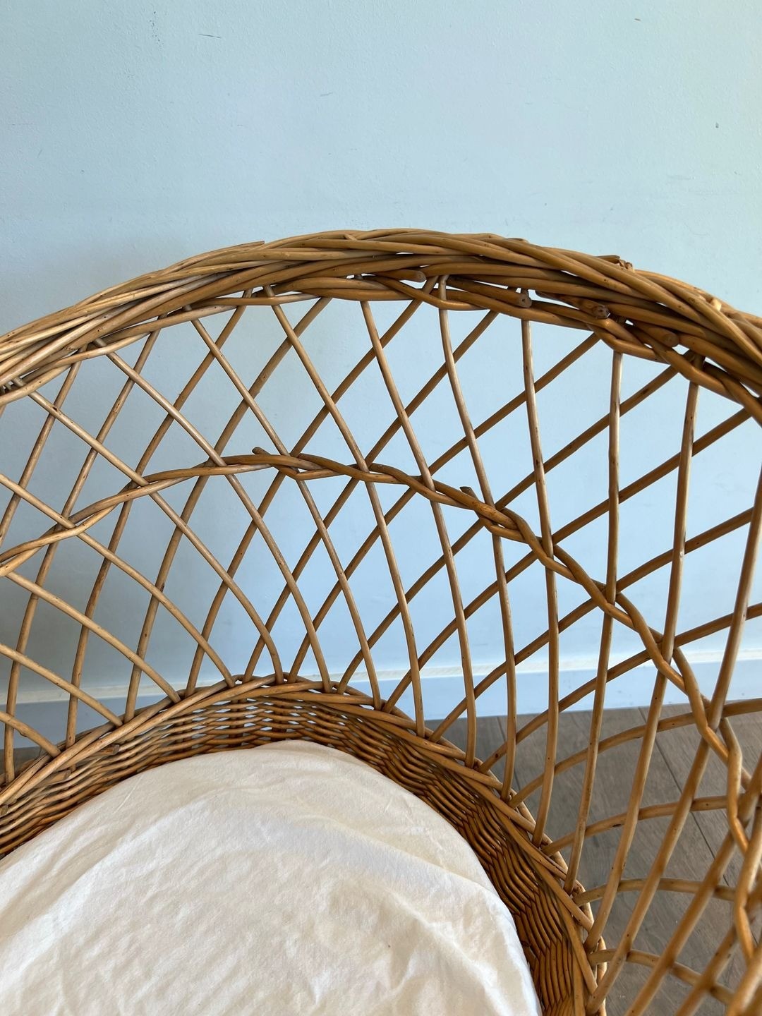 The natural rattan weave is executed with the measured precision of the trained vannier, creating a surface that breathes while maintaining structural rigidity. The rounded form has the enveloping quality appropriate to its purpose, offering security without enclosure. Retaining a patina of authentic use, this piece carries the quiet warmth of an object made with care for an intimate domestic purpose.
