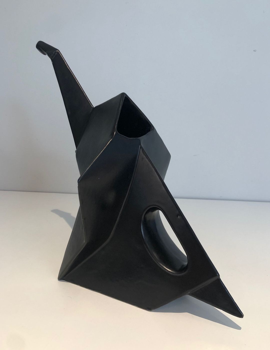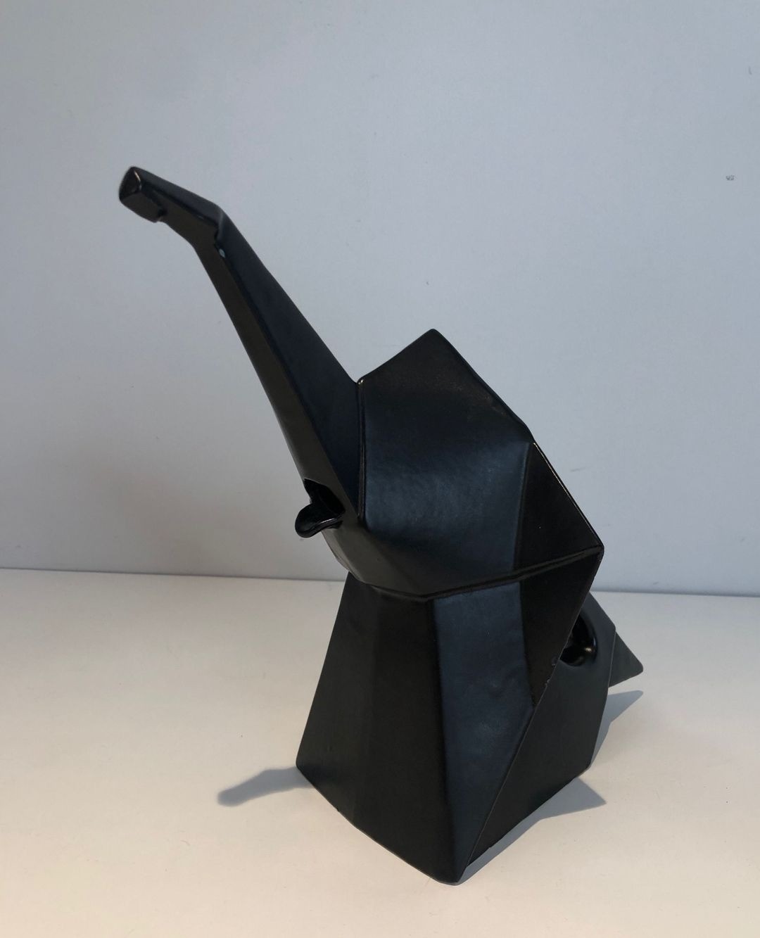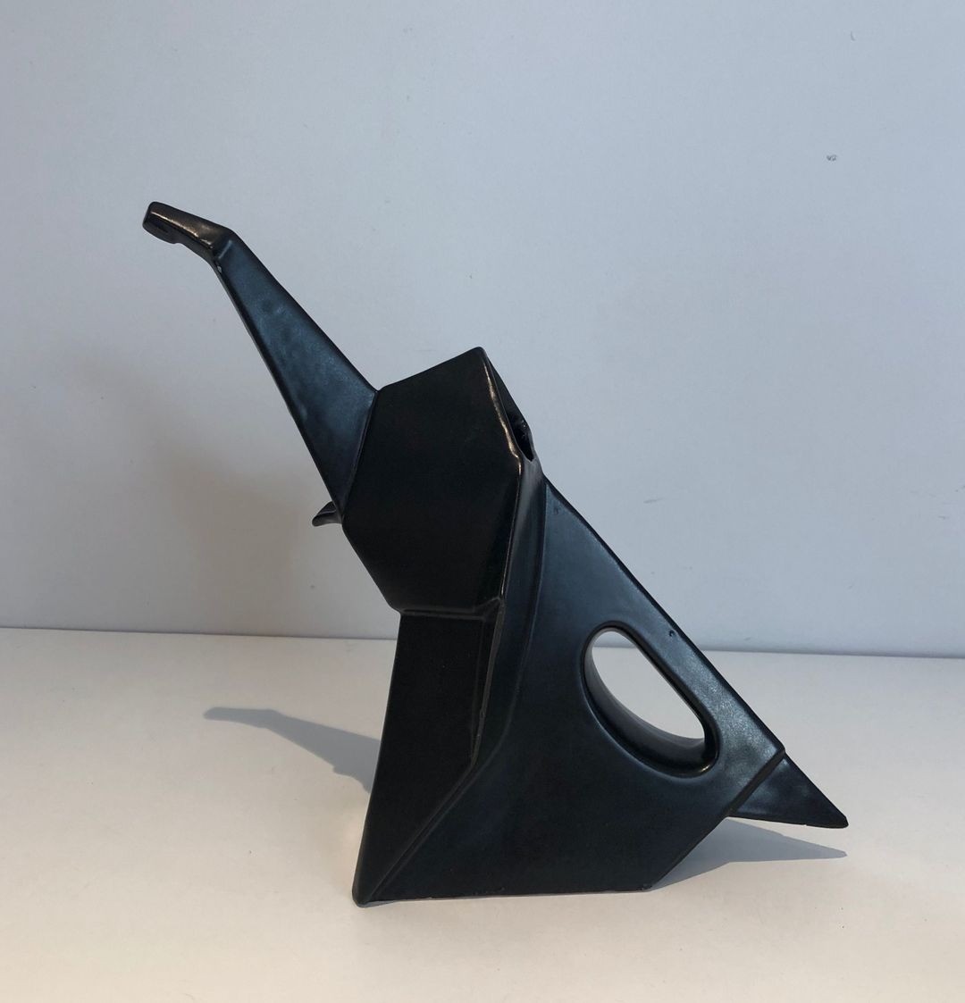 A boldly inventive black ceramic pitcher in which the elephant form has been subjected to a rigorous Cubist geometry. The body of the animal is resolved into a series of flat angular planes — trapezoids, triangles, and bevelled prisms — assembled into a whole that reads simultaneously as a functional vessel and as an abstract sculptural composition. The trunk, extended forward and upward, serves naturally as the spout; the looped handle at the rear echoes the curve of the tail. The matt black glaze unifies all surfaces, suppressing naturalistic detail in favour of bold silhouette and relief.