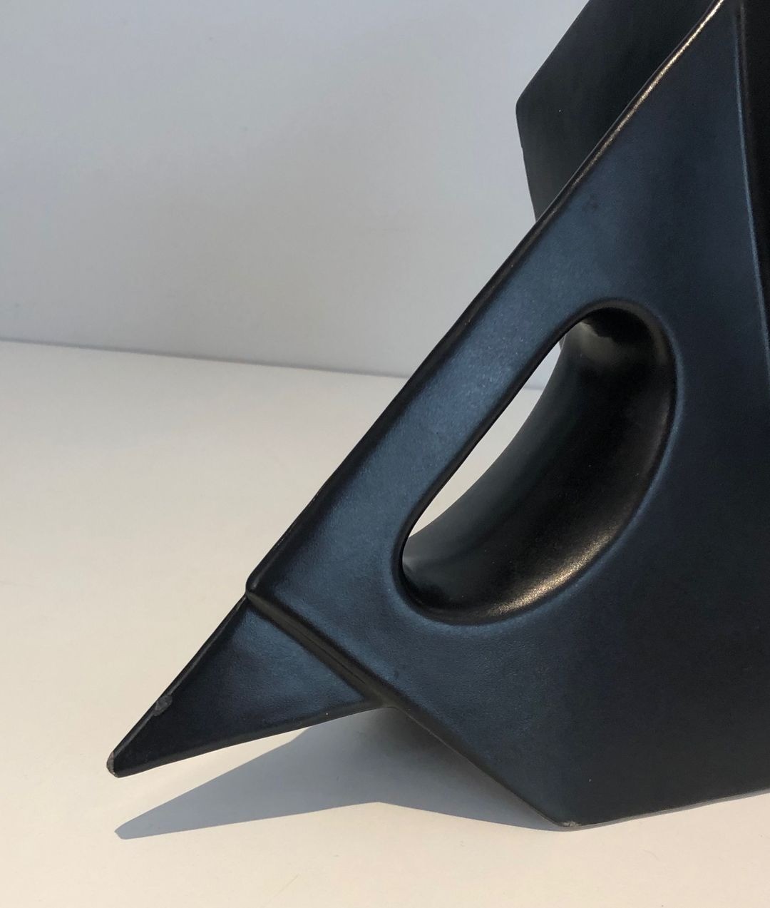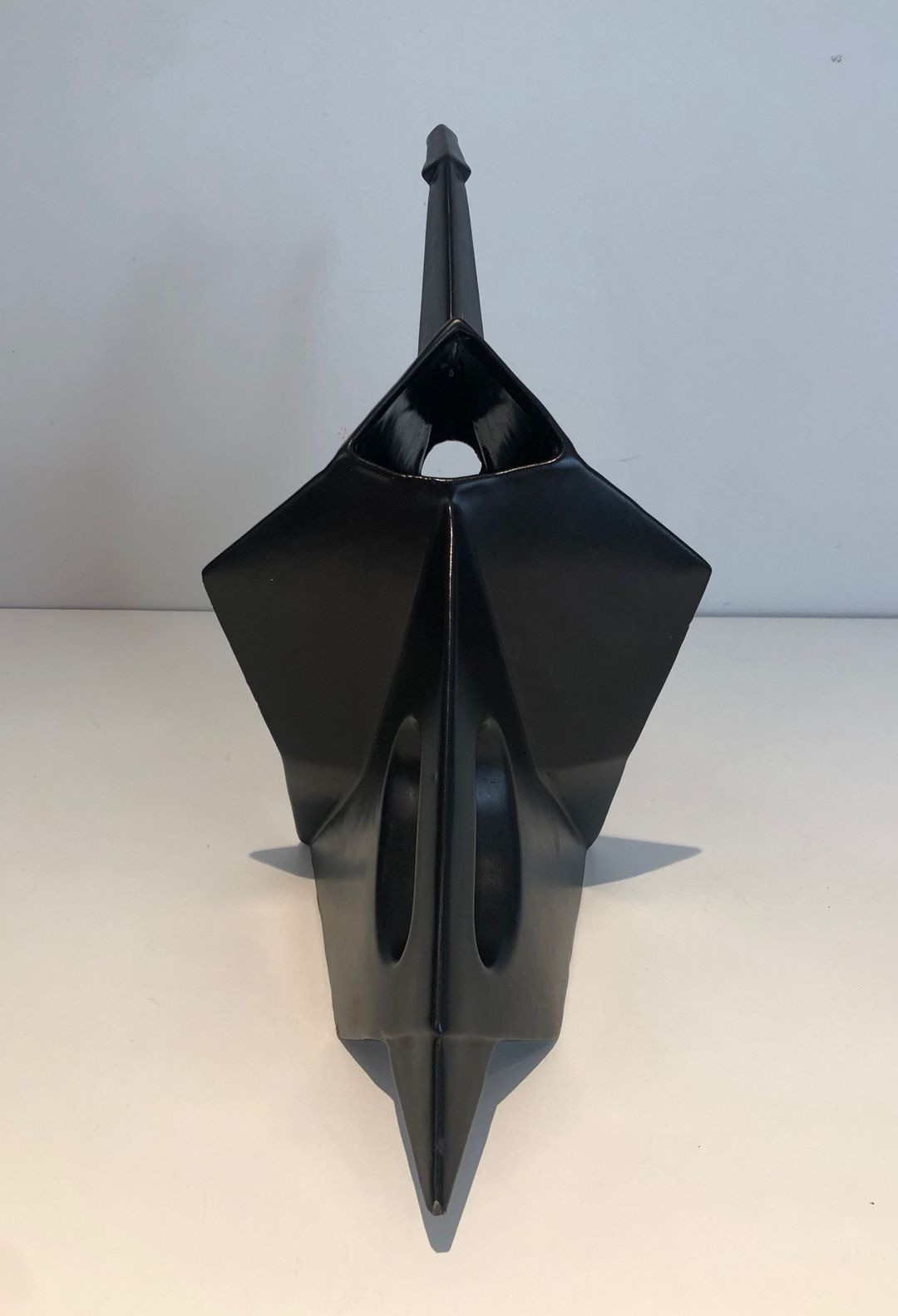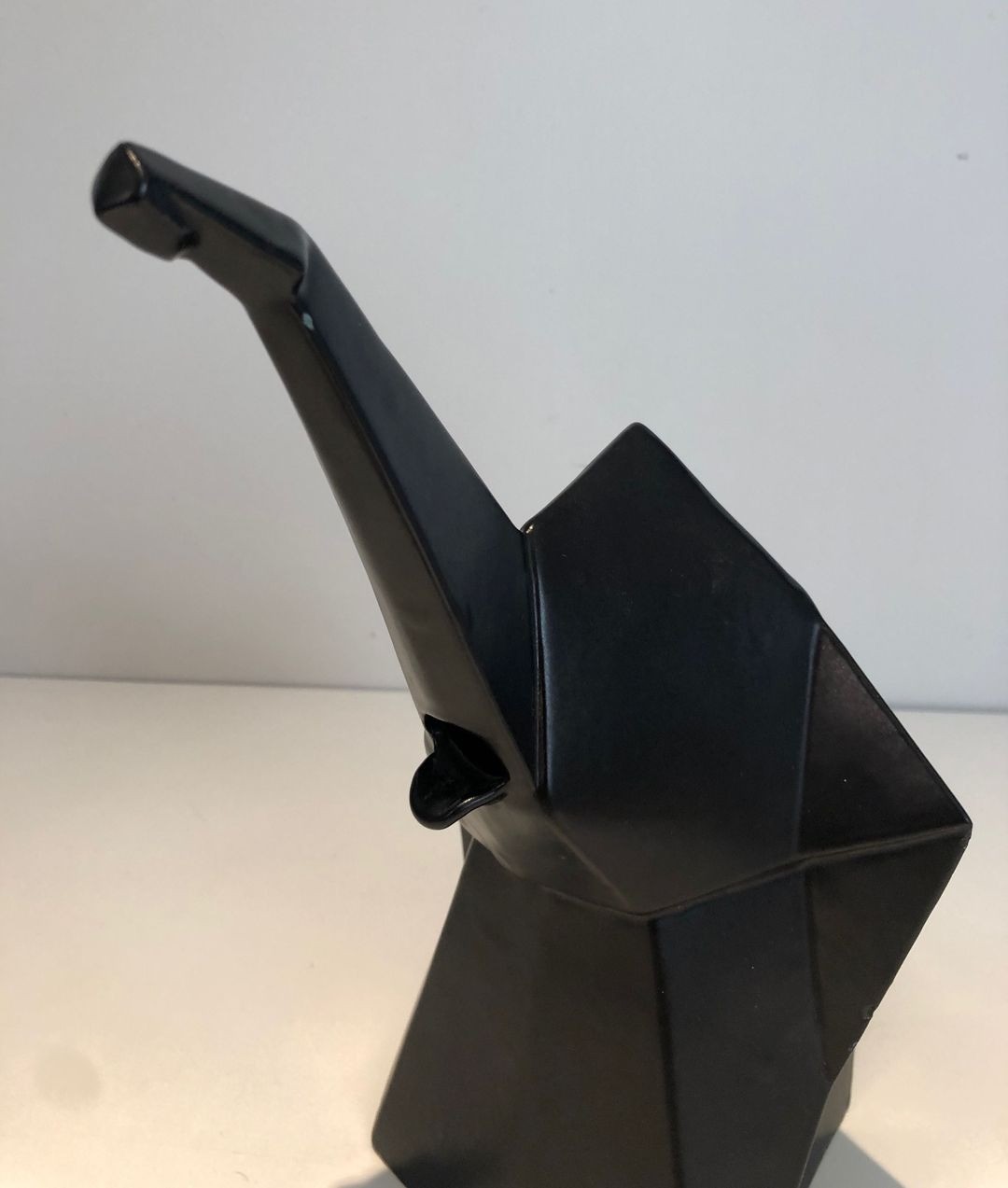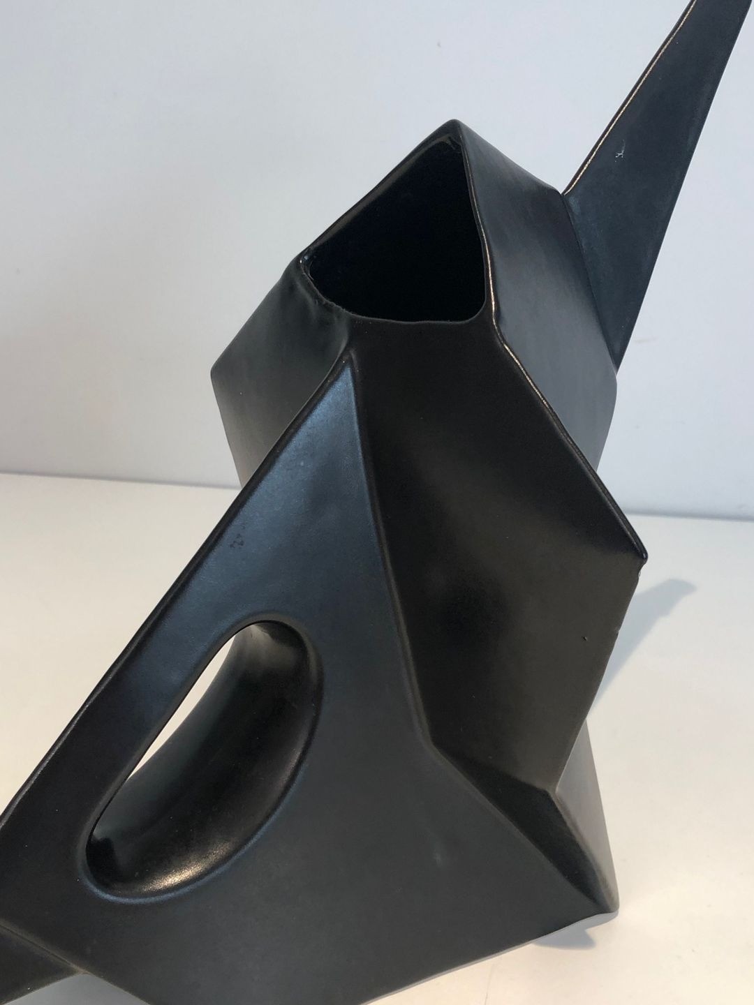 A boldly inventive black ceramic pitcher in which the elephant form has been subjected to a rigorous Cubist geometry. The body of the animal is resolved into a series of flat angular planes — trapezoids, triangles, and bevelled prisms — assembled into a whole that reads simultaneously as a functional vessel and as an abstract sculptural composition. The trunk, extended forward and upward, serves naturally as the spout; the looped handle at the rear echoes the curve of the tail. The matt black glaze unifies all surfaces, suppressing naturalistic detail in favour of bold silhouette and relief.