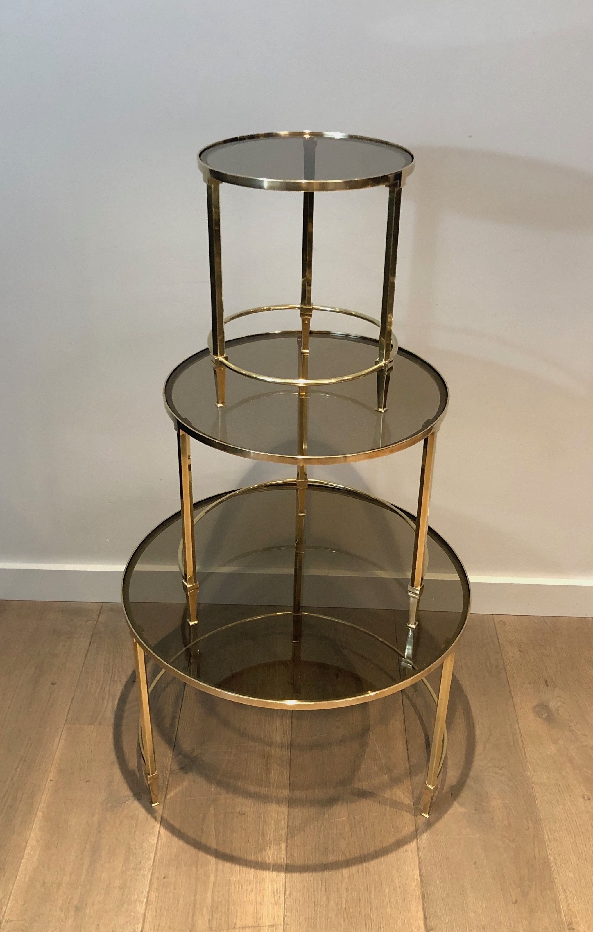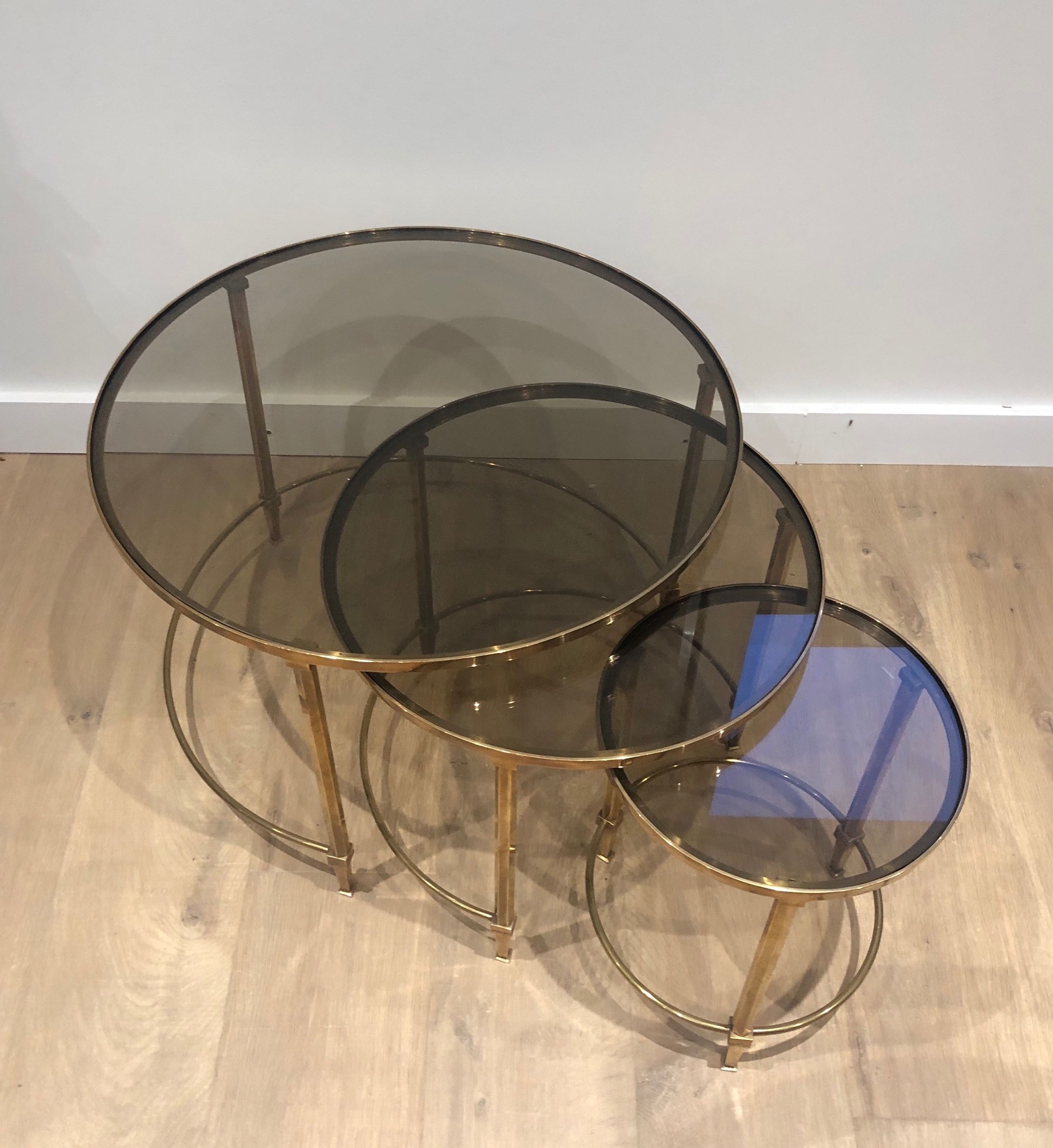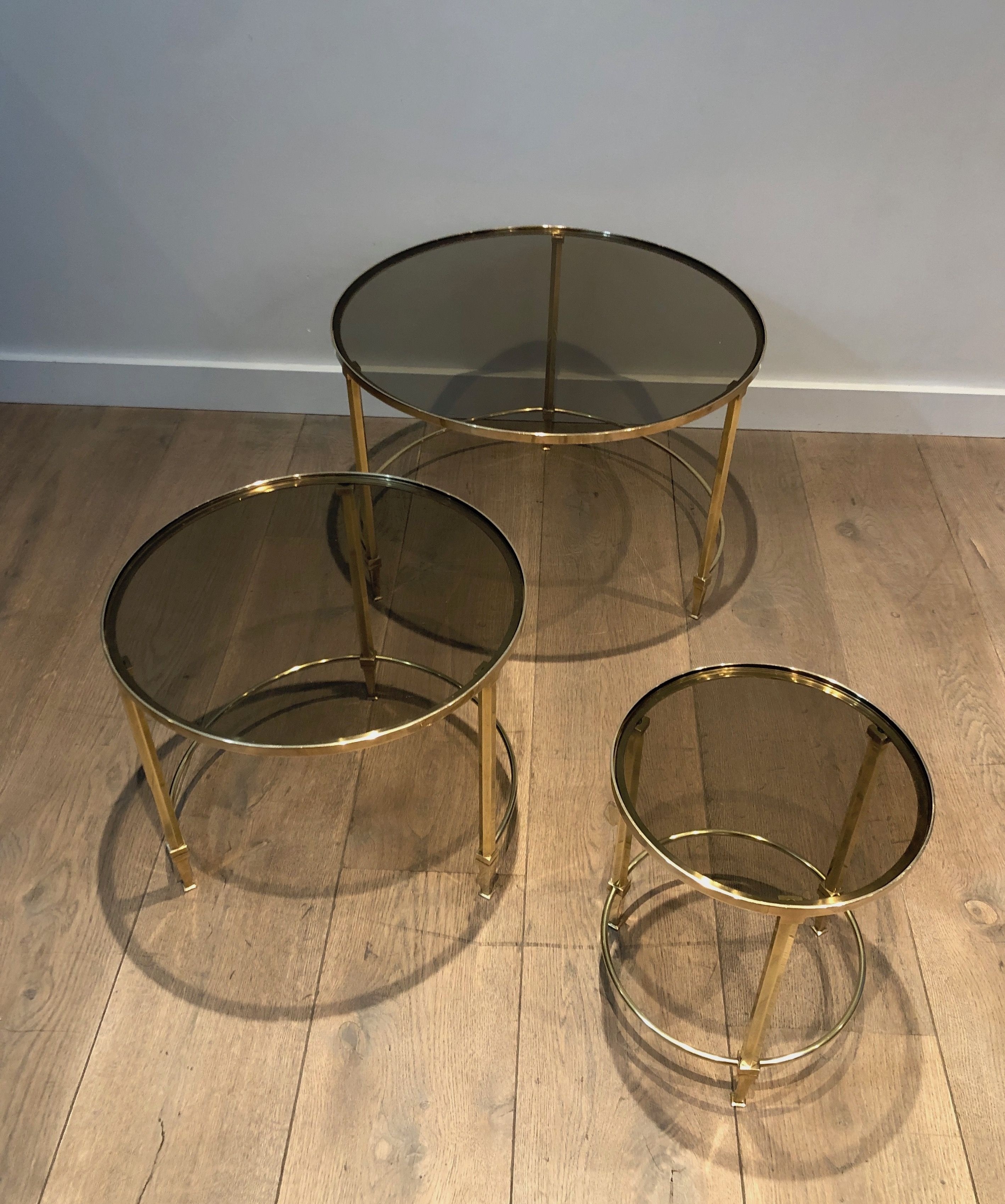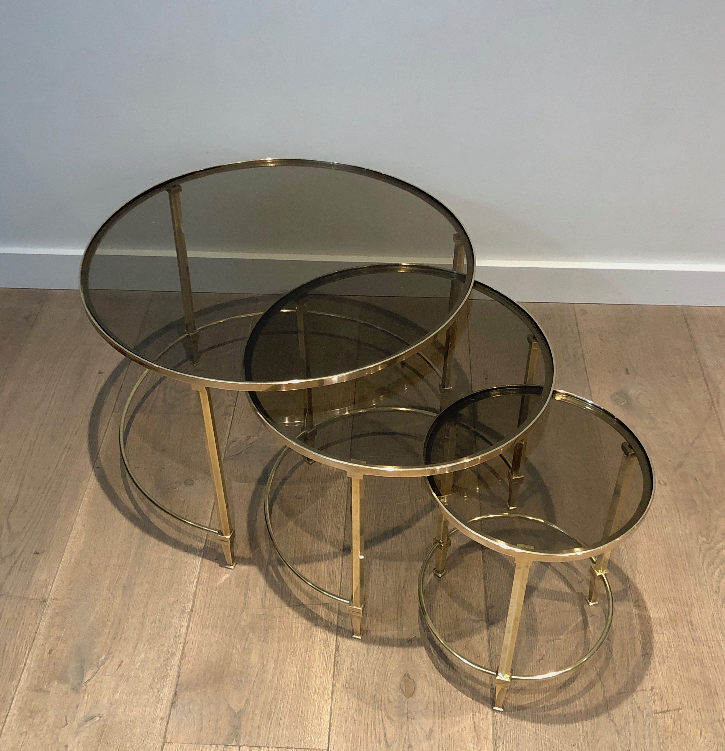This distinguished set of three nesting tables presents circular structures in polished brass, each supporting a top of smoked glass whose subtly tinted surface introduces a note of mysterious depth that beautifully complements the warm gleam of the metal below. The three tables, graduated in size and conceived to nest together in perfect harmony, create a visual hierarchy of luminous forms — the brass structures gleaming with the warmth of gold, the smoke-tinted glass tops absorbing and reflecting the light with an almost liquid quality. The round format and the pairing of brass and smoked glass place this suite firmly within the refined Parisian production of the late 1930s and 1940s, when the circular form was particularly favored for its ability to create a sense of fluid social ease.