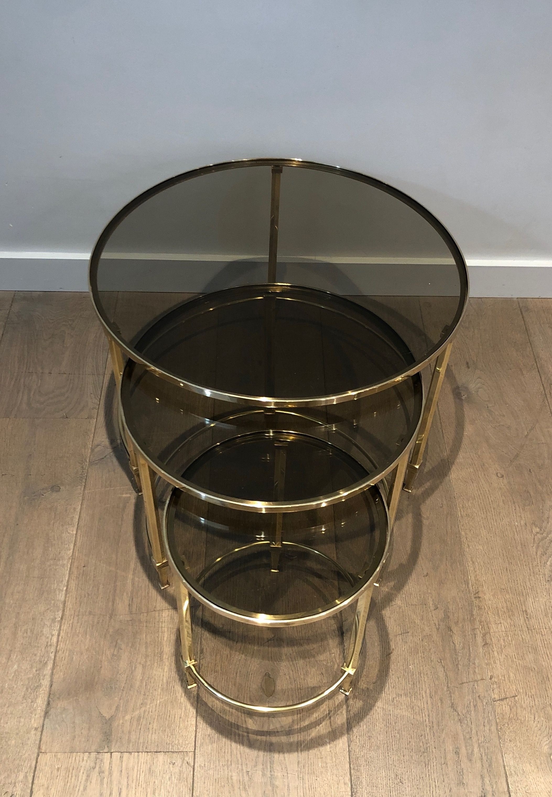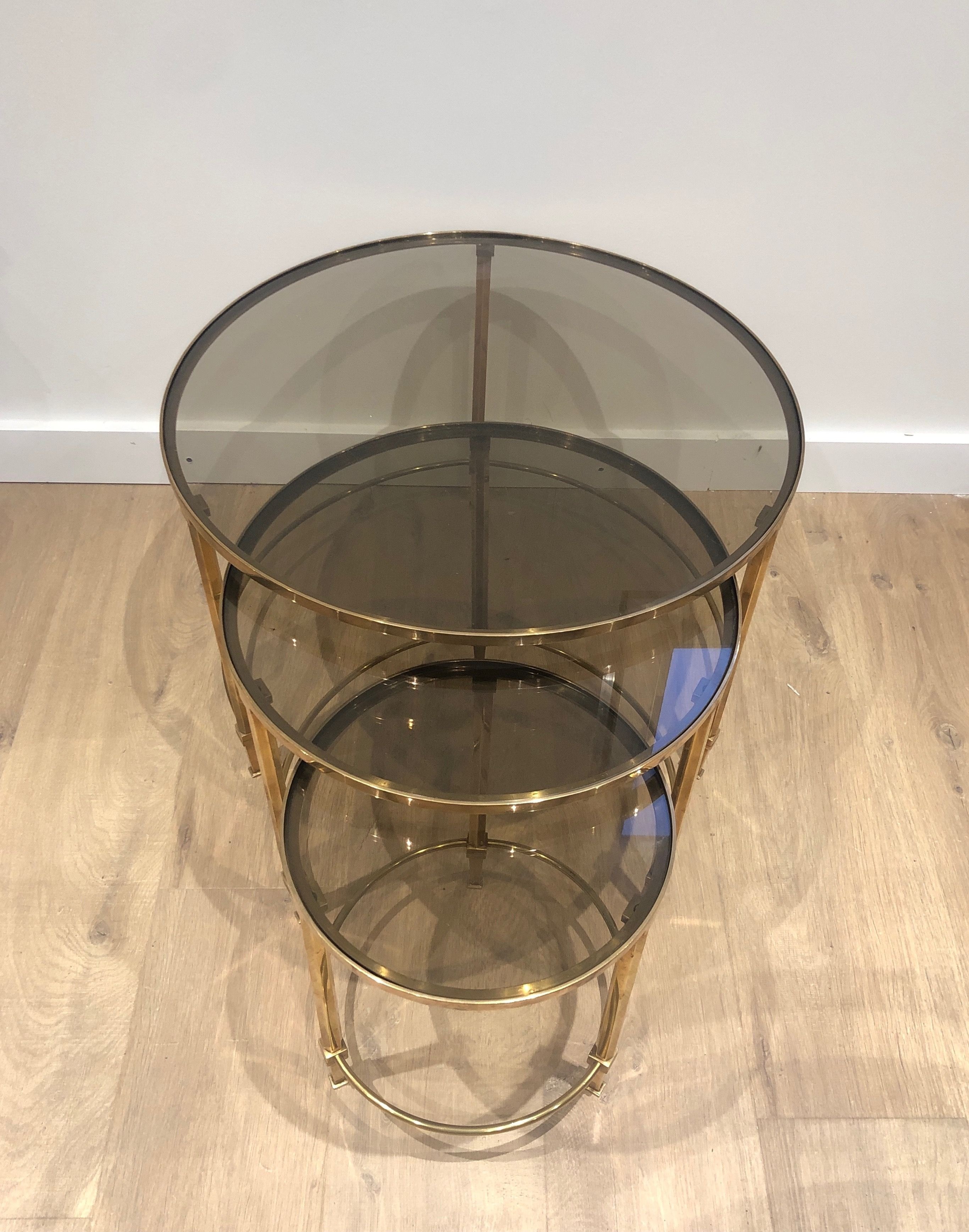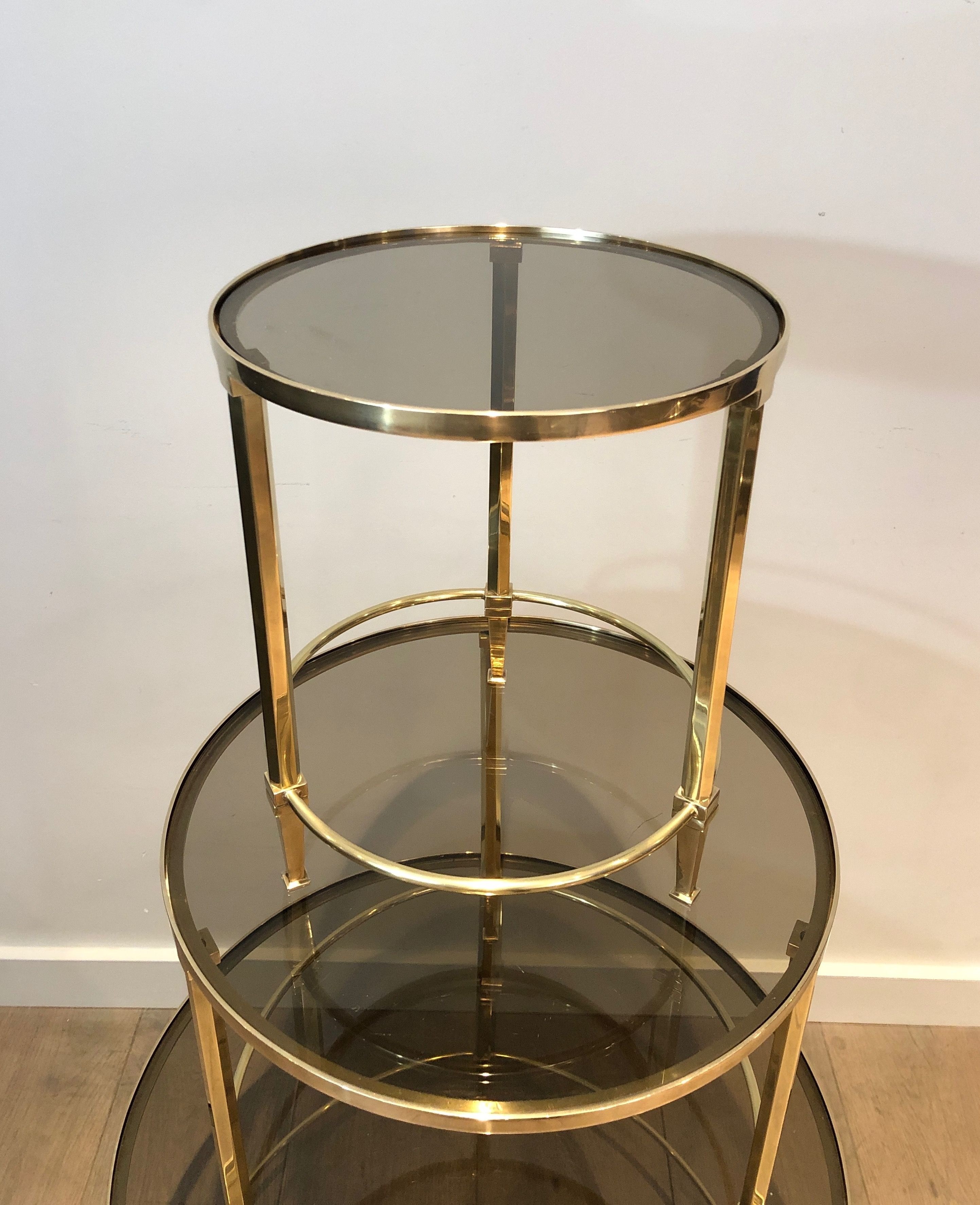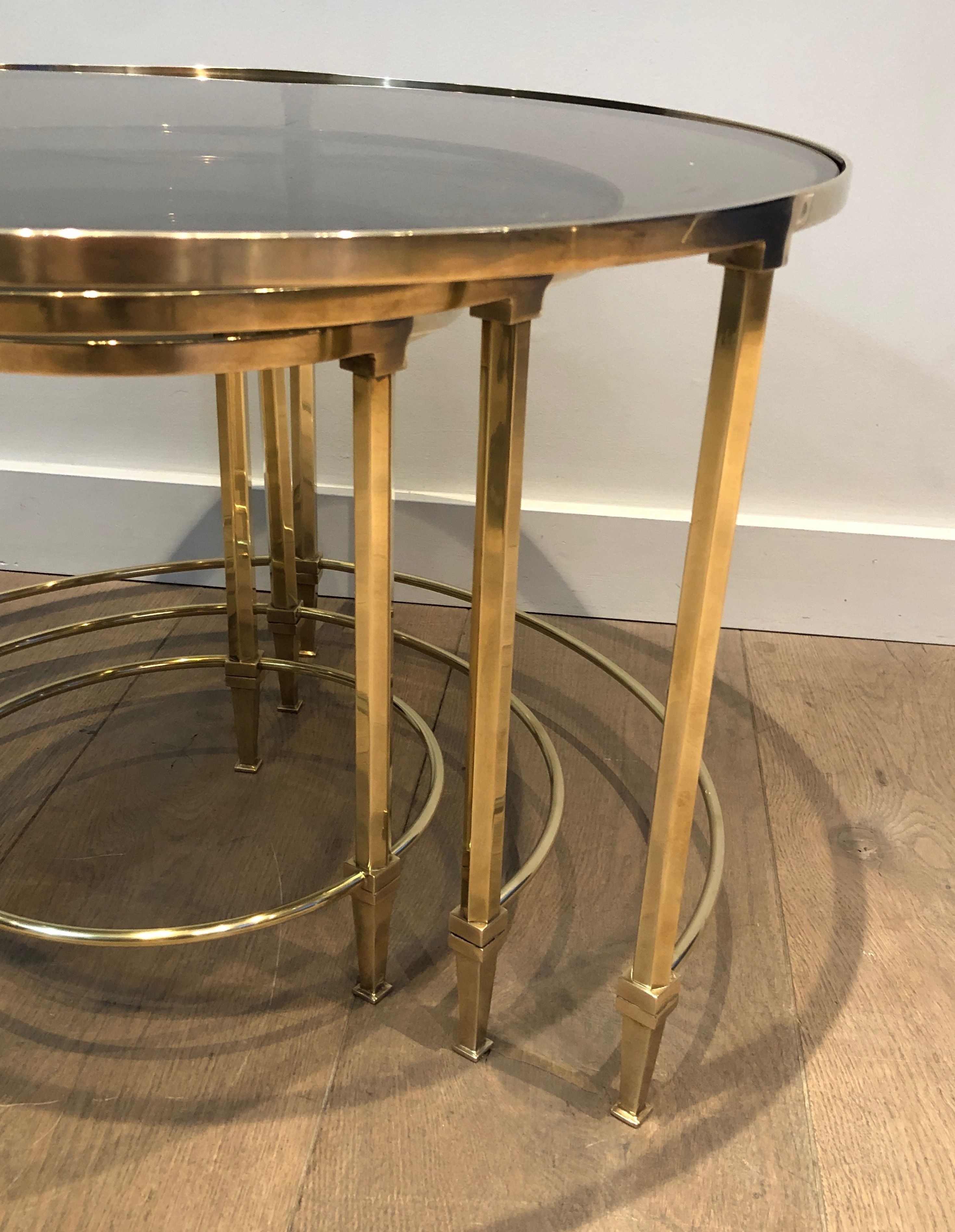 This distinguished set of three nesting tables presents circular structures in polished brass, each supporting a top of smoked glass whose subtly tinted surface introduces a note of mysterious depth that beautifully complements the warm gleam of the metal below. The three tables, graduated in size and conceived to nest together in perfect harmony, create a visual hierarchy of luminous forms — the brass structures gleaming with the warmth of gold, the smoke-tinted glass tops absorbing and reflecting the light with an almost liquid quality. The round format and the pairing of brass and smoked glass place this suite firmly within the refined Parisian production of the late 1930s and 1940s, when the circular form was particularly favored for its ability to create a sense of fluid social ease.