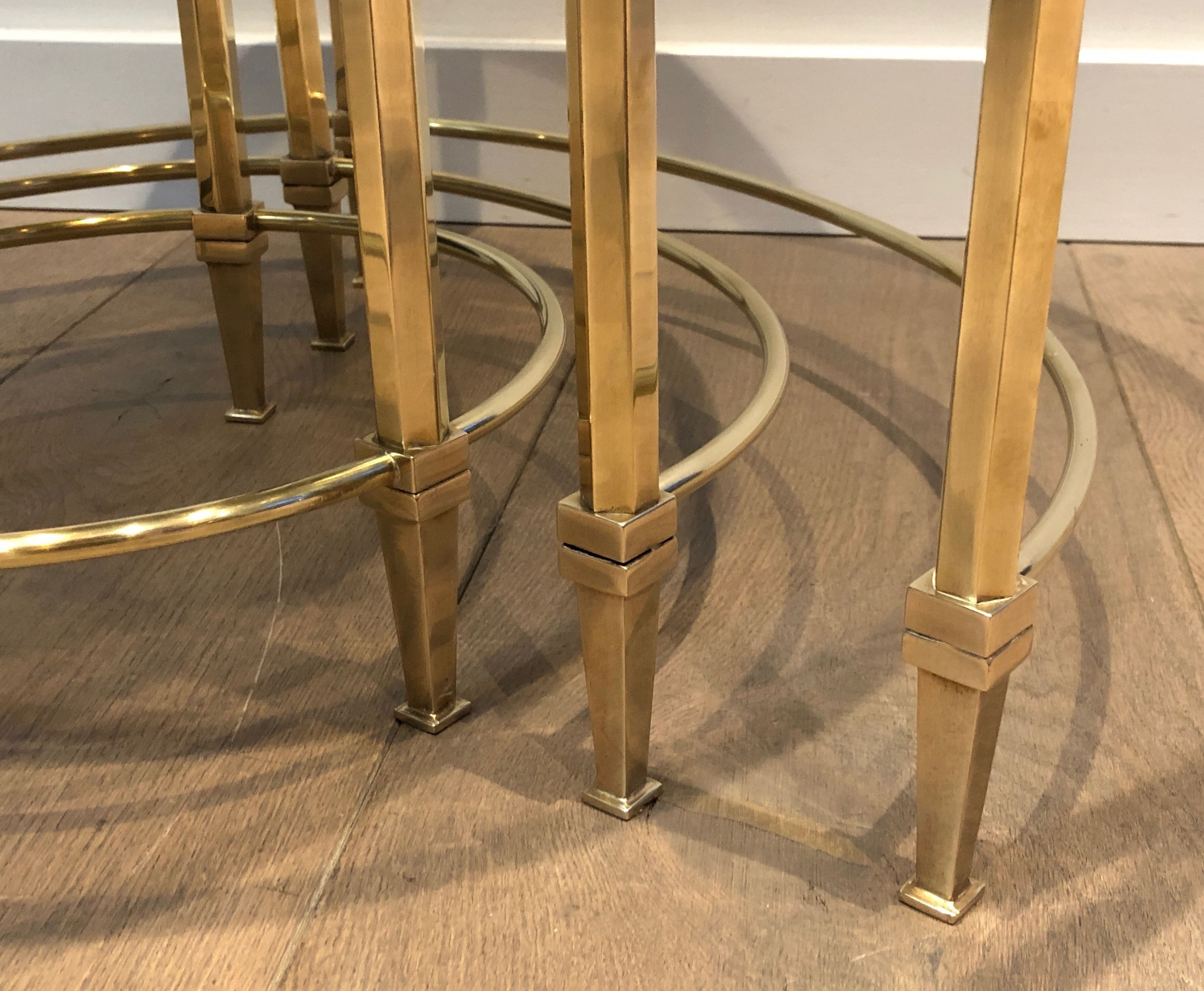 These tables are attributed to Maison Ramsay, the distinguished Parisian decorating house active during the first half of the twentieth century, whose production in the neoclassical and Art Deco taste furnished the most refined private residences in France. Like the other great Parisian decorating houses of its era — Jansen, Alavoine, Carlhian — Maison Ramsay produced furniture and objects of the highest material quality, combining classical formal clarity with the decorative refinements that distinguished Parisian luxury from all other. Their nesting tables in brass and glass were particularly prized for the flexibility they offered — a practical and beautiful solution for the salon and drawing room alike, the trio of tables serving equally as a coffee table composition or as separate occasional surfaces deployed throughout the space.