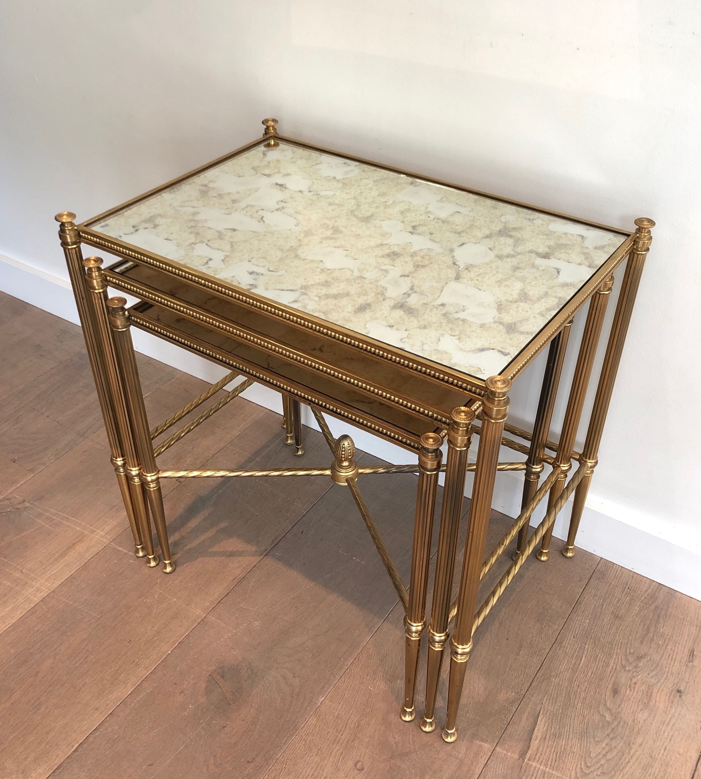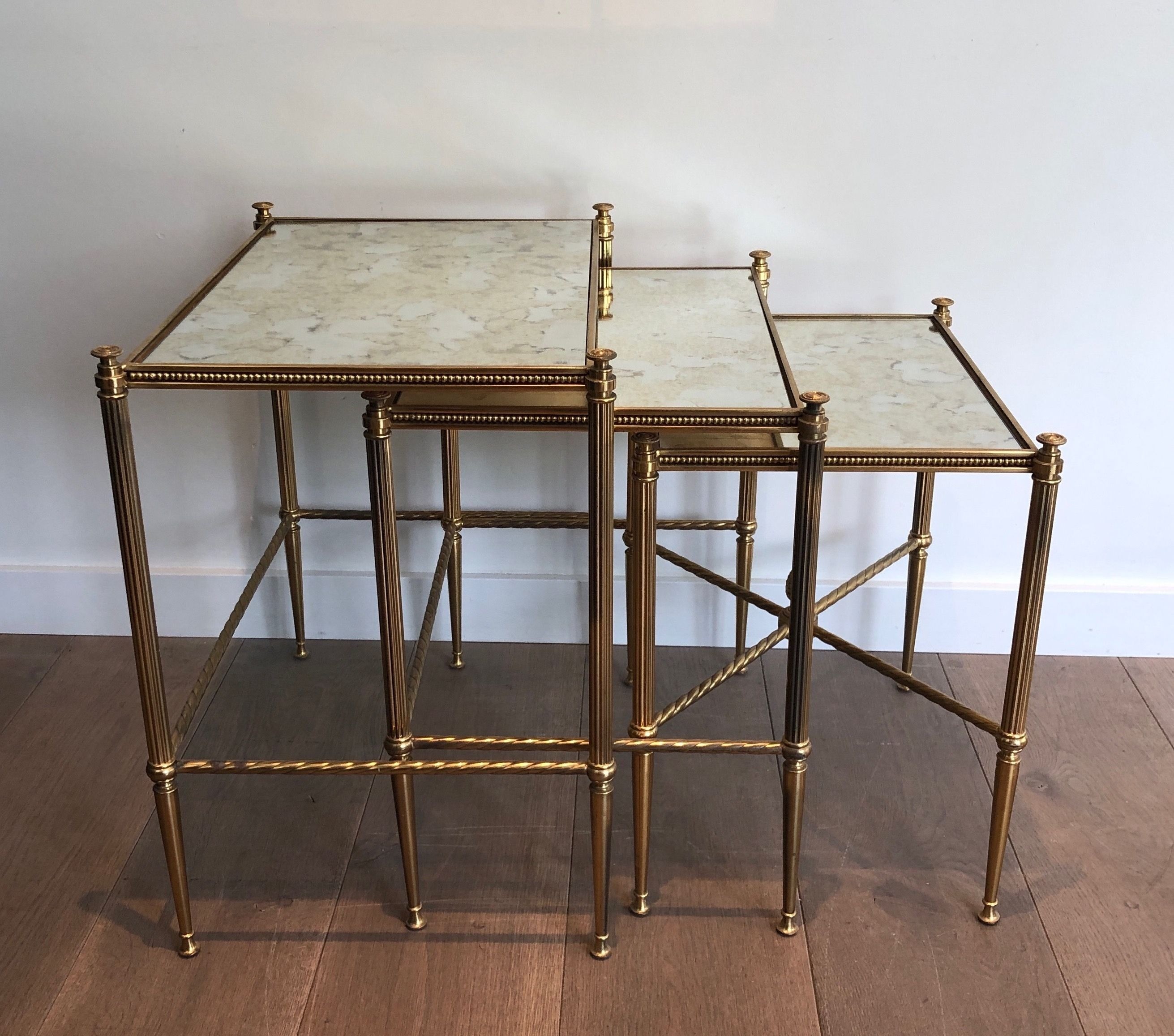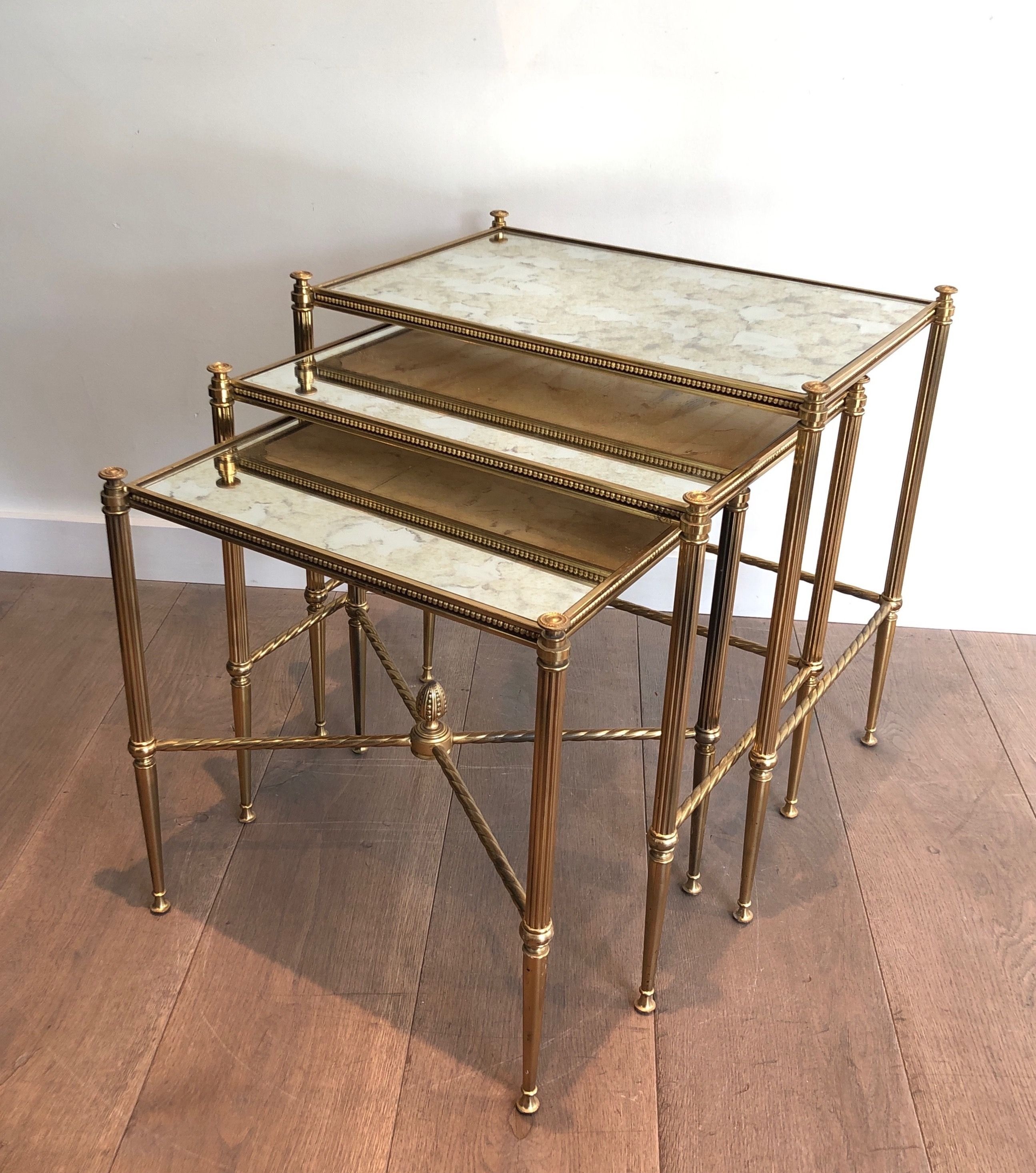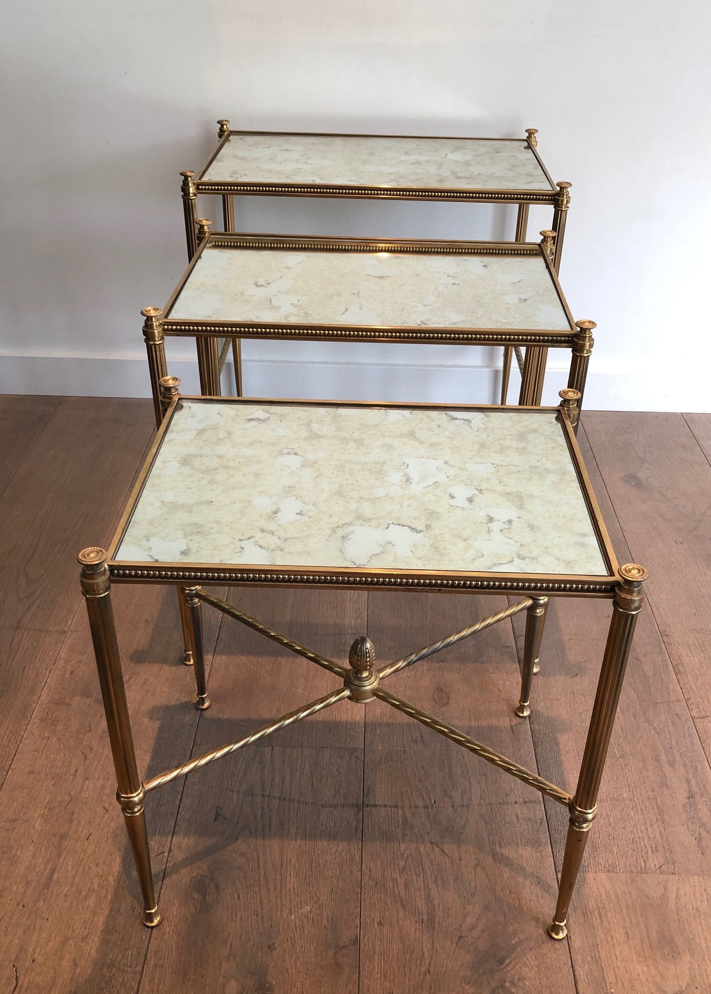 This distinguished set of three nesting tables presents structures in polished brass of neoclassical inspiration, their elegant proportions and refined metalwork creating a hierarchy of forms that nest perfectly together. Each table top is glazed with "faux antique" glass — glass specially treated to evoke the warm, subtly mottled surface of aged mirror or period glass — lending the tables a historical character and gentle luminosity far beyond their years. The combination of gleaming brass and softly lit antique-effect glass produces an effect of cultivated luxury, the whole composition recalling the finest French decorative production of the interwar period at its most accomplished.