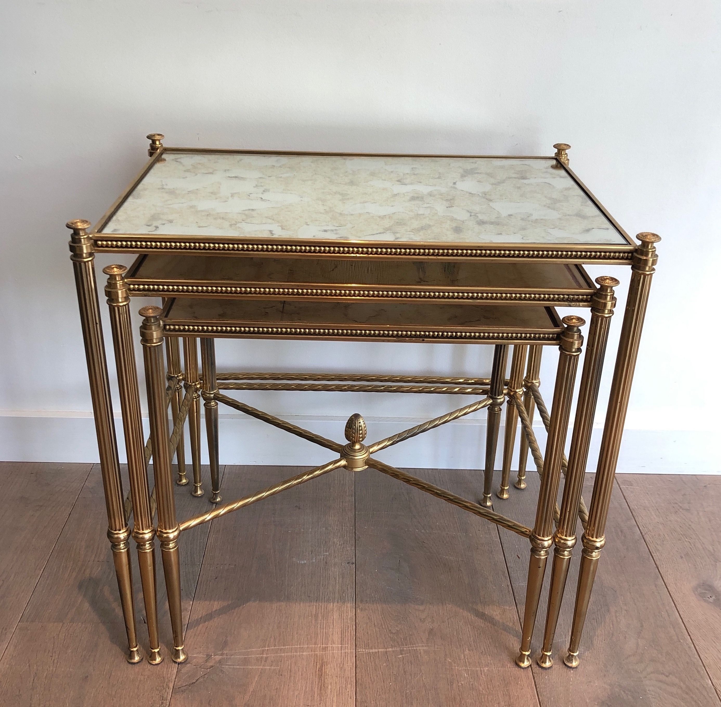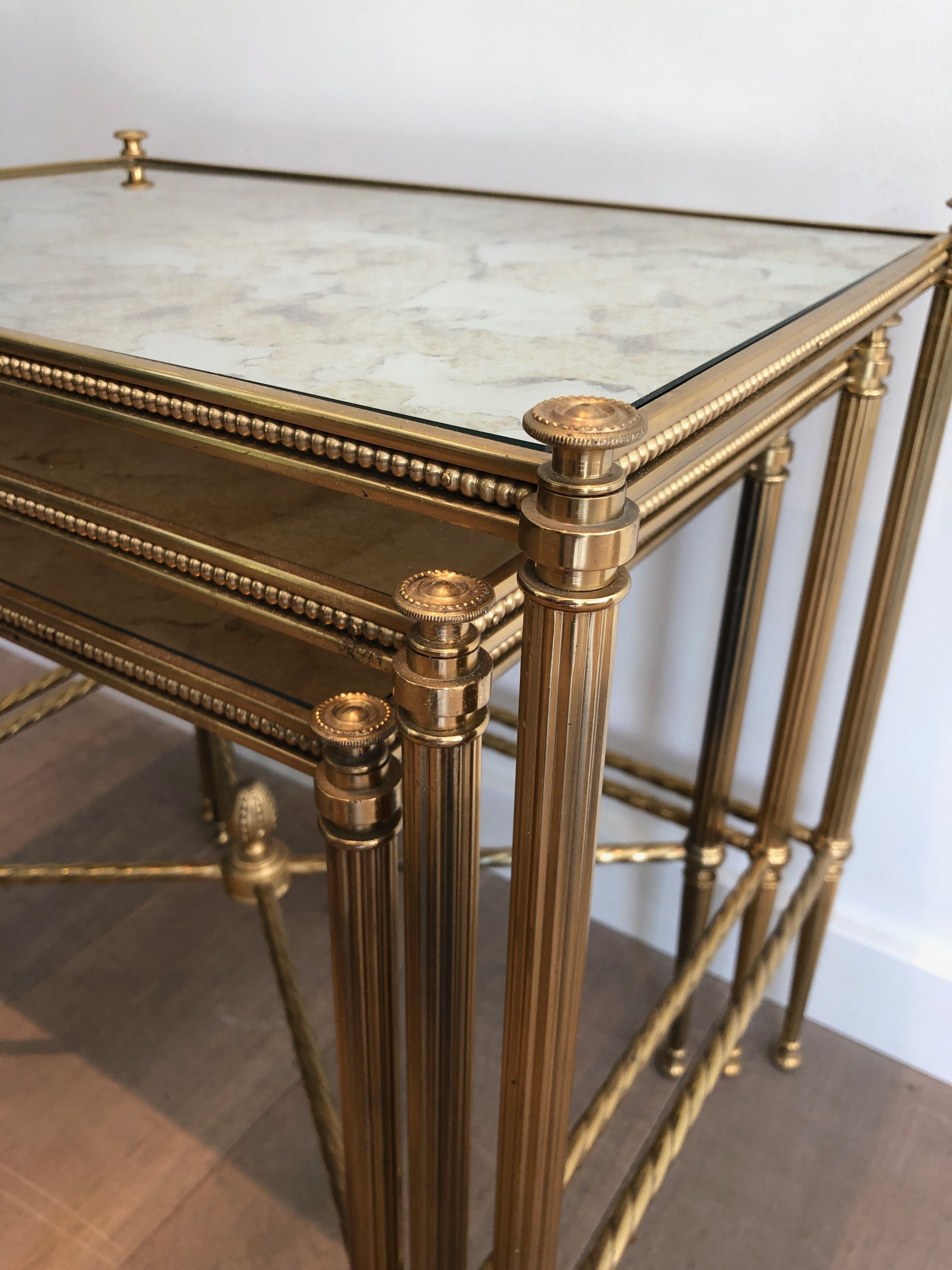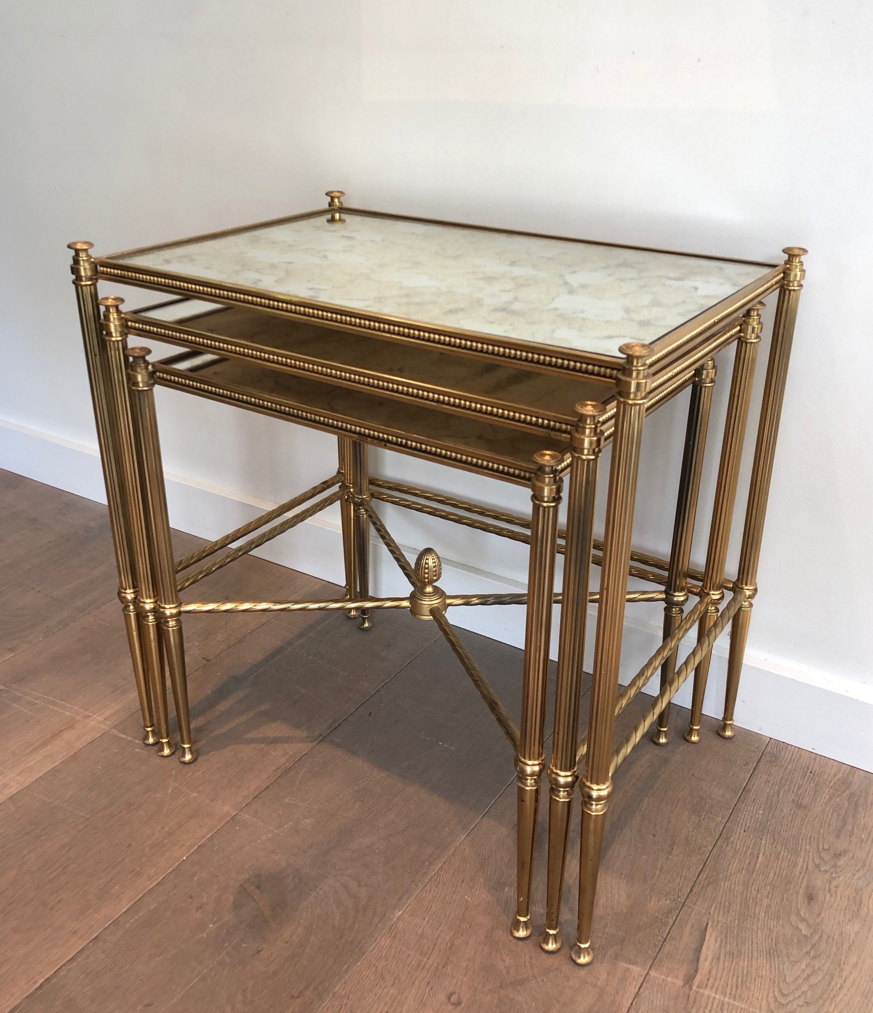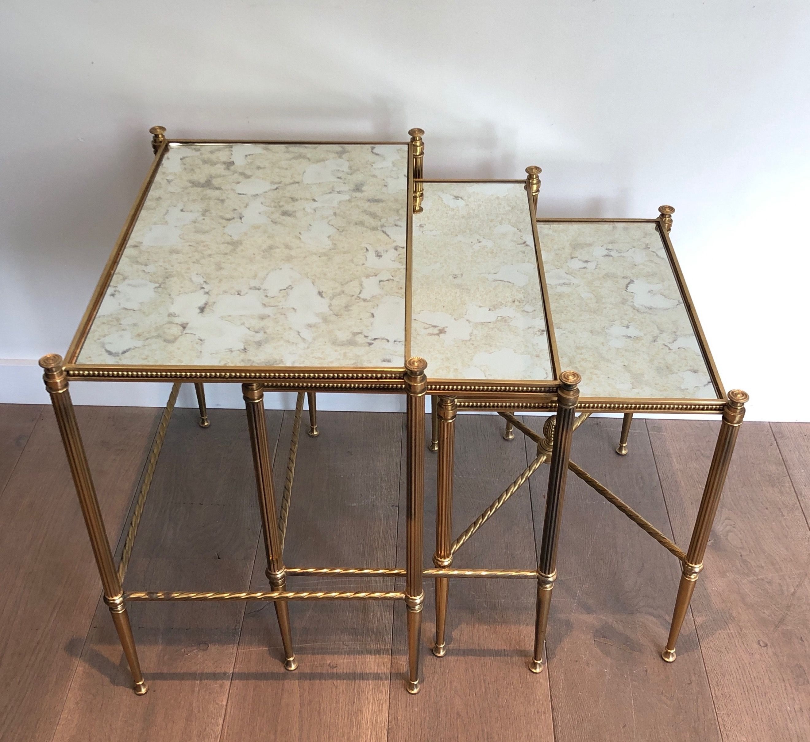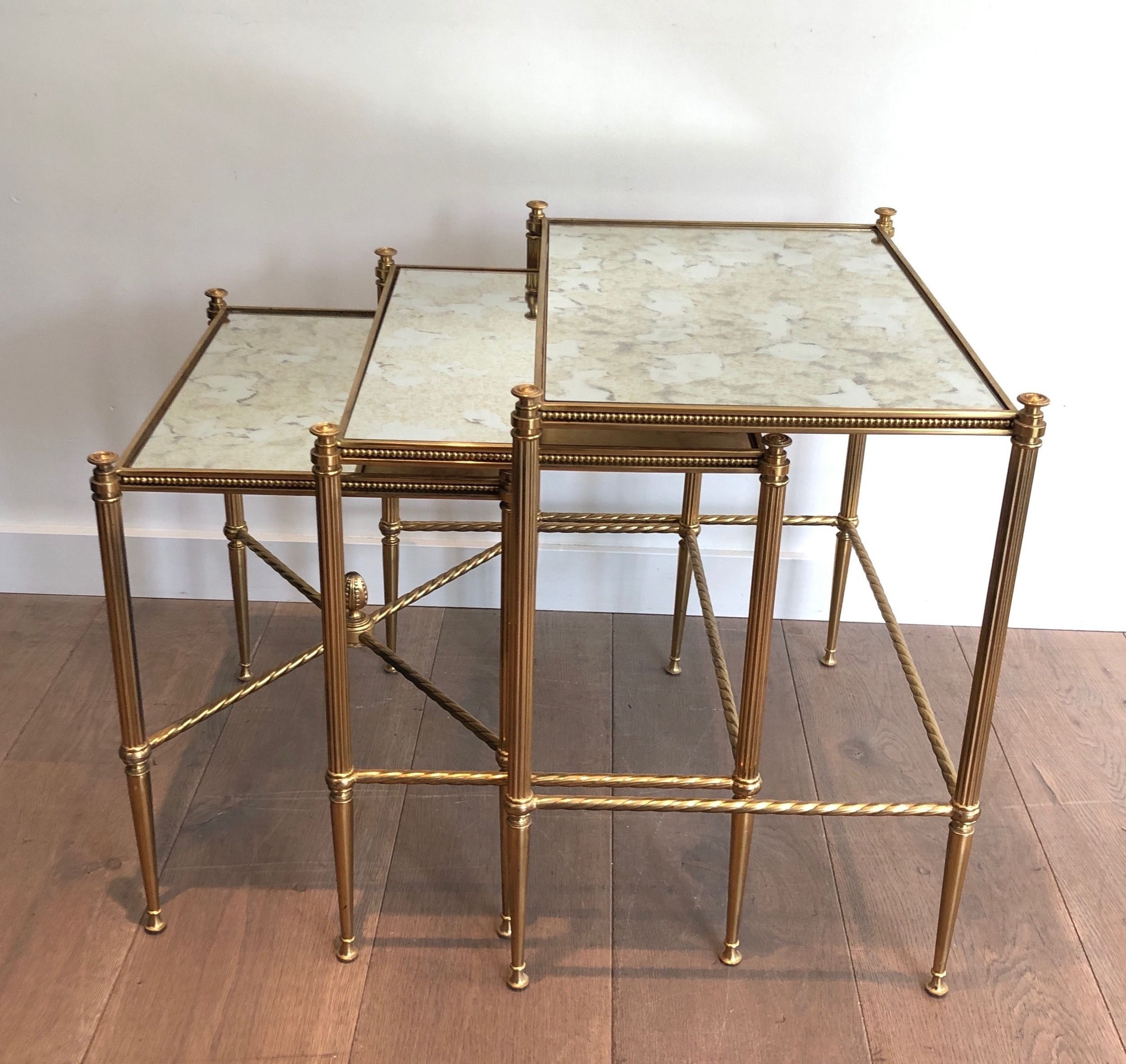 This distinguished set of three nesting tables presents structures in polished brass of neoclassical inspiration, their elegant proportions and refined metalwork creating a hierarchy of forms that nest perfectly together. Each table top is glazed with "faux antique" glass — glass specially treated to evoke the warm, subtly mottled surface of aged mirror or period glass — lending the tables a historical character and gentle luminosity far beyond their years. The combination of gleaming brass and softly lit antique-effect glass produces an effect of cultivated luxury, the whole composition recalling the finest French decorative production of the interwar period at its most accomplished.