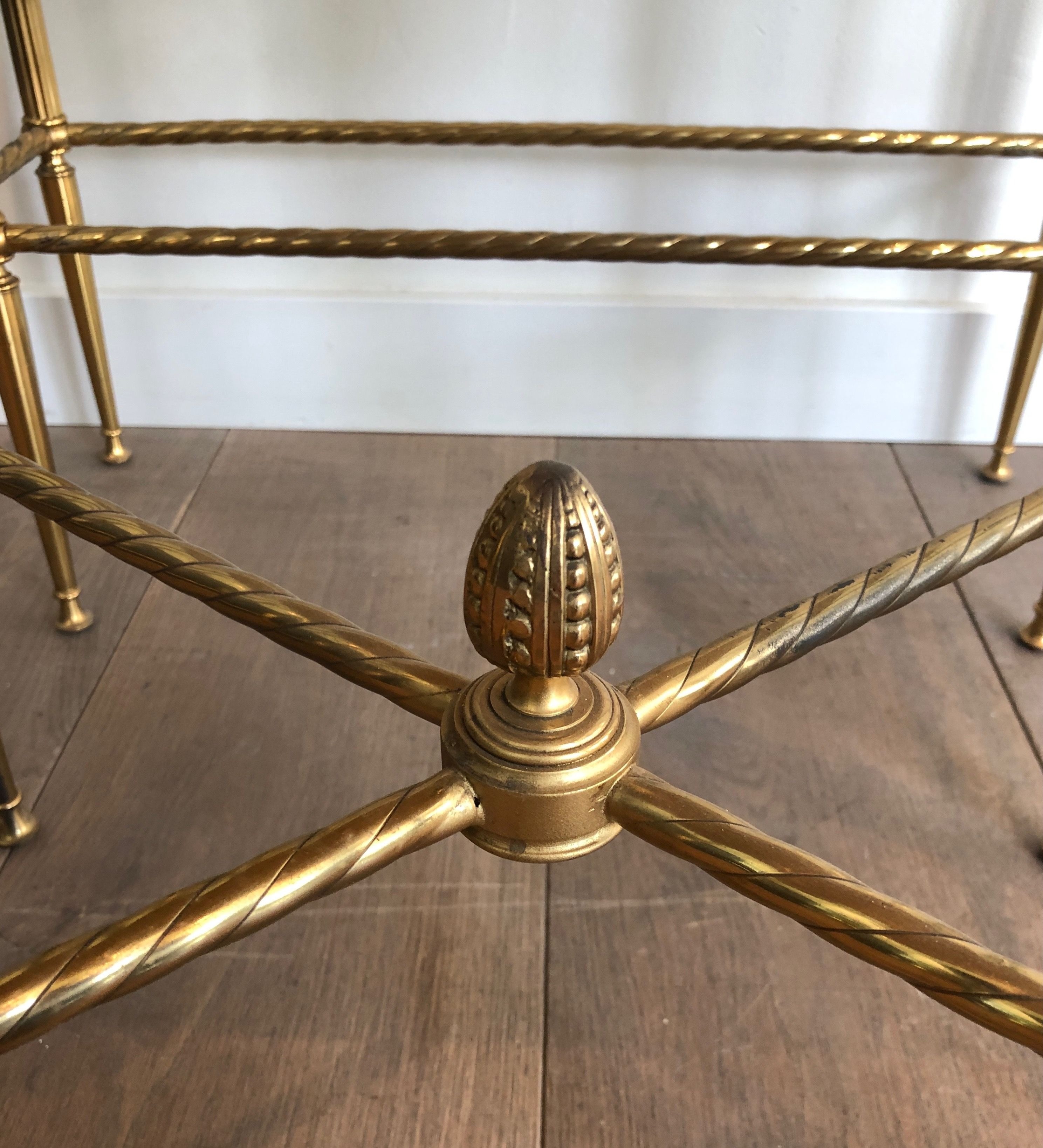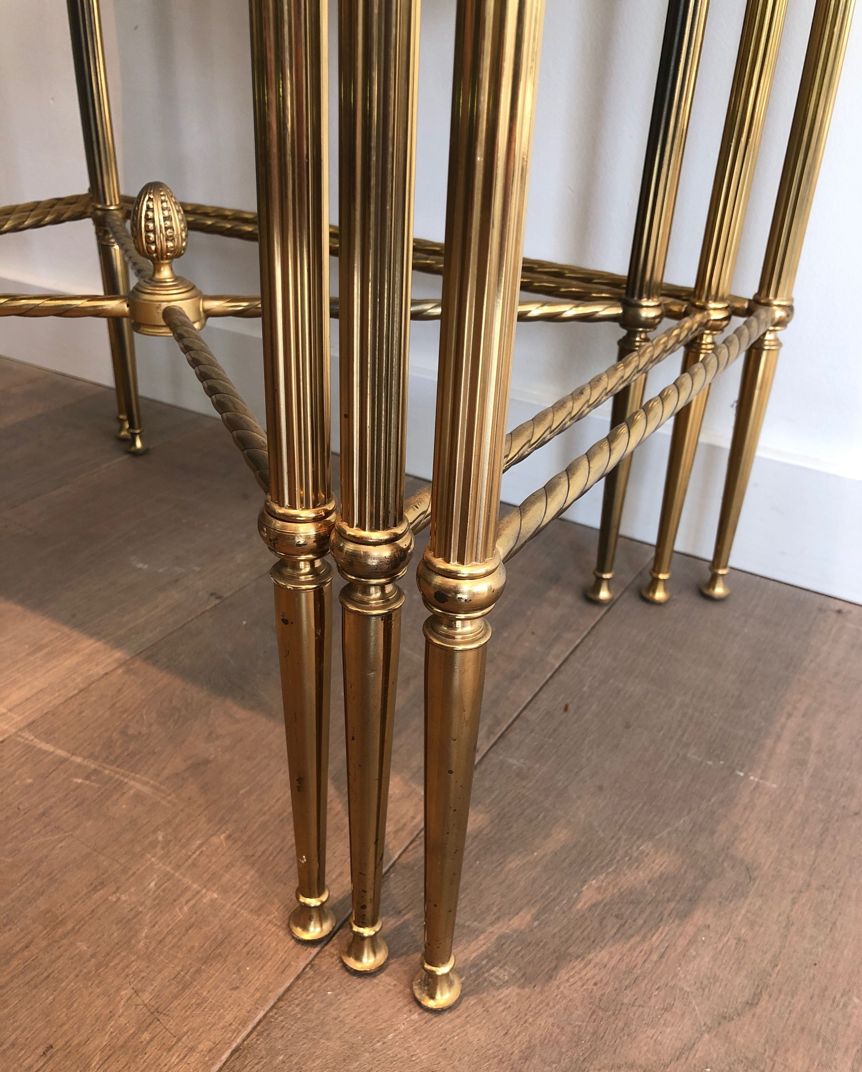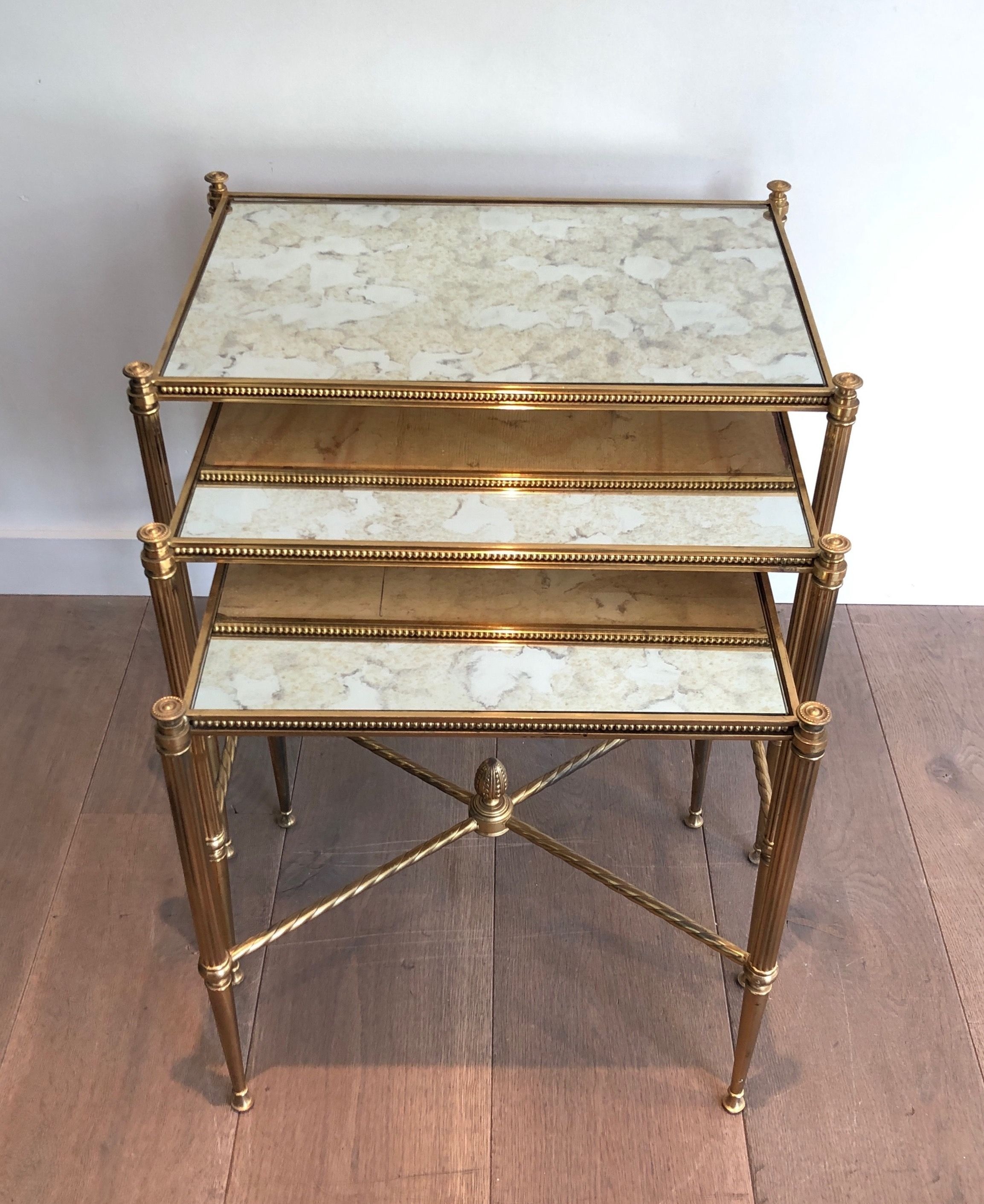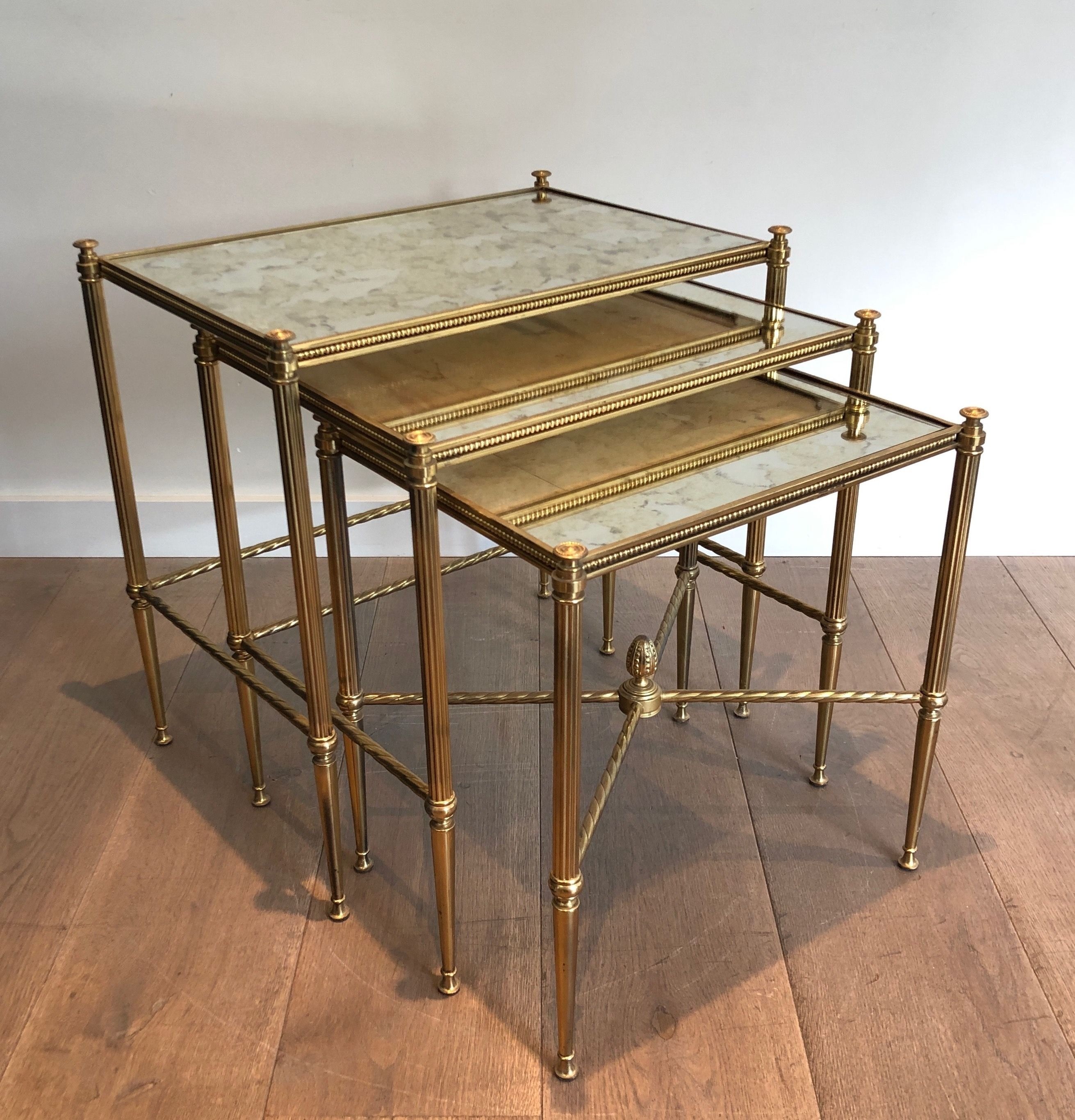 This distinguished set of three nesting tables presents structures in polished brass of neoclassical inspiration, their elegant proportions and refined metalwork creating a hierarchy of forms that nest perfectly together. Each table top is glazed with "faux antique" glass — glass specially treated to evoke the warm, subtly mottled surface of aged mirror or period glass — lending the tables a historical character and gentle luminosity far beyond their years. The combination of gleaming brass and softly lit antique-effect glass produces an effect of cultivated luxury, the whole composition recalling the finest French decorative production of the interwar period at its most accomplished.
