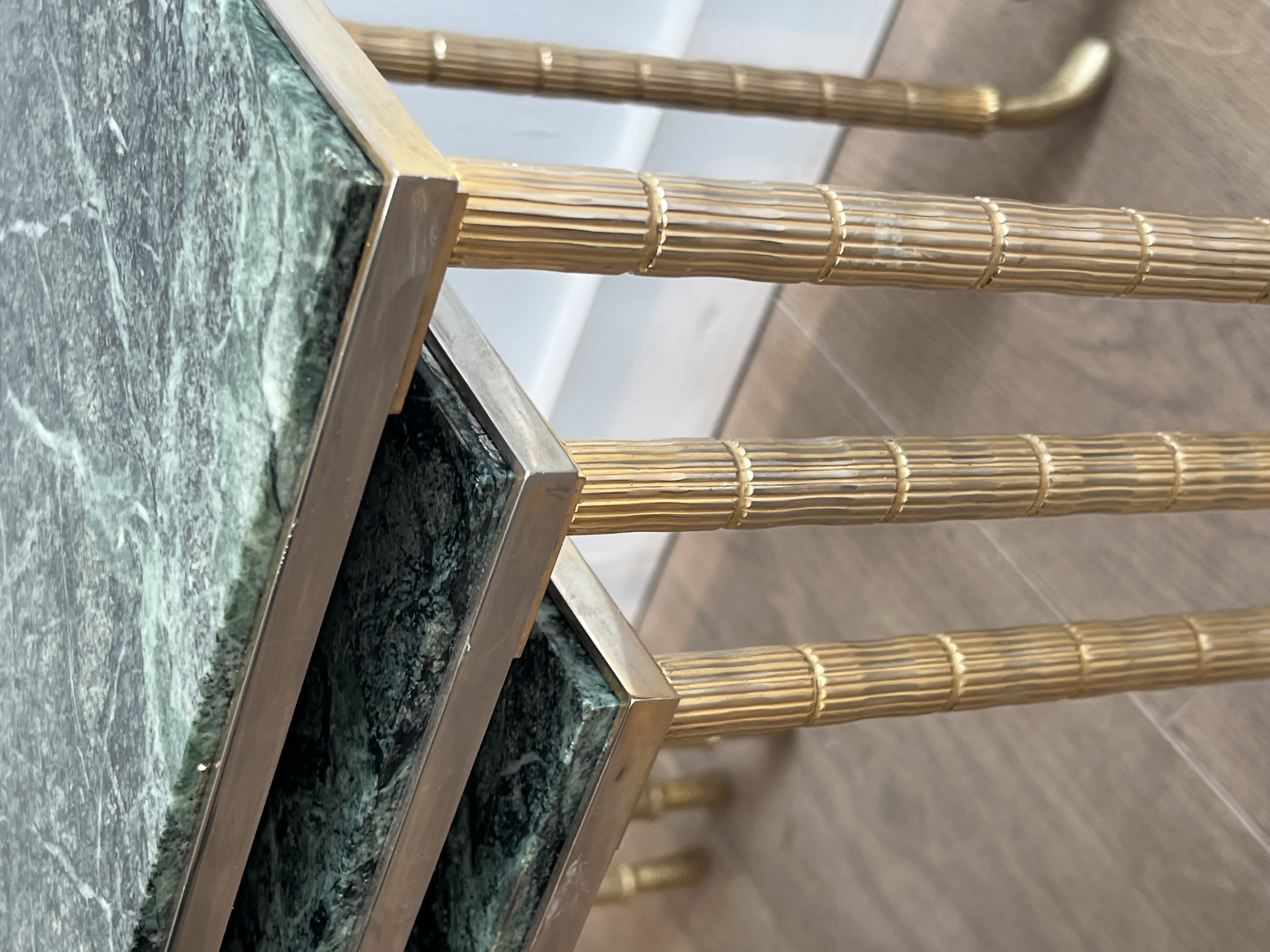 The association of nickel-plated and gold-plated metal constitutes one of the most characteristic aesthetic signatures of Maison Jansen: the silvery coolness of nickel contrasts with the warmth of the gilded metal, creating a subtle and sophisticated chromatic dialogue. The Verde Alpi marble tops, with their deep green tones and characteristic white veining, complete the composition by adding the mineral dimension proper to the finest creations of the house.