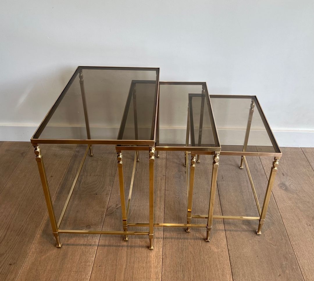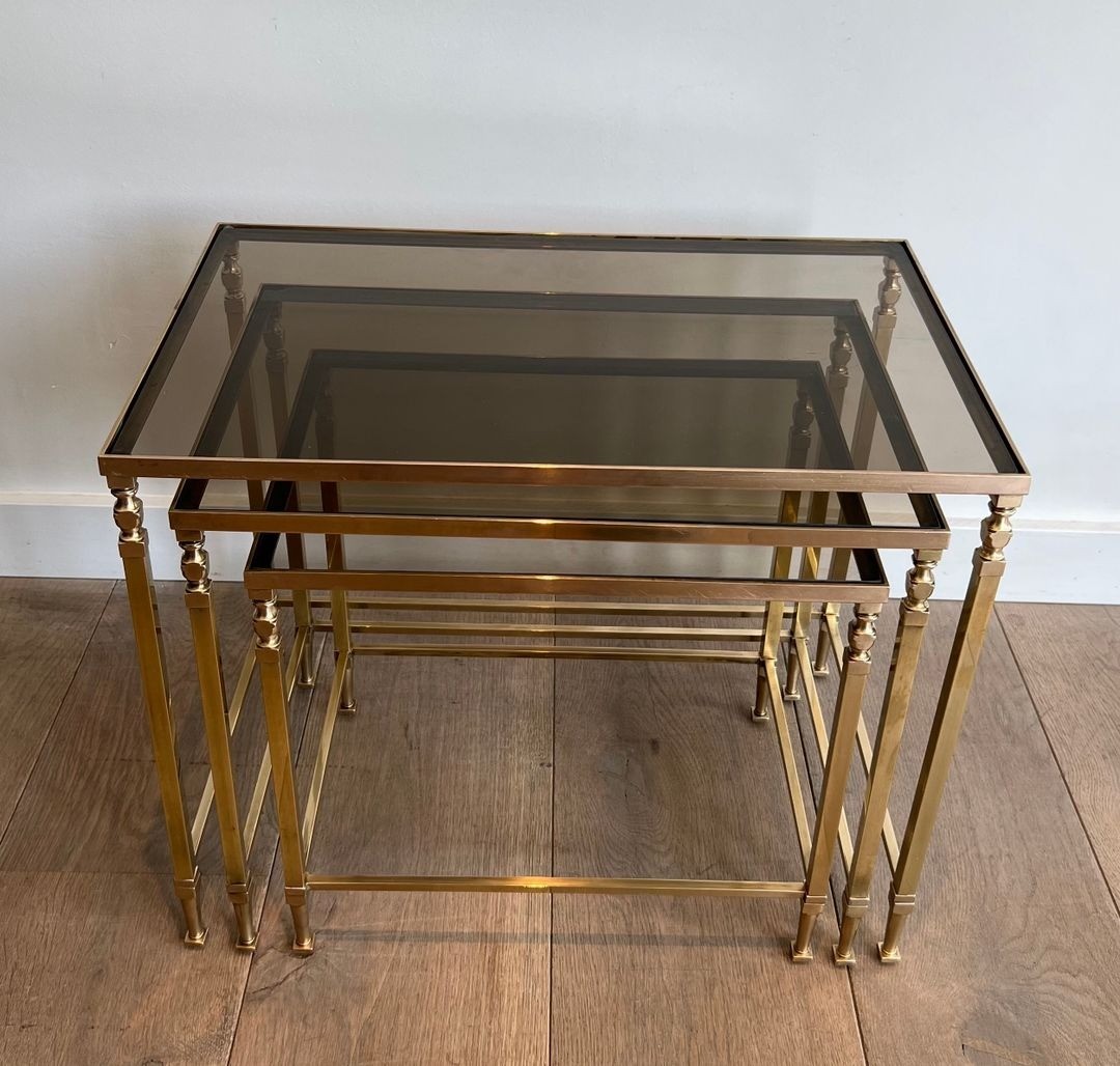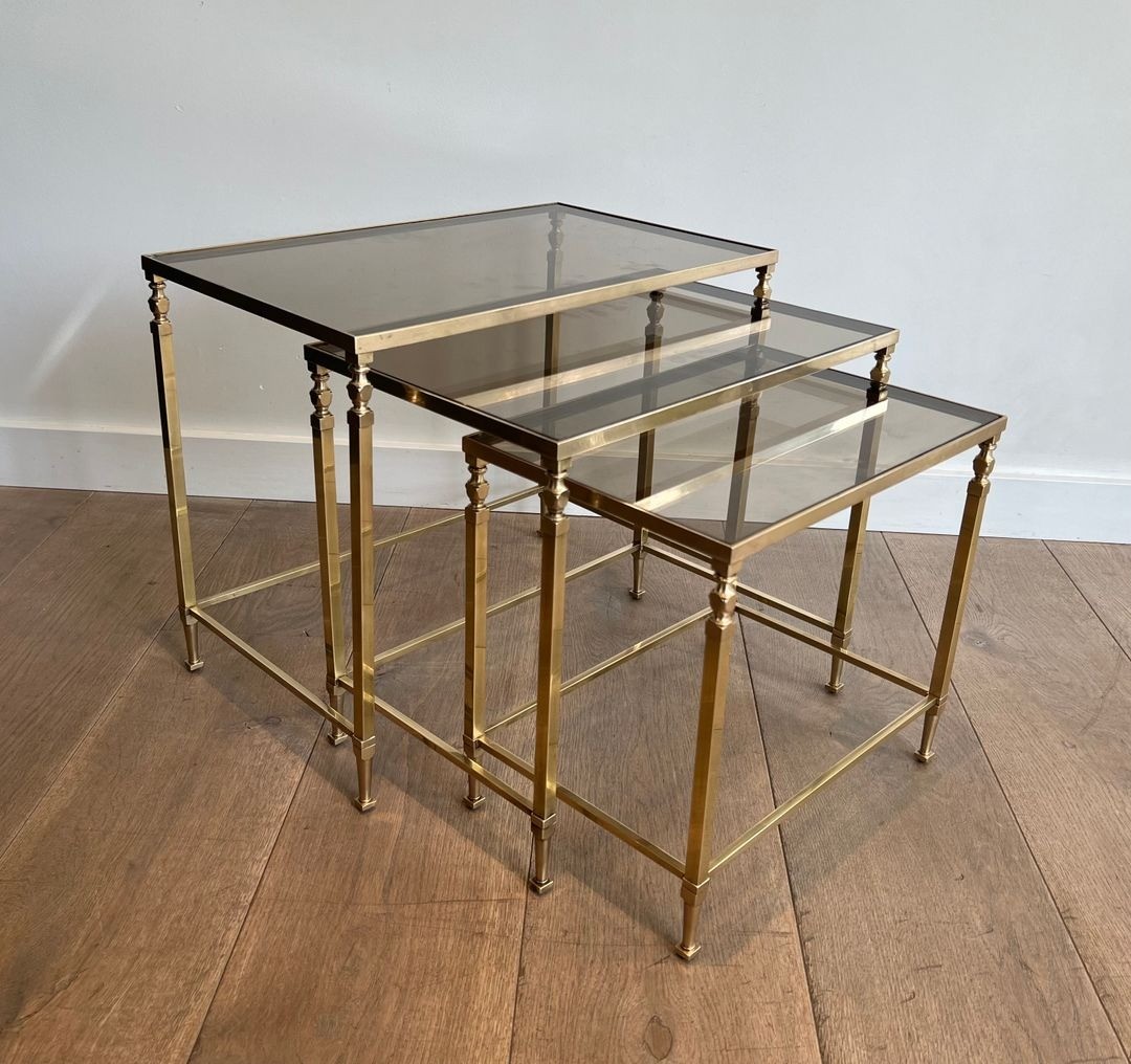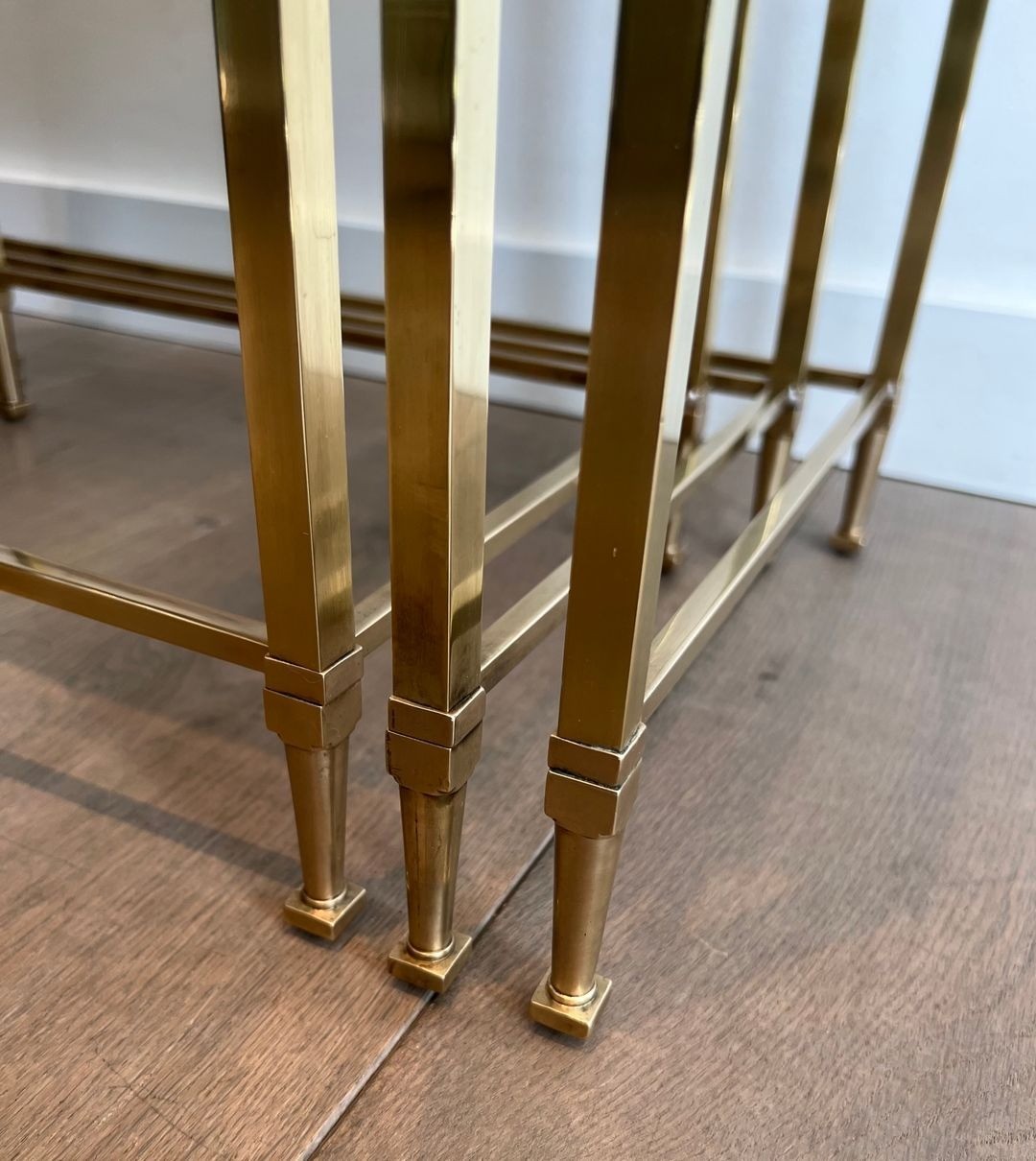 Maison Ramsay was among the most distinguished French decorating firms of the interwar period, celebrated for furniture that reinterpreted the neoclassical vocabulary with exceptional refinement and a confident use of brass and gilt metal. This set of nesting tables, dating to circa 1935, exemplifies the firm’s characteristic precision: each table constructed entirely in brass, with slender turned legs and crisp stretchers evoking the formal language of the Directoire and Empire periods.